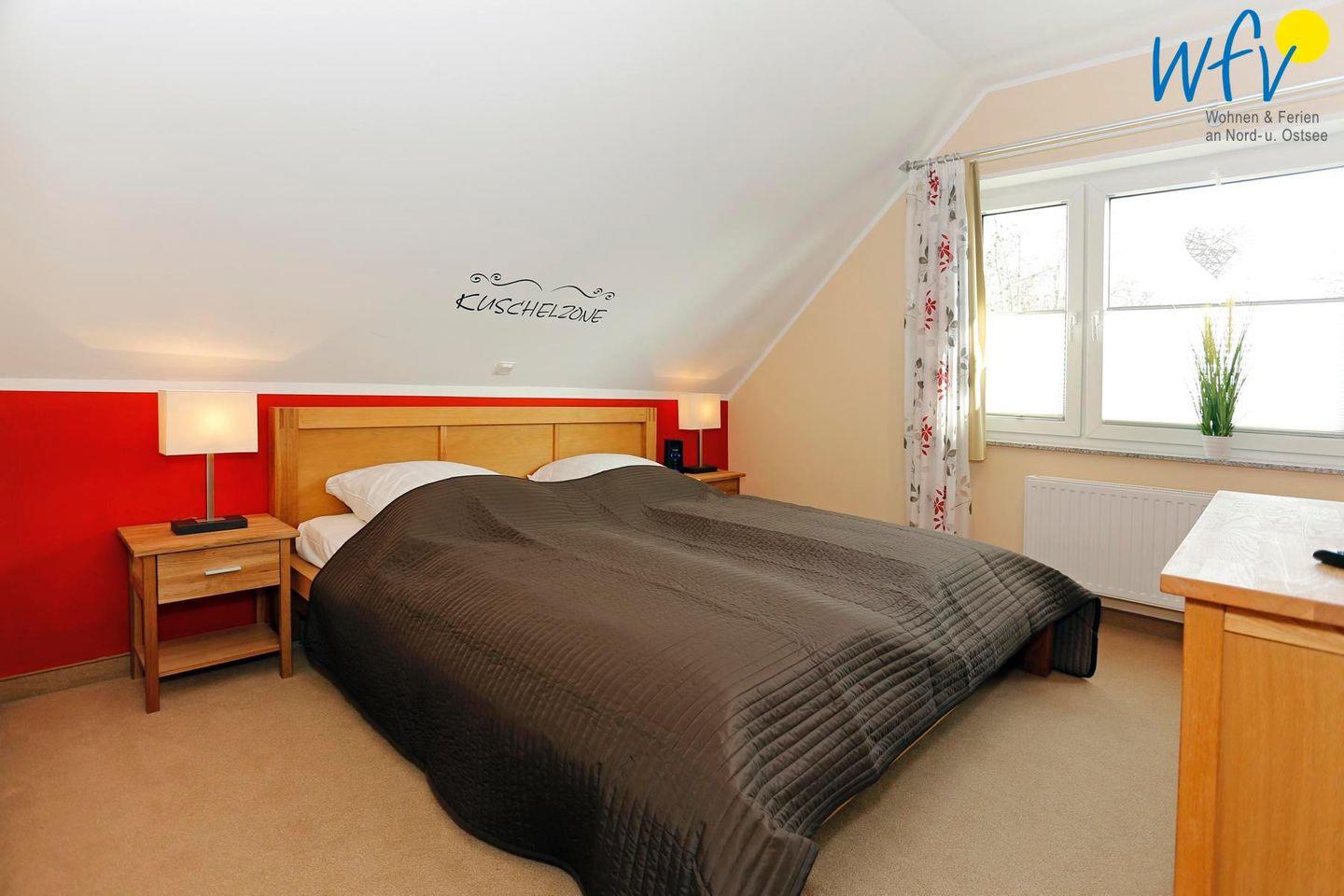Das separate Schlafzimmer der Borkumer Ferienwohnung ist mit einem bequemen Doppelbett, einer Kommode und einem Kleiderschrank ausgestattet. Ein Fernseher ermöglicht gemütliches Programm in den Abendstunden. Das Schlafzimmer befindet sich in der 1. Etage und kann nur über eine Treppe erreicht werden.
