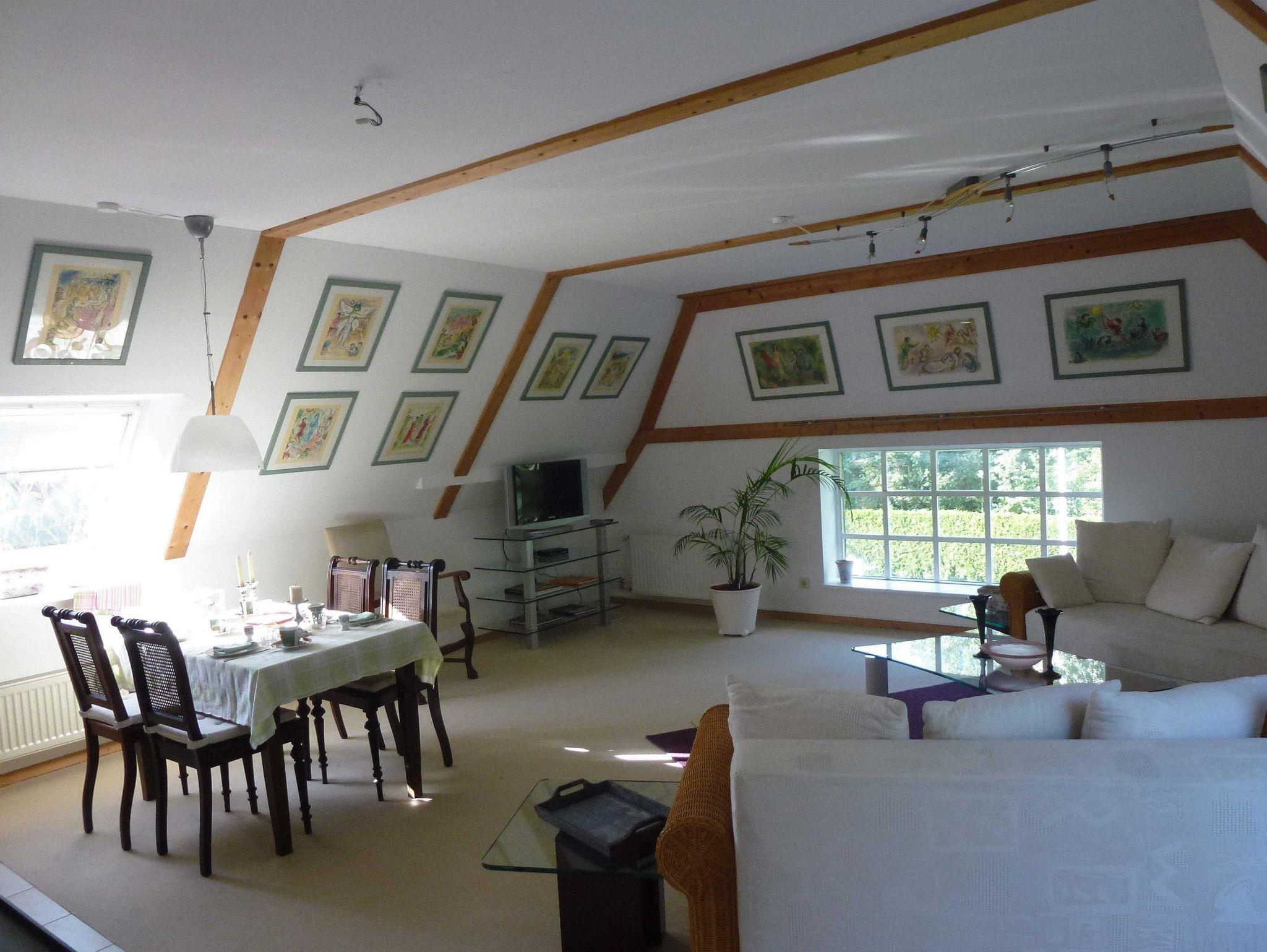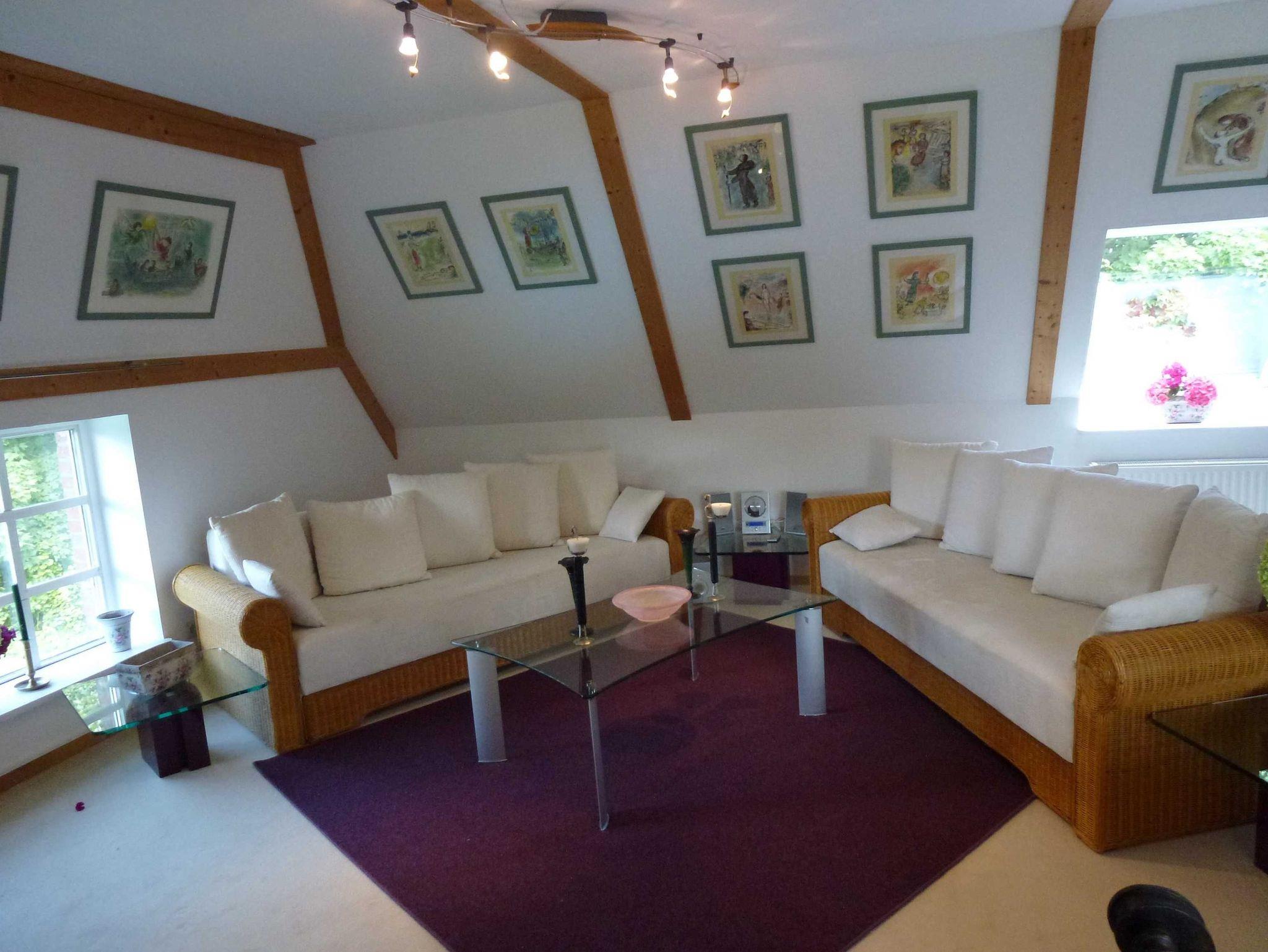 Die Ferienwohnung Marc Chagall ist mit vielen Nachdrucken seiner berühmten Gemälde dekoriert und liegt im Dachgeschoß des Gutshauses. Sie verfügt über ein Schlafzimmer, ein großes Ess- und Wohnzimmer, eine offene Küche und bietet Platz für 2+2 Personen.