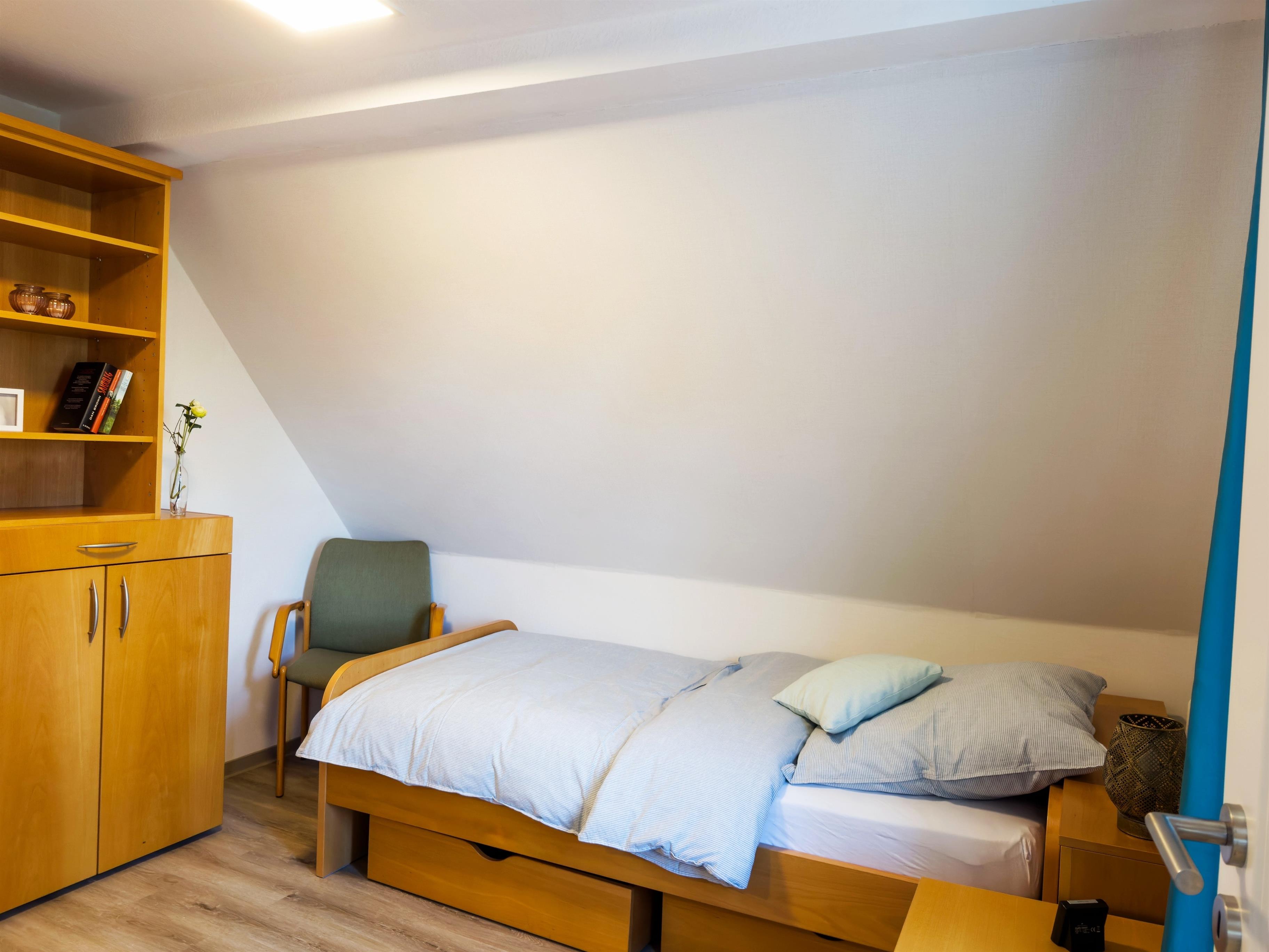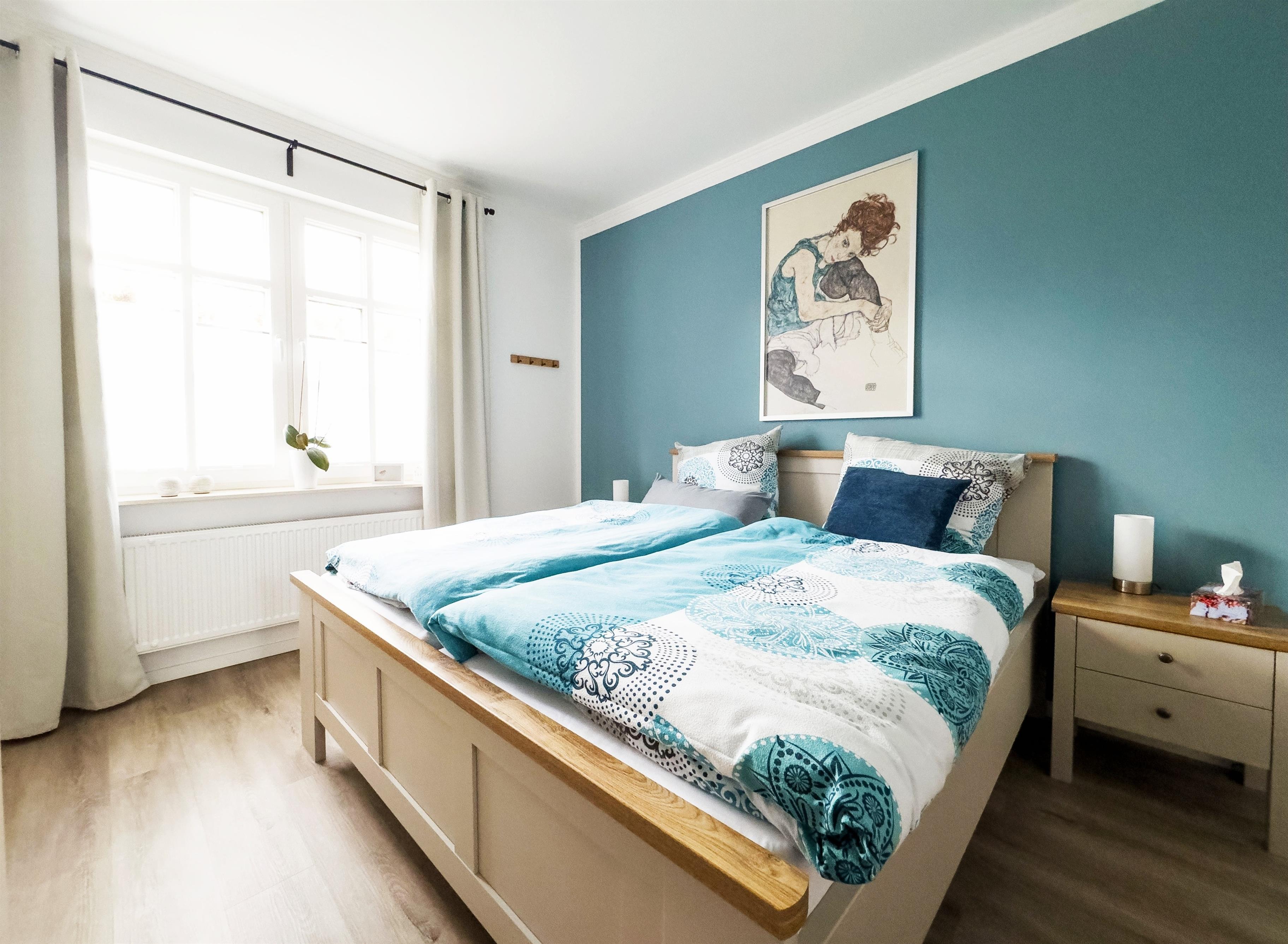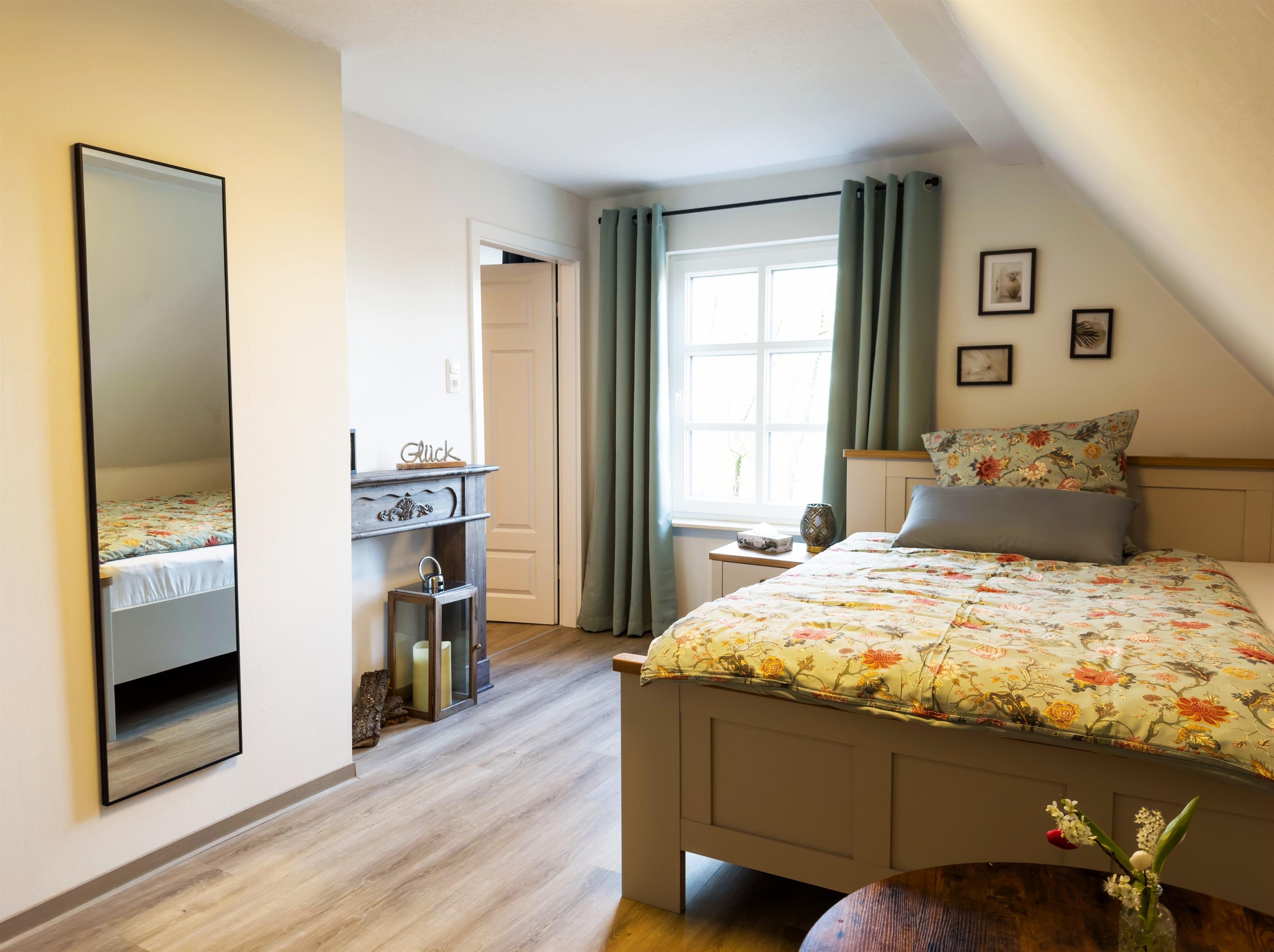 Unsere großzügige Ferienwohnung mit ca. 90 qm bietet Platz für bis zu 5 Personen – perfekt für Familien oder kleine Gruppen, die gemeinsam die Natur und die Ruhe der Region genießen möchten. Die drei Schlafzimmer sind gemütlich und komfortabel eingerichtet: Im Erdgeschoss befindet sich ein Schlafzimmer mit einem bequemen Doppelbett (180x200). Im ersten Obergeschoss finden Sie ein weiteres Doppelbett (160x200) (Durhcgangszimmer zum Einzelzimmer) separates Einzelzimmer (90x200), das für erholsame Nächte sorgt.