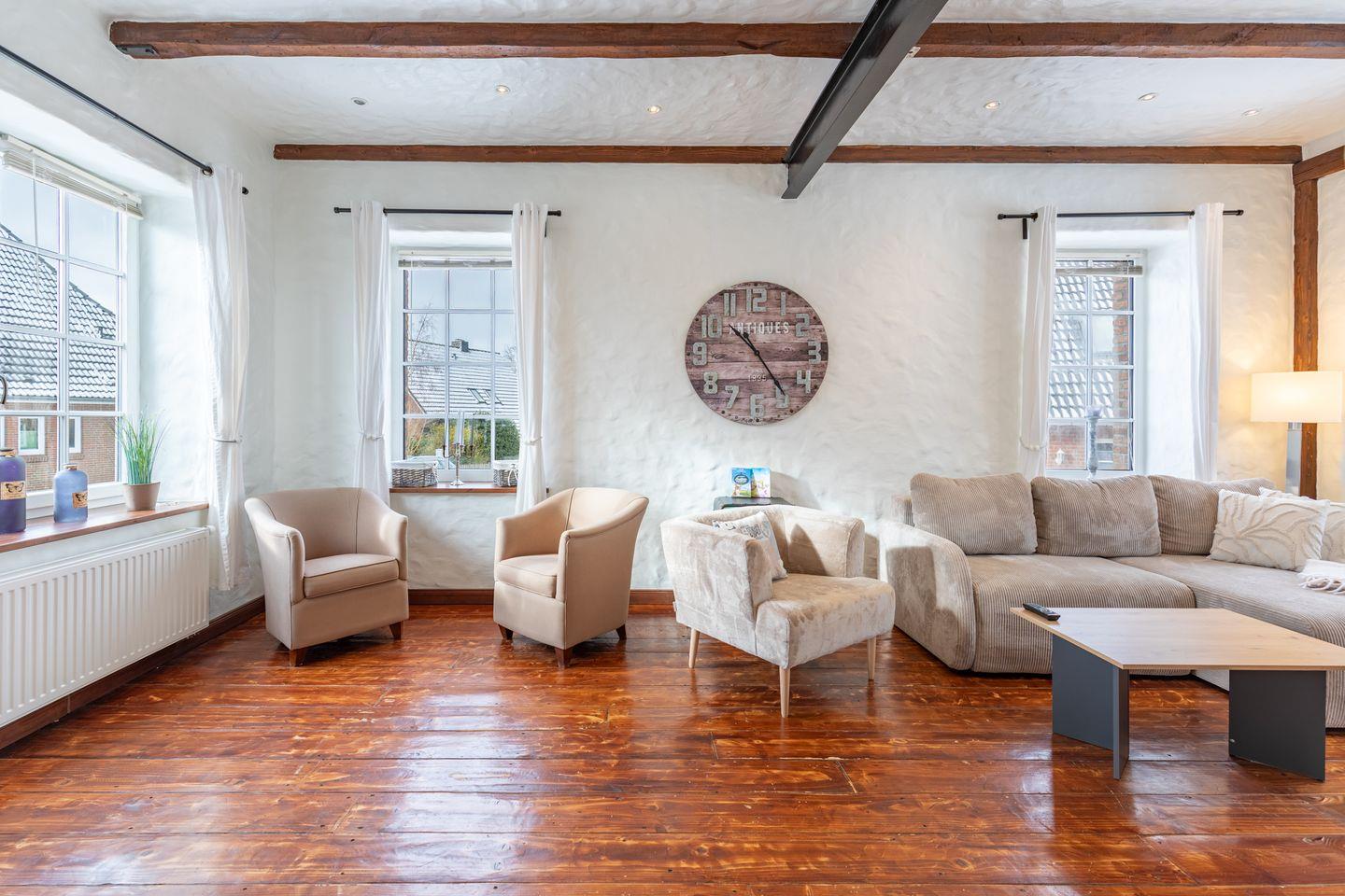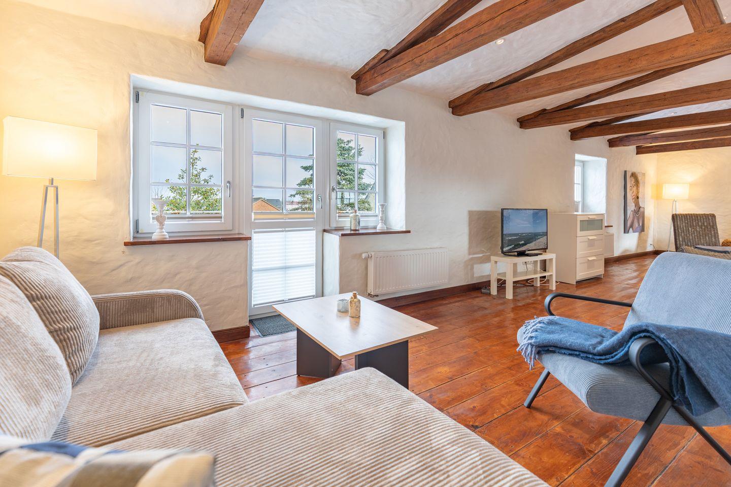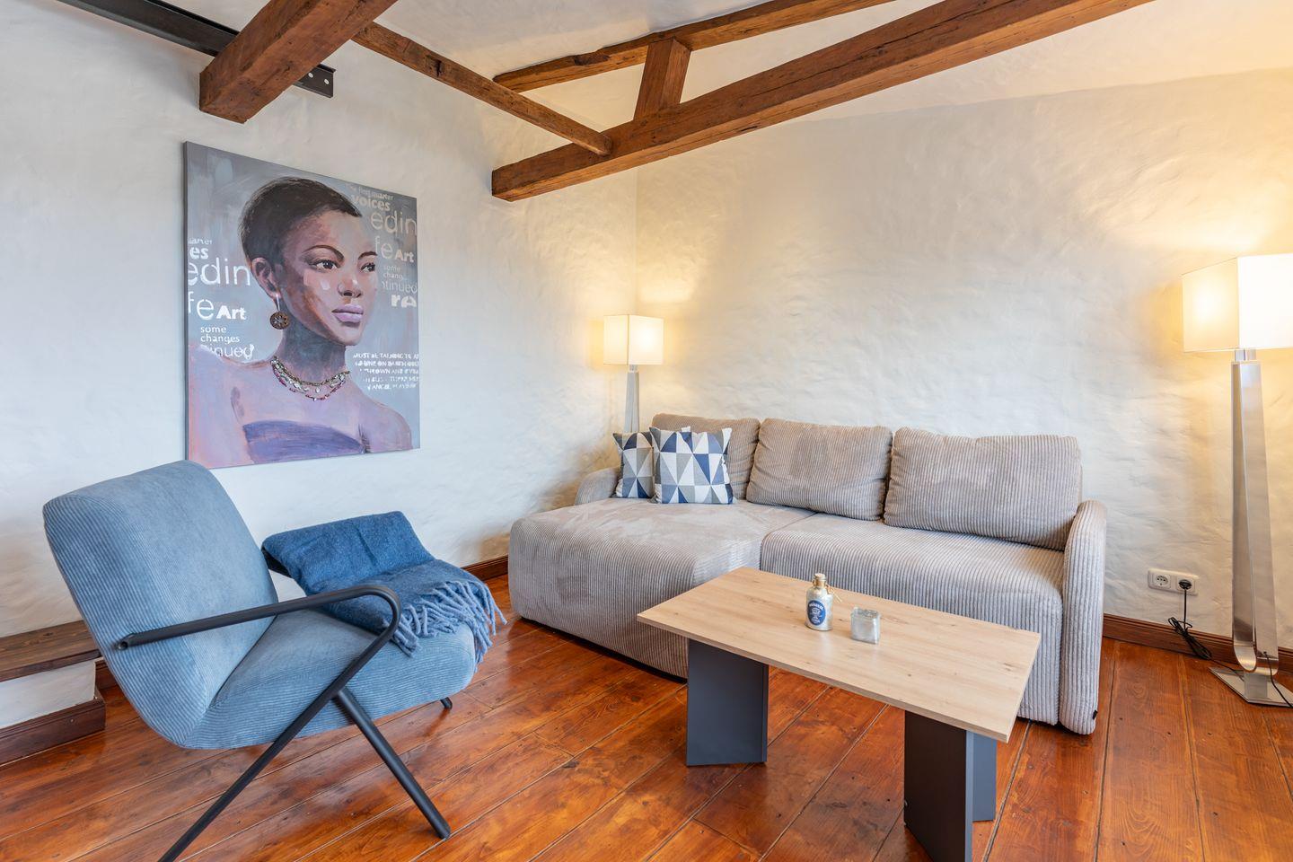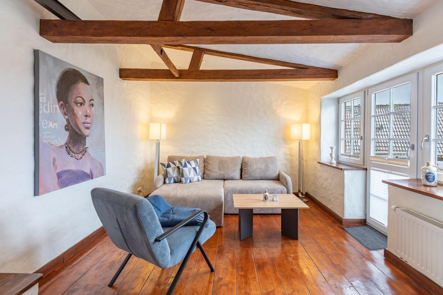 Die stilvoll eingerichtete Ferienwohnung ist 120 qm groß und bietet ein geräumiges Wohnzimmer mit Flachbild-TV (SAT). Die Küche mit dem großen Esstisch ist mit einem Herd (Ceranfeld), Backofen, Geschirrspülmaschine und Kühlschrank ausgestattet. Das Apartment verfügt im Erdgeschoss über ein Schlafzimmer mit einem Doppelbett (180 × 200) und ein Duschbad. Das großzügige, offene Obergeschoss bietet Ihnen einen gemütlichen Rückzugsort mit Sofaecke und TV sowie einen kleinen Balkon. Auf einem Boxspringbett (180 x 200) können Sie es sich so richtig bequem machen. Das moderne Wannenbad sorgt für Ihr Wohlbehagen nach einem langen Tagesausflug. Zur Wohnung gehört ein schöner Garten mit Terrasse, Gartenmöbeln und einem Grill.