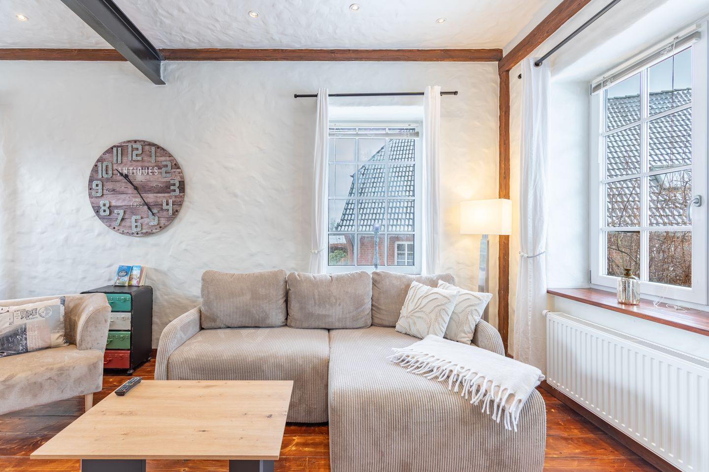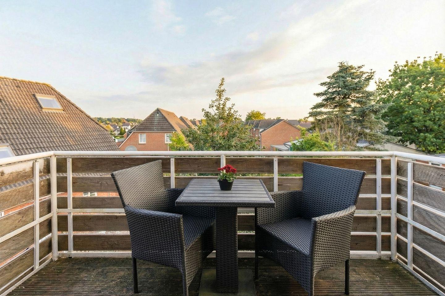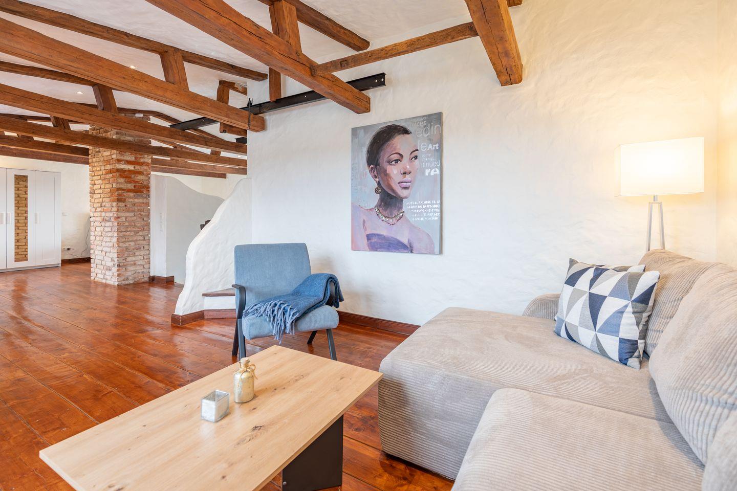 Die stilvoll eingerichtete Ferienwohnung ist 120 qm groß und bietet ein geräumiges Wohnzimmer mit Flachbild-TV (SAT). Die Küche mit dem großen Esstisch ist mit einem Herd (Ceranfeld), Backofen, Geschirrspülmaschine und Kühlschrank ausgestattet. Das Apartment verfügt im Erdgeschoss über ein Schlafzimmer mit einem Doppelbett (180 × 200) und ein Duschbad. Das großzügige, offene Obergeschoss bietet Ihnen einen gemütlichen Rückzugsort mit Sofaecke und TV sowie einen kleinen Balkon. Auf einem Boxspringbett (180 x 200) können Sie es sich so richtig bequem machen. Das moderne Wannenbad sorgt für Ihr Wohlbehagen nach einem langen Tagesausflug. Zur Wohnung gehört ein schöner Garten mit Terrasse, Gartenmöbeln und einem Grill.