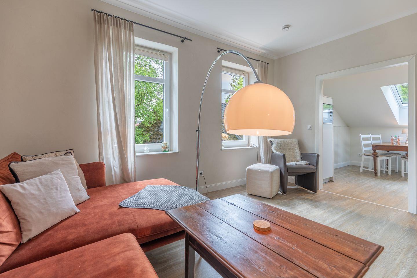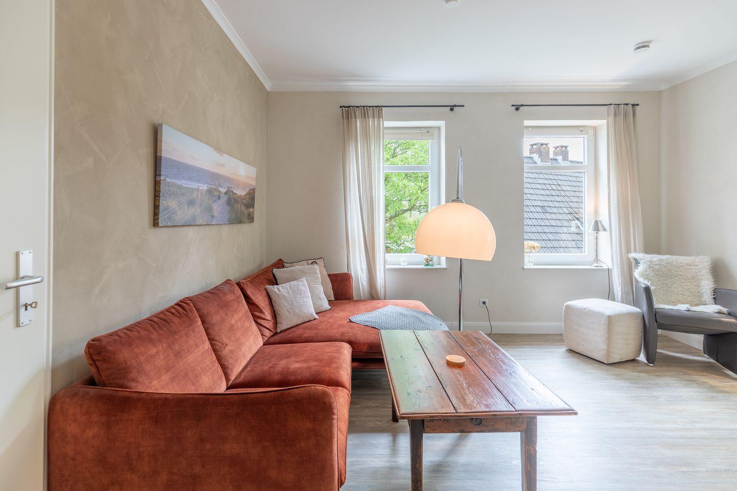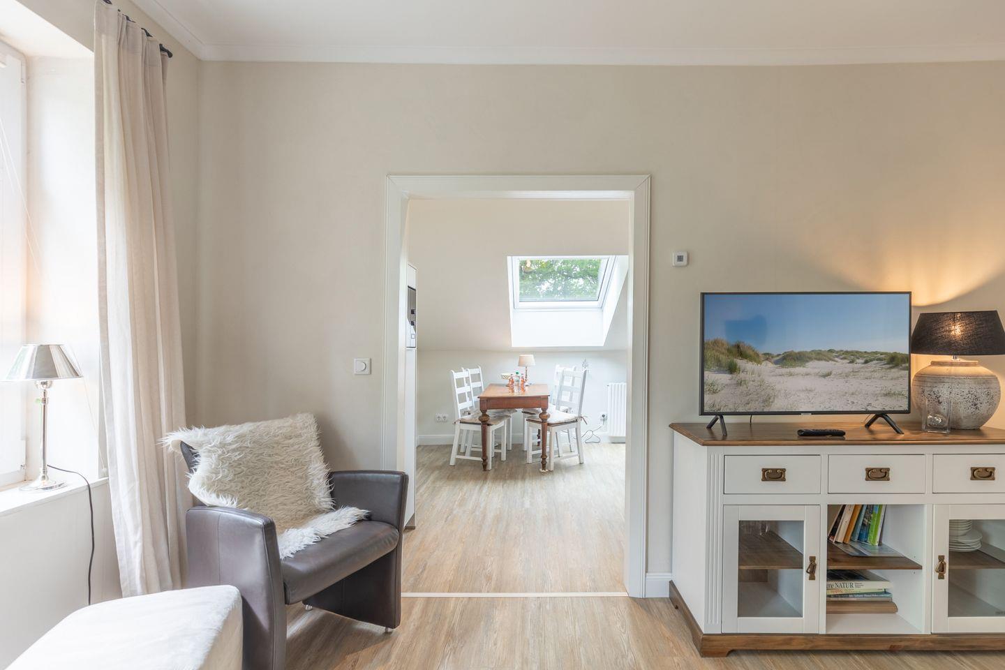 Die stilvoll und modern eingerichtete Ferienwohnung ist 54 qm groß und bietet ein geräumiges Wohnzimmer mit Flachbild-TV (SAT). Die Küche mit dem Esstisch ist mit einem Herd (Ceranfeld), Backofen, Mikrowelle, Geschirrspülmaschine und Kühlschrank ausgestattet. Das Apartment bietet Ihnen ein schönes Schlafzimmer (180 x 200) und ein Duschbad.