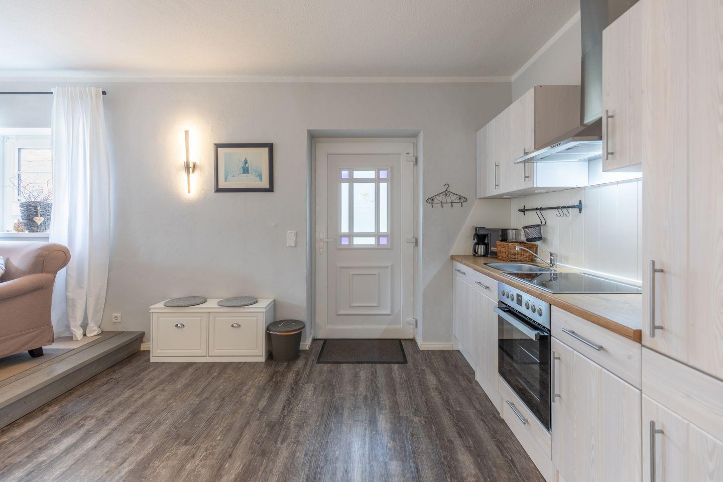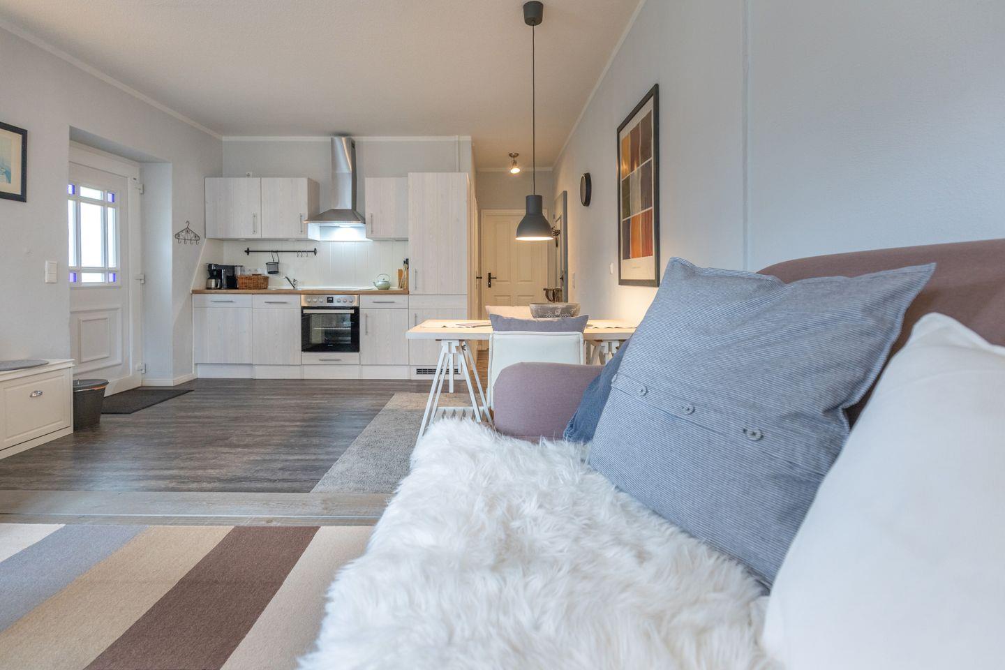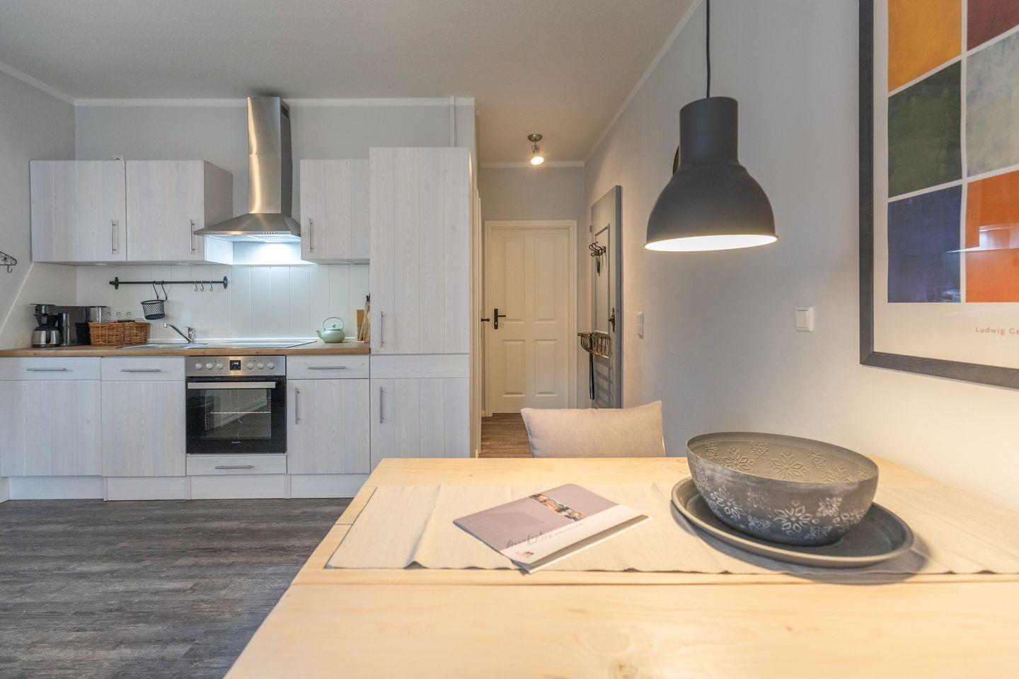 Die Ferienwohnung liegt im Erdgeschoss und bietet auf rund 50?m² ausreichend Platz für bis zu zwei Personen. Das stilvoll eingerichtete Wohnzimmer ist in warmen Farben gehalten und liebevoll dekoriert. Ein bequemes Sofa sowie ein Sessel schaffen eine wohnliche Atmosphäre. Ein moderner Flachbildfernseher sorgt für Unterhaltung. Die helle Küche verfügt über ein Cerankochfeld, einen Backofen, einen Kühlschrank und eine Dunstabzugshaube. Kaffeemaschine, Wasserkocher und verschiedene Küchenutensilien sind ebenfalls vorhanden. Ein Esstisch für zwei Personen ist in den Wohnbereich integriert.