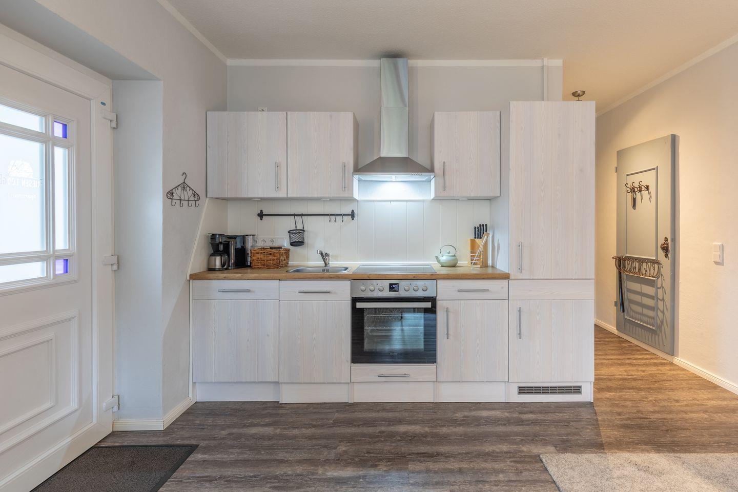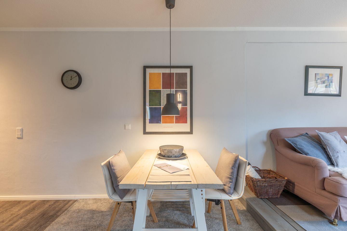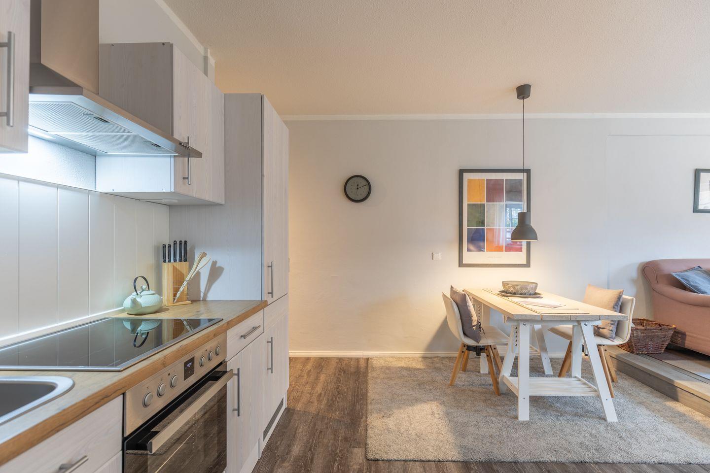 Die Ferienwohnung liegt im Erdgeschoss und bietet auf rund 50?m² ausreichend Platz für bis zu zwei Personen. Das stilvoll eingerichtete Wohnzimmer ist in warmen Farben gehalten und liebevoll dekoriert. Ein bequemes Sofa sowie ein Sessel schaffen eine wohnliche Atmosphäre. Ein moderner Flachbildfernseher sorgt für Unterhaltung. Die helle Küche verfügt über ein Cerankochfeld, einen Backofen, einen Kühlschrank und eine Dunstabzugshaube. Kaffeemaschine, Wasserkocher und verschiedene Küchenutensilien sind ebenfalls vorhanden. Ein Esstisch für zwei Personen ist in den Wohnbereich integriert.