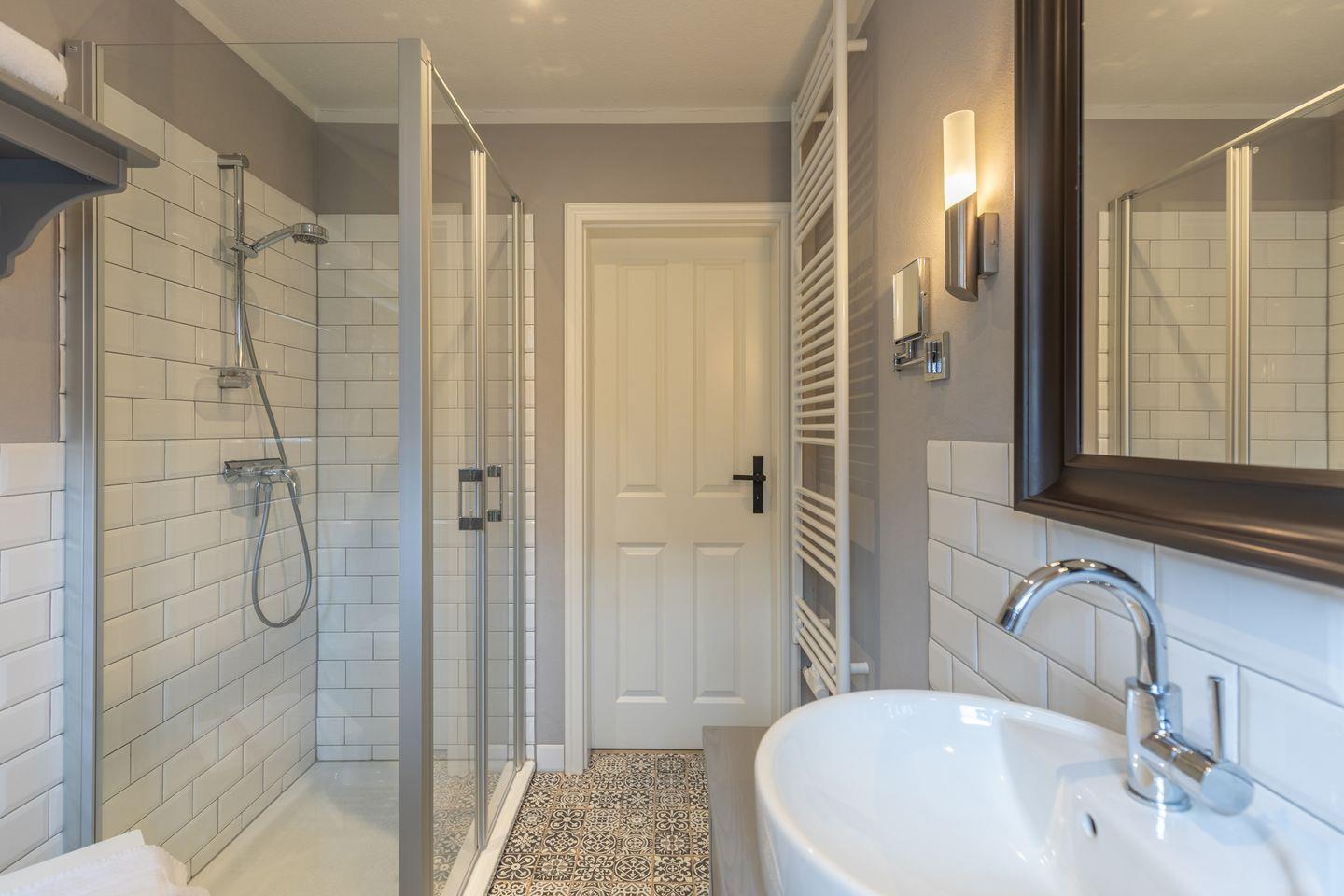 Das modern gestaltete Badezimmer verfügt über eine bodentiefe Dusche mit Glasabtrennung, ein stilvolles Waschbecken mit Unterschrank und einen großen Spiegel mit seitlicher Beleuchtung.
