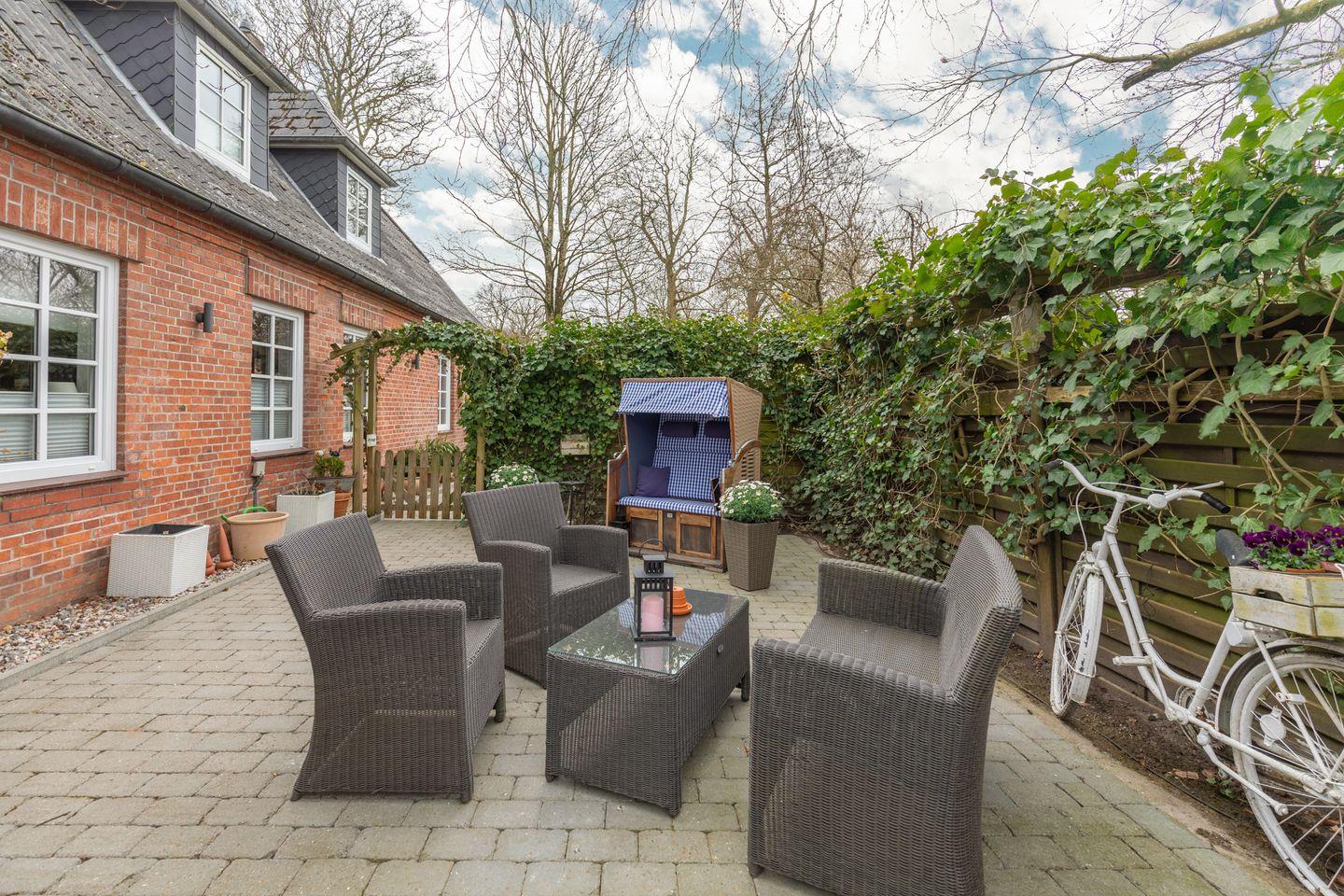 Der gepflegte Außenbereich steht allen Gästen der Friesen Lodge zur gemeinschaftlichen Nutzung zur Verfügung. Mehrere Strandkörbe auf dem weitläufigen Grundstück laden zum Verweilen ein. Auf der gepflasterten Terrasse mit Gartenmöbeln lässt sich der Tag entspannt ausklingen.