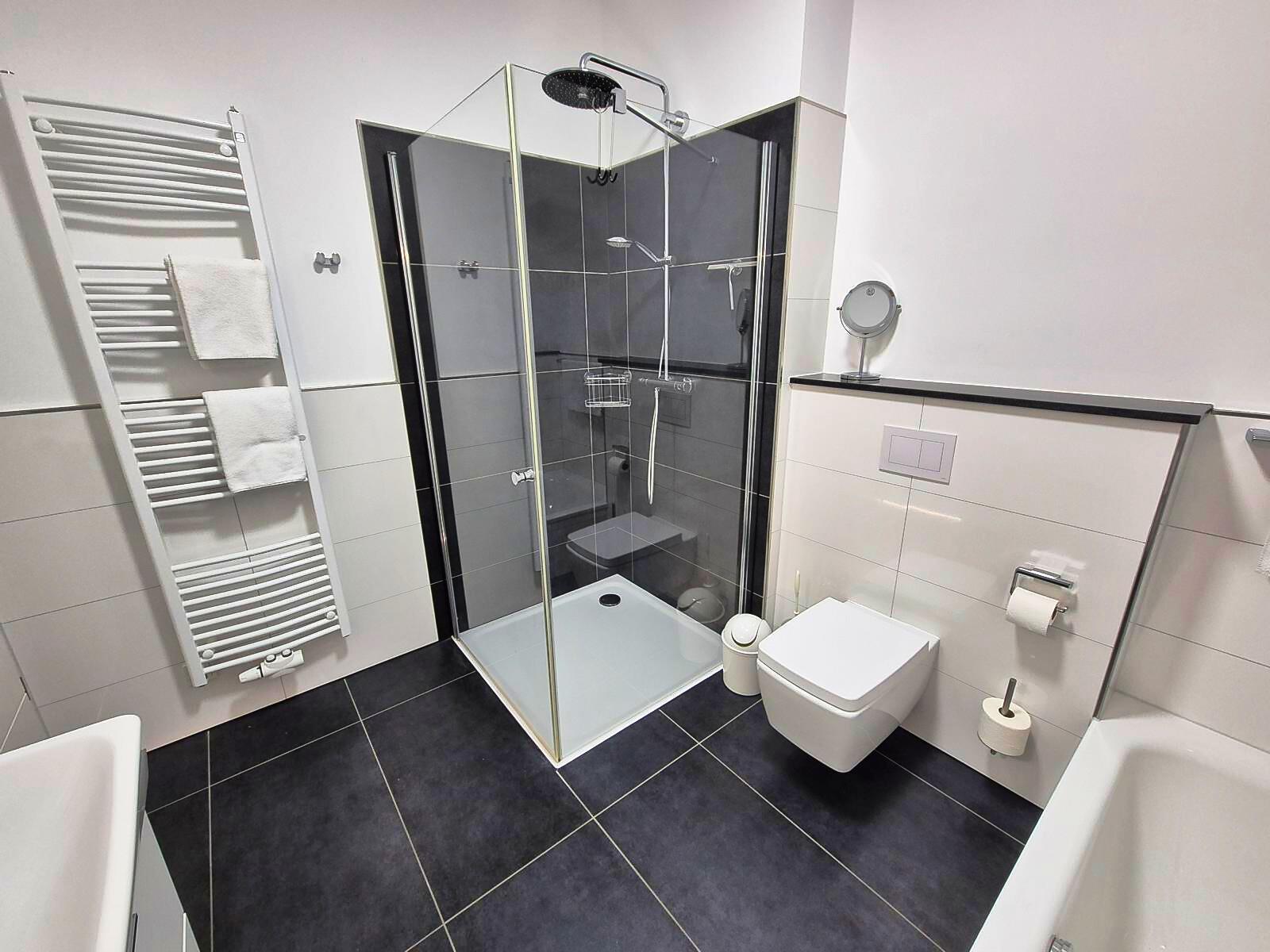 Das moderne Bad überzeugt mit einer bodengleichen Dusche, während ein zusätzliches Gäste-WC weiteren Komfort bietet.