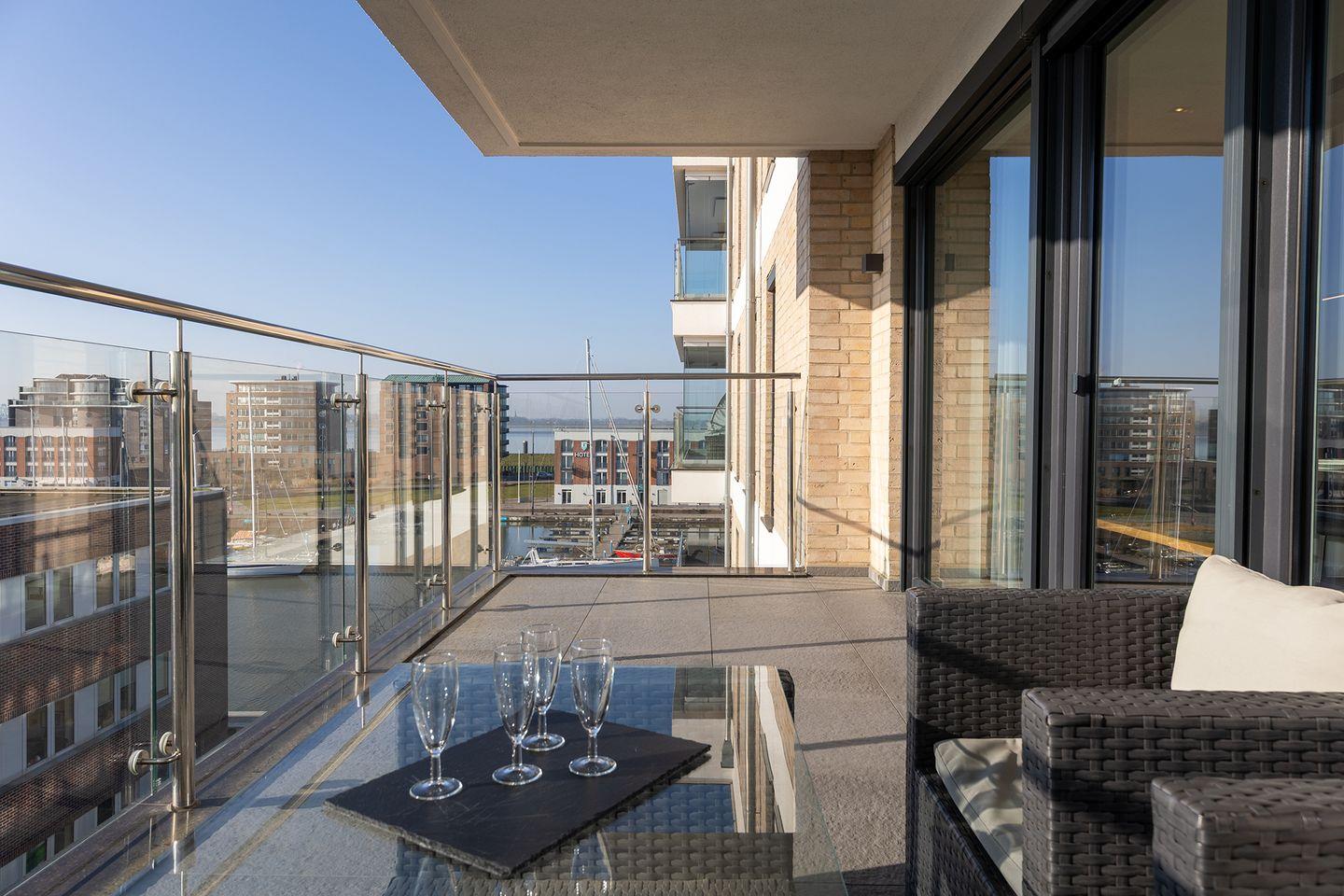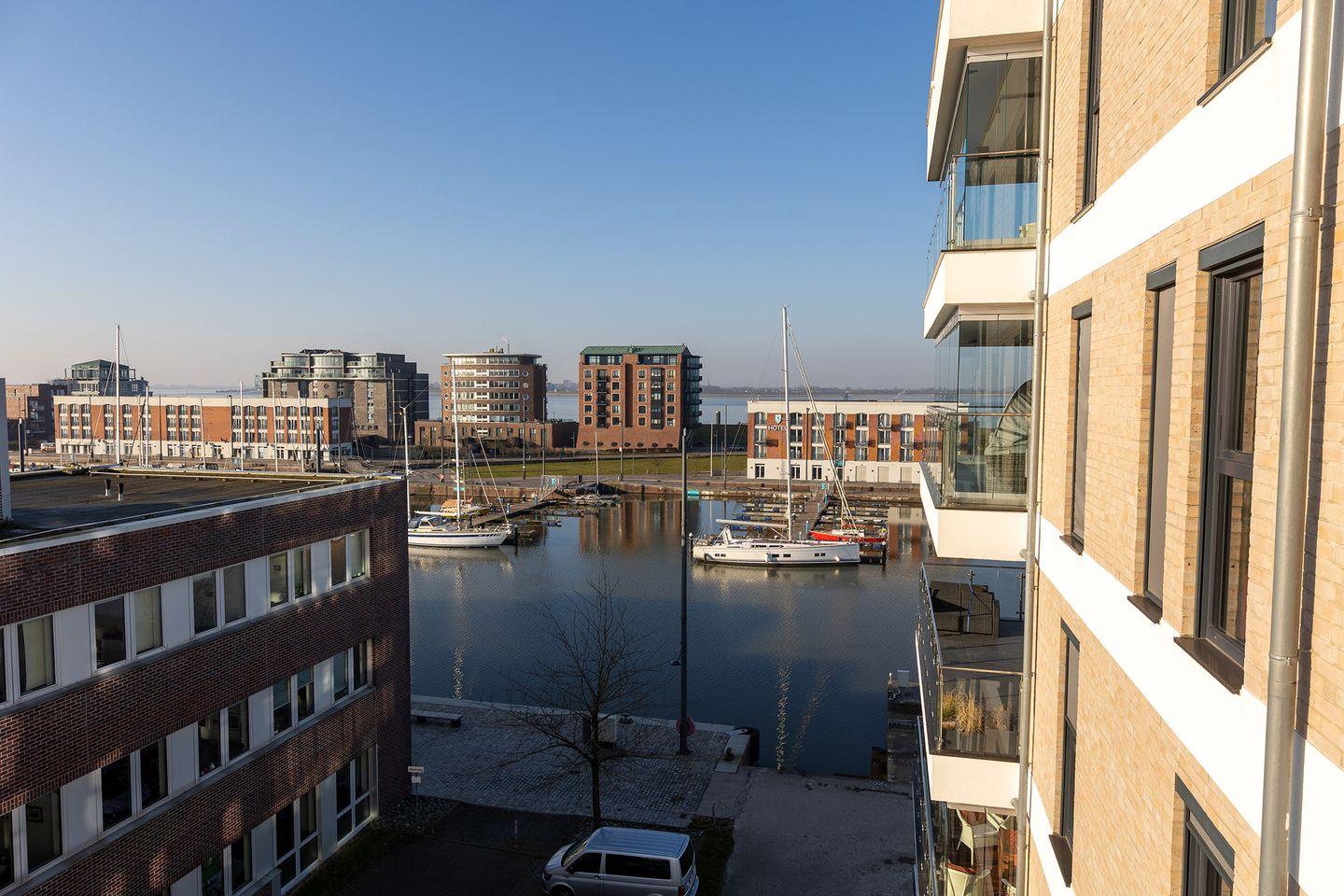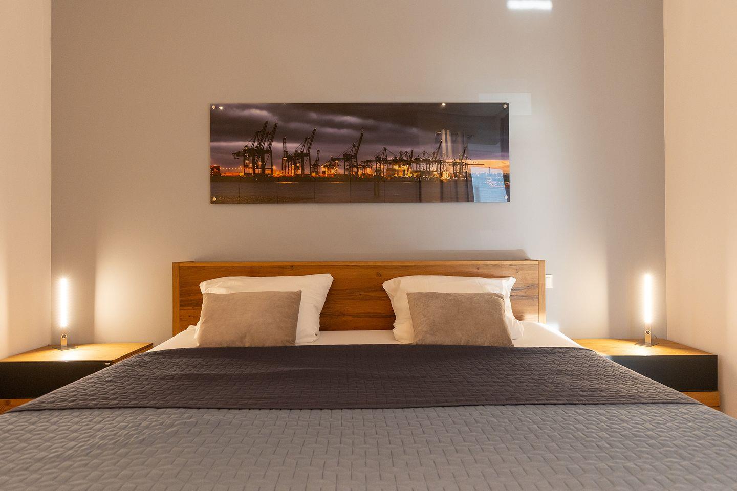 Moderne Ferienwohnung in Bremerhavens Havenwelten mit Blick auf den Yachthafen und stilvoller Ausstattung.