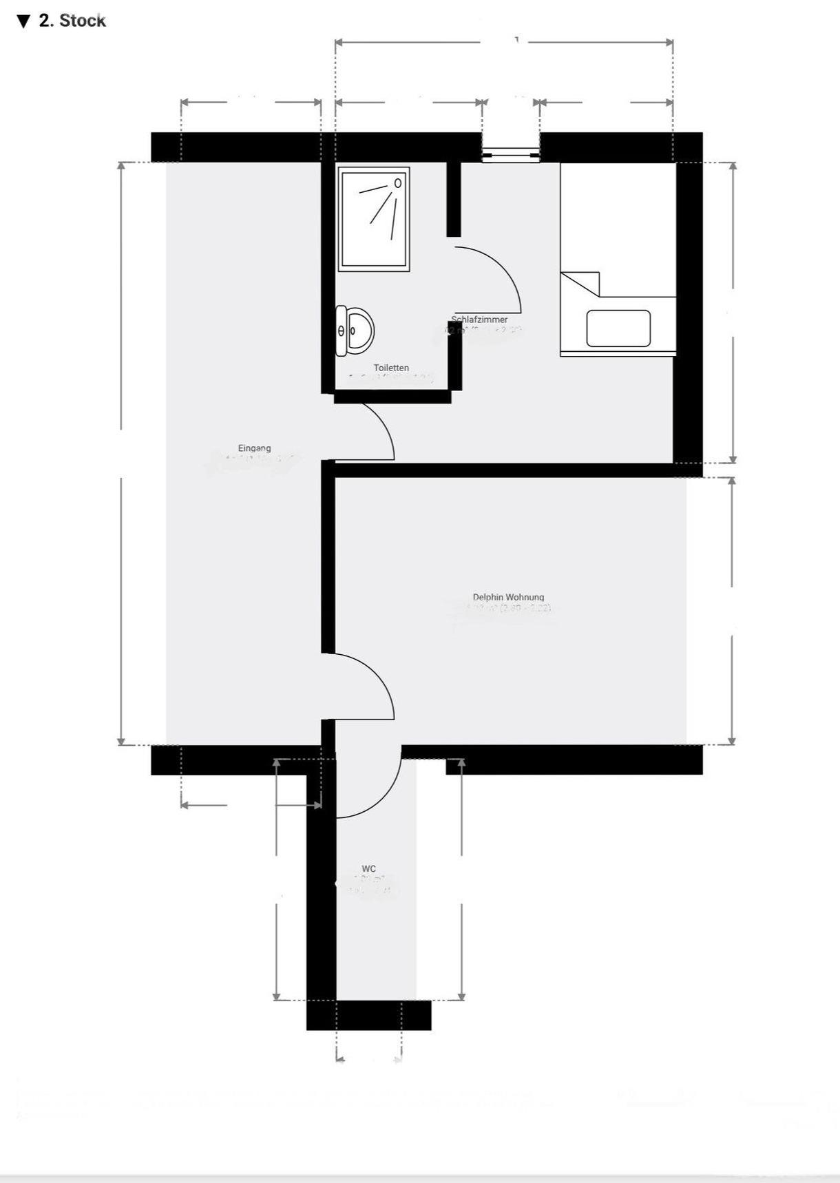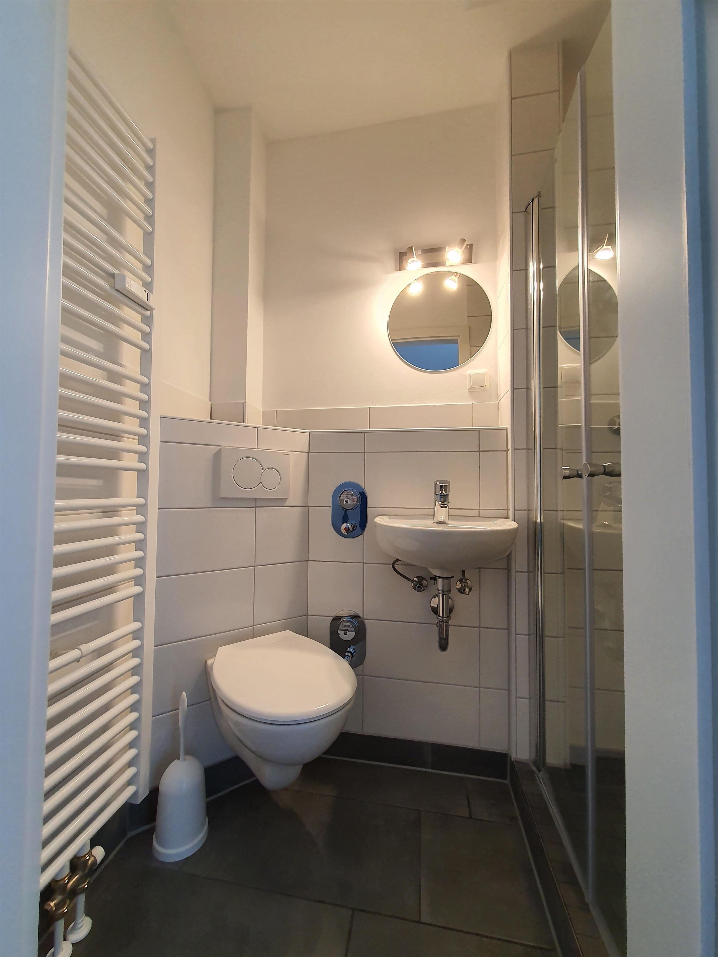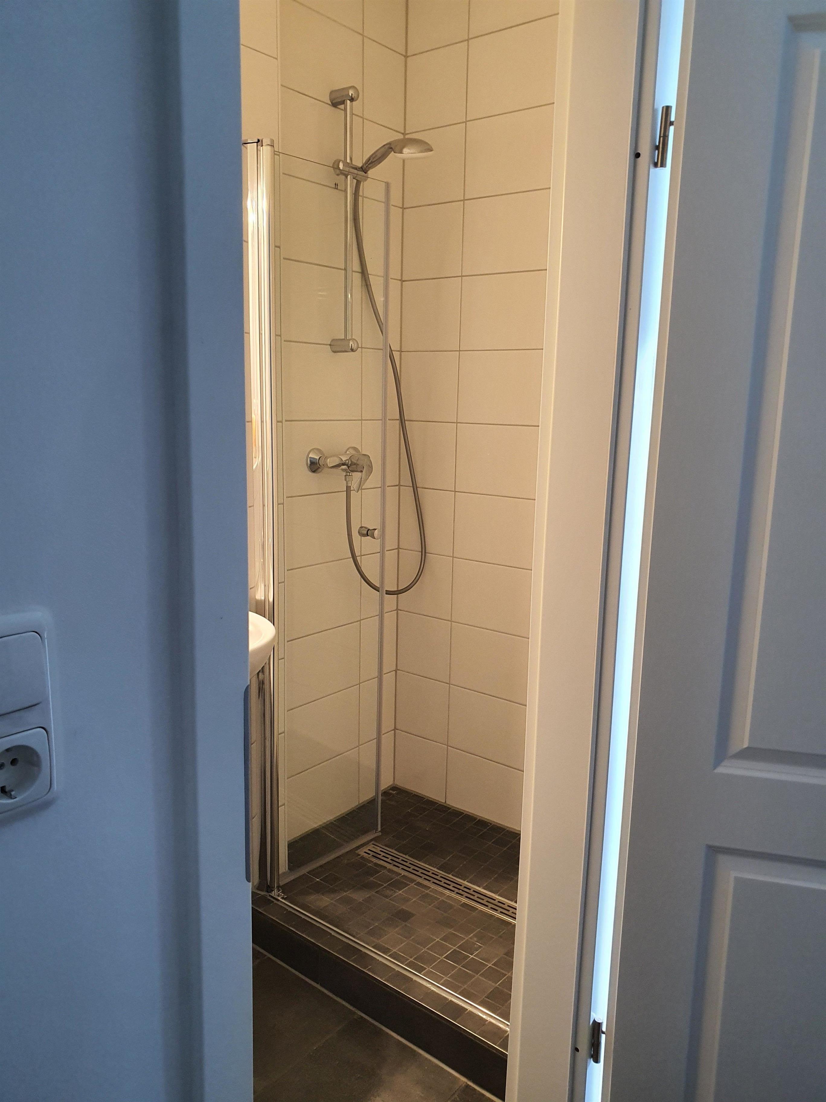 Die Wohnung hat ein eigenes Badezimmer mit einer Dusche.