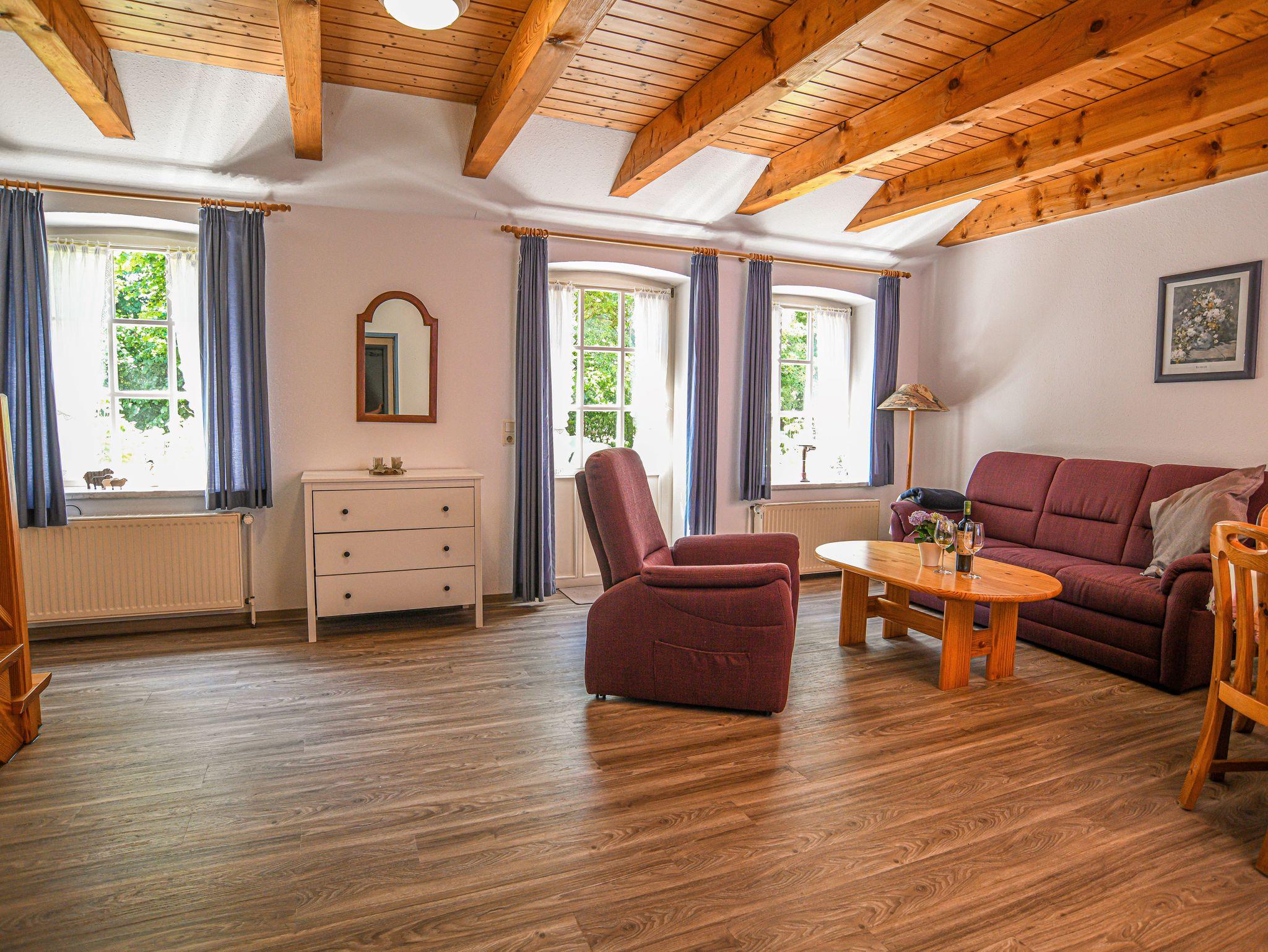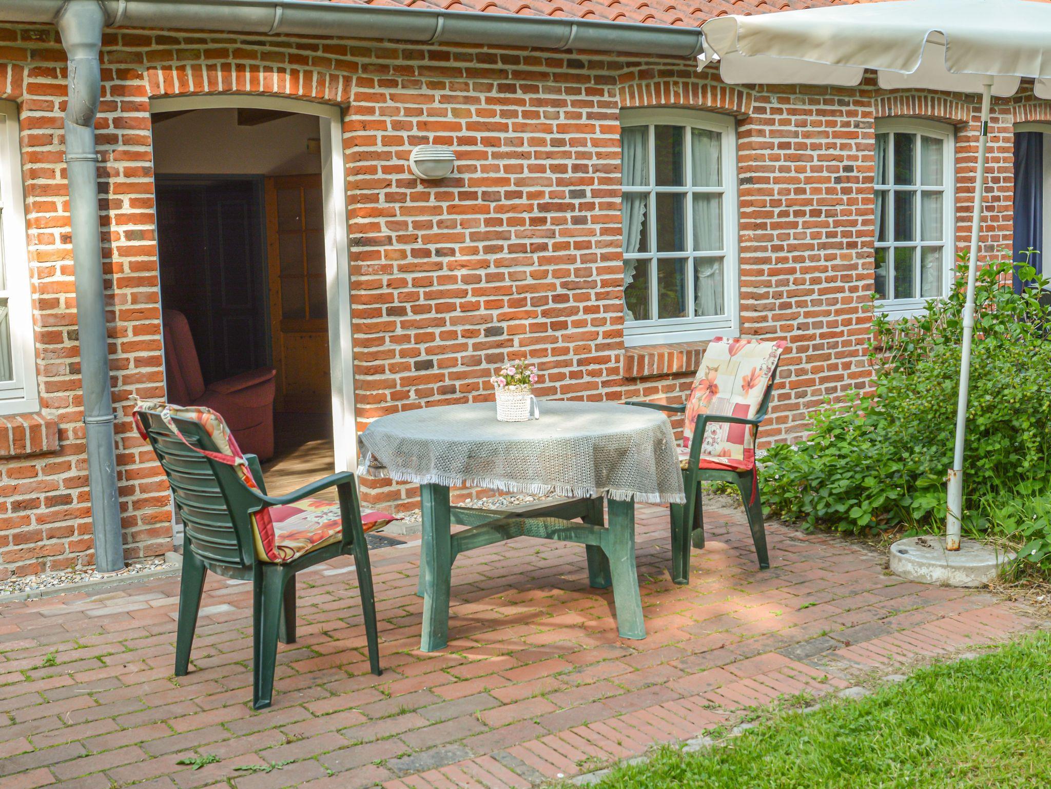 Geräumiger Wohn-/Essbereich im Erdgeschoss im ehemaligen Stallgebäude eines friesischen Gulfhofes mit Zugang zu eigener Terrasse/Bauerngarten und Grillstelle. Über eine Treppe gelangt man zum Bad und zum Schlafzimmer mit einem Doppekbett und einem Einzelbett. Im Wohnzimmer befindet sich ein Schlafsofa für eine Person. Ein Kleinkind bis 2 Jahre kann in einem Kinderbett schlafen. Die Wohnung ist für maximal 3 Erwachsene und 1 Kleinkind geeignet.