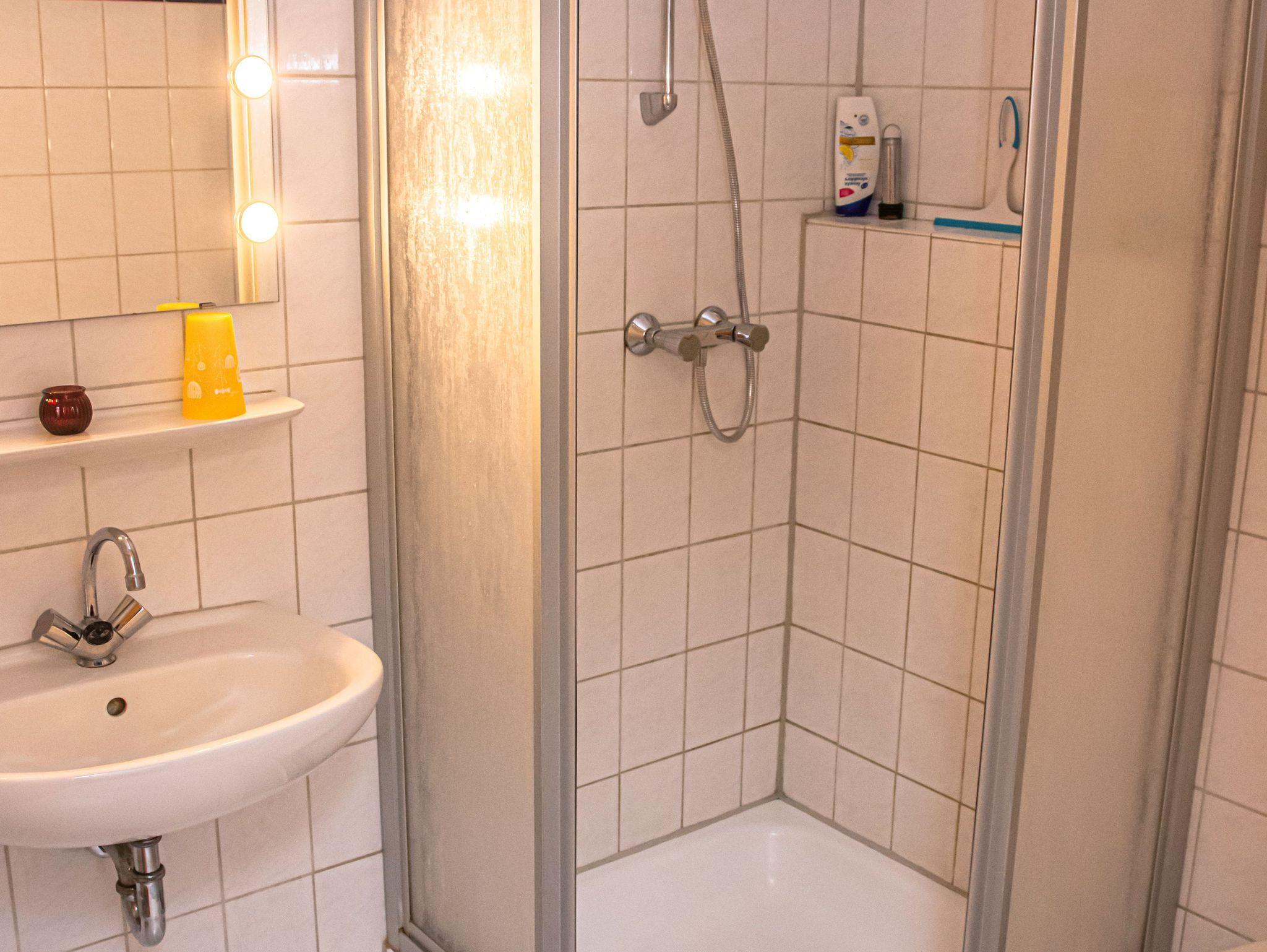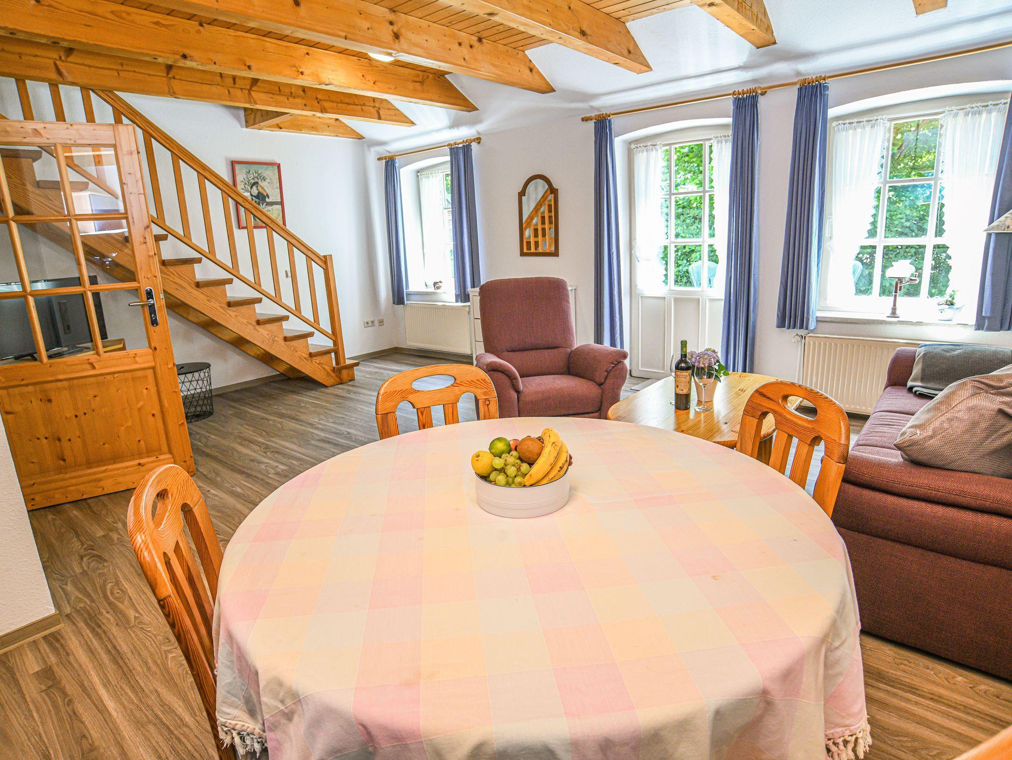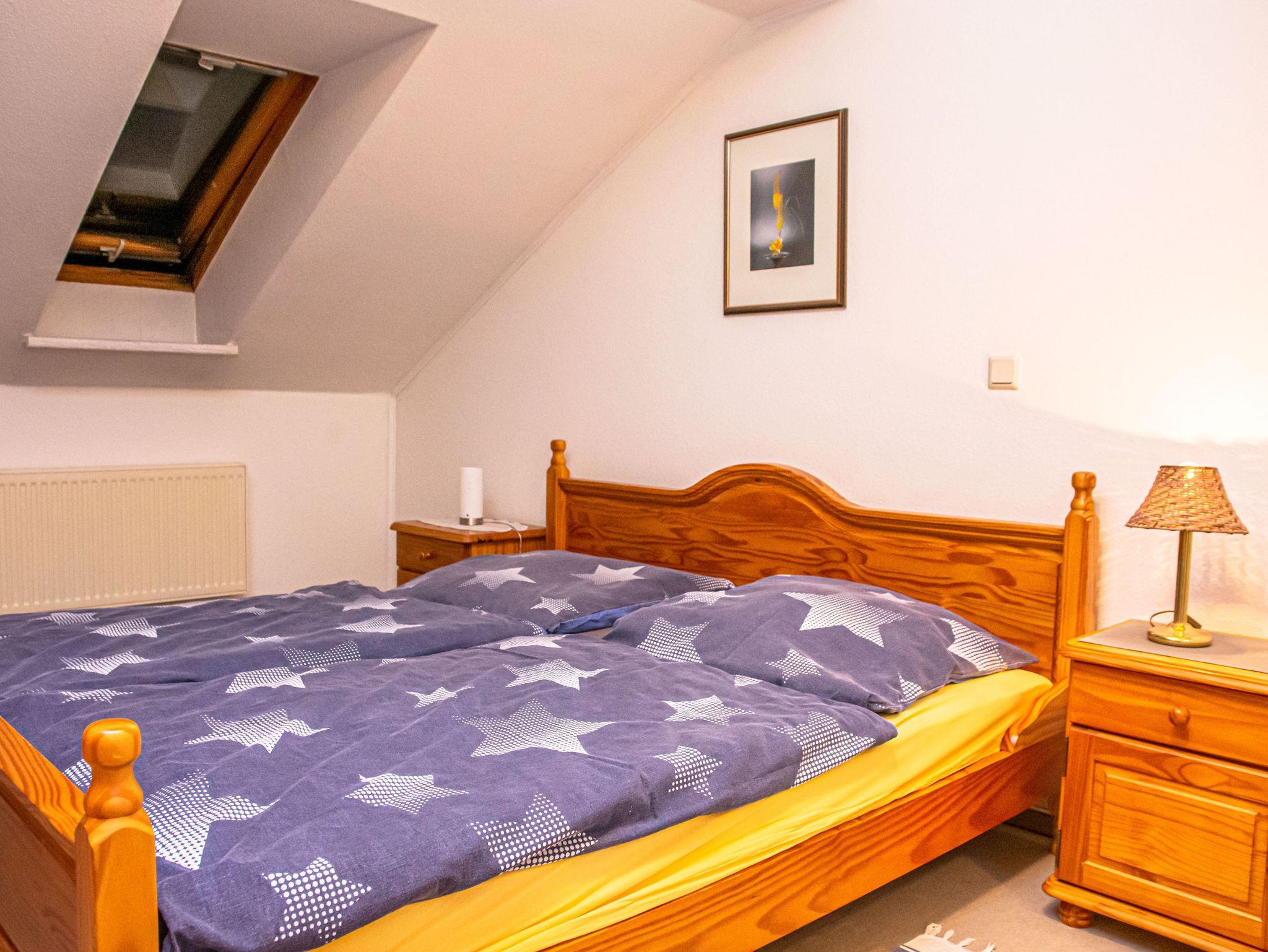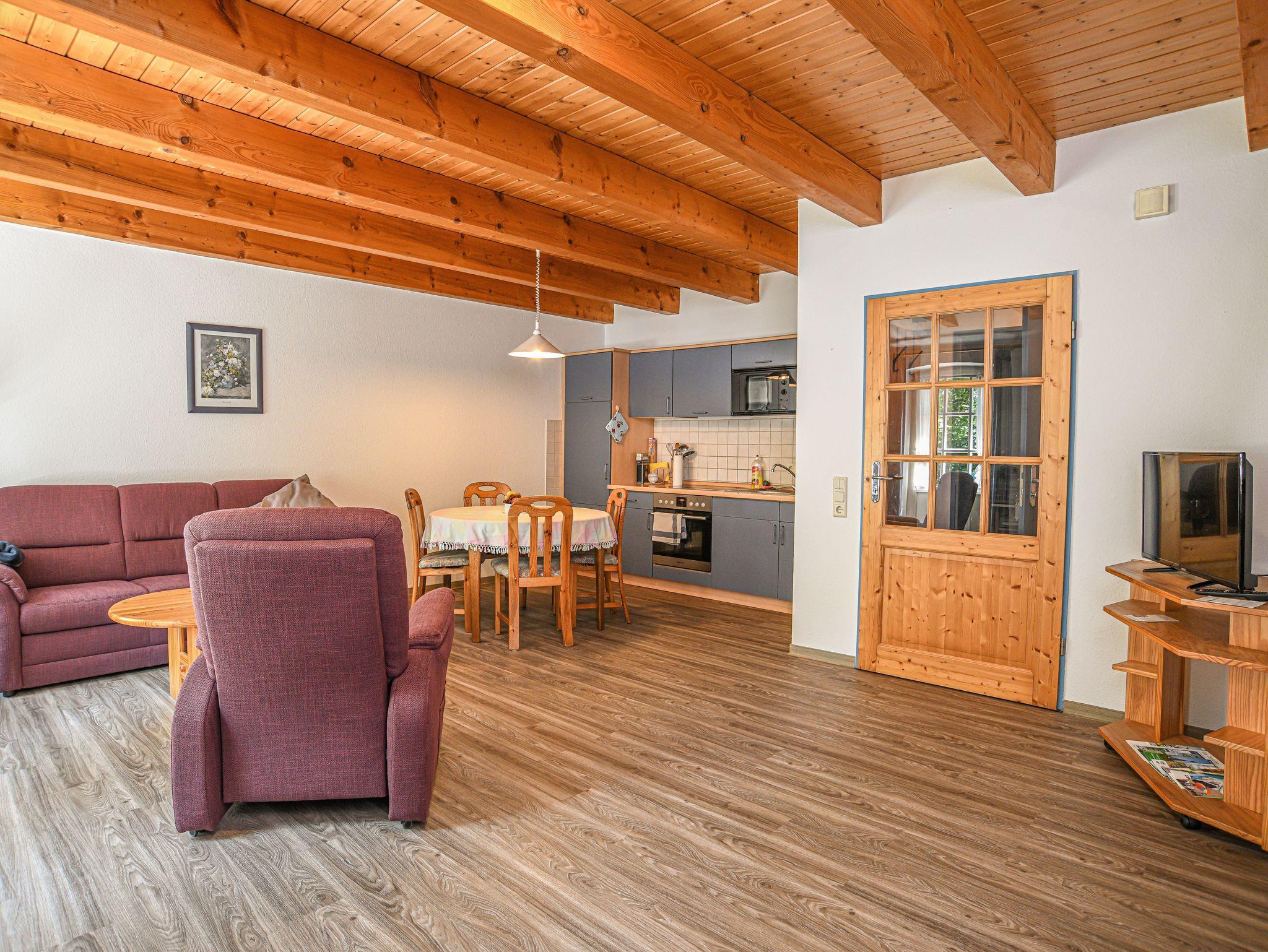 Die Ferienwohnung besteht aus einem Wohnzimmer mit Küche und Esstisch. Im Obergeschoss befinden sich das Schlafzimmer mit drei Betten (Doppelbett und Einzelbett) und dem Bad (Gesamtgröße ca. 53 qm). Die Fußböden wurden mit hochwertigen Vinylboden ausgelegt. Im Wohnzimmer befindet sich ein Schlafsofa für eine Person. Ein Kind bis 2 Jahre kann zusäzlich in einem Kinderbett schlafen. Die Wohnung ist für maximal drei Erwachsene und ein Kind bis 2 Jahren geeignet.