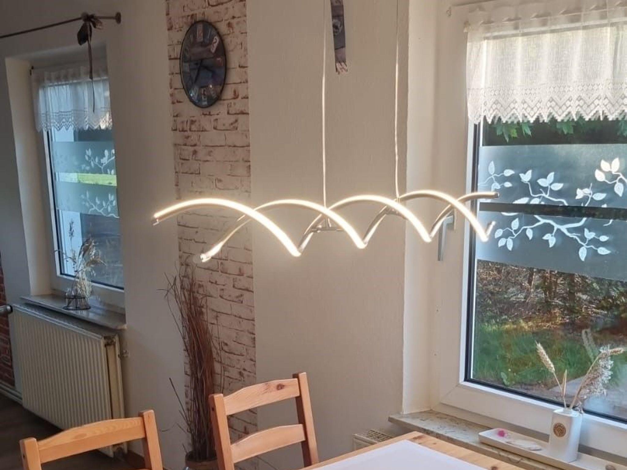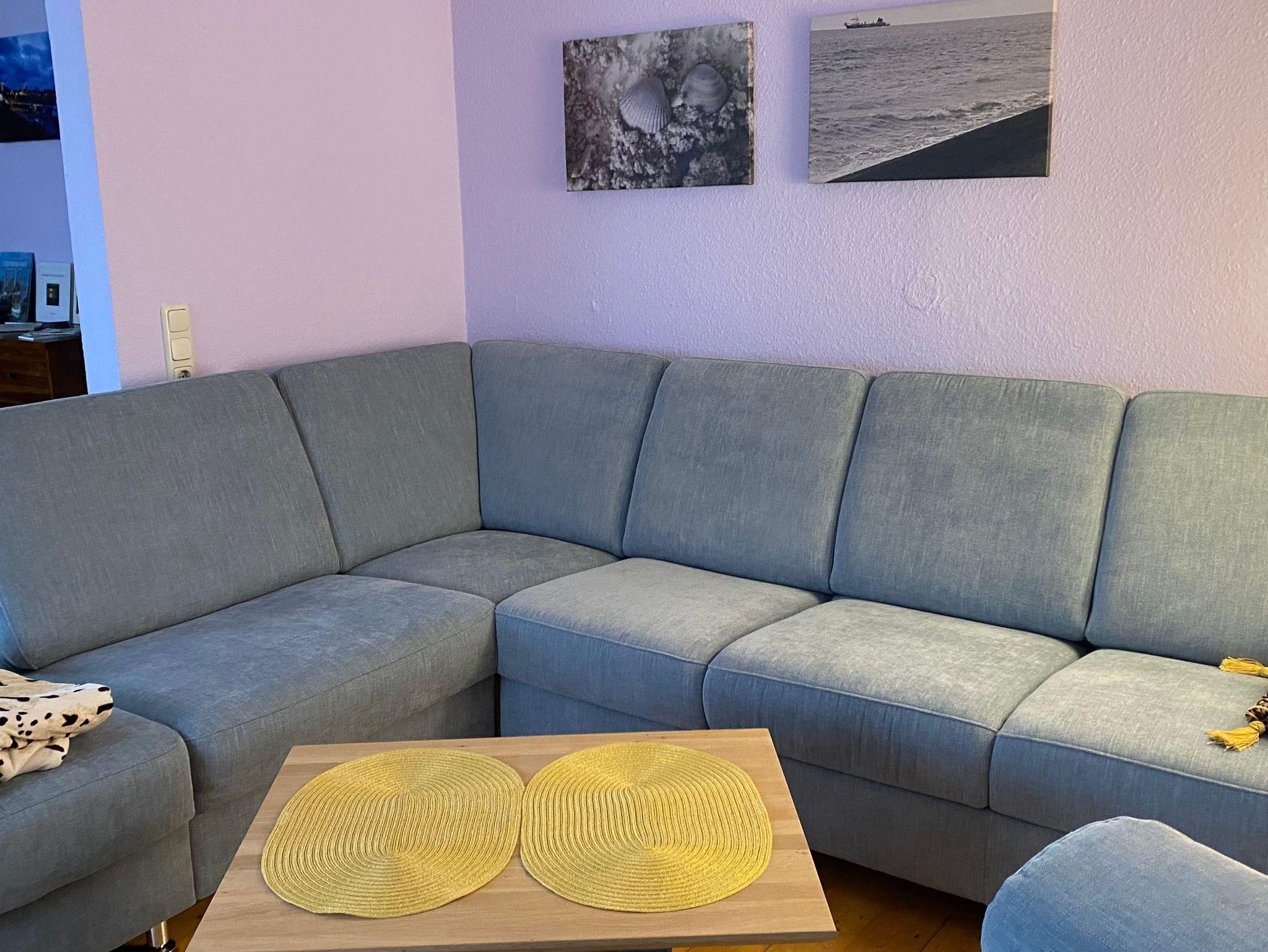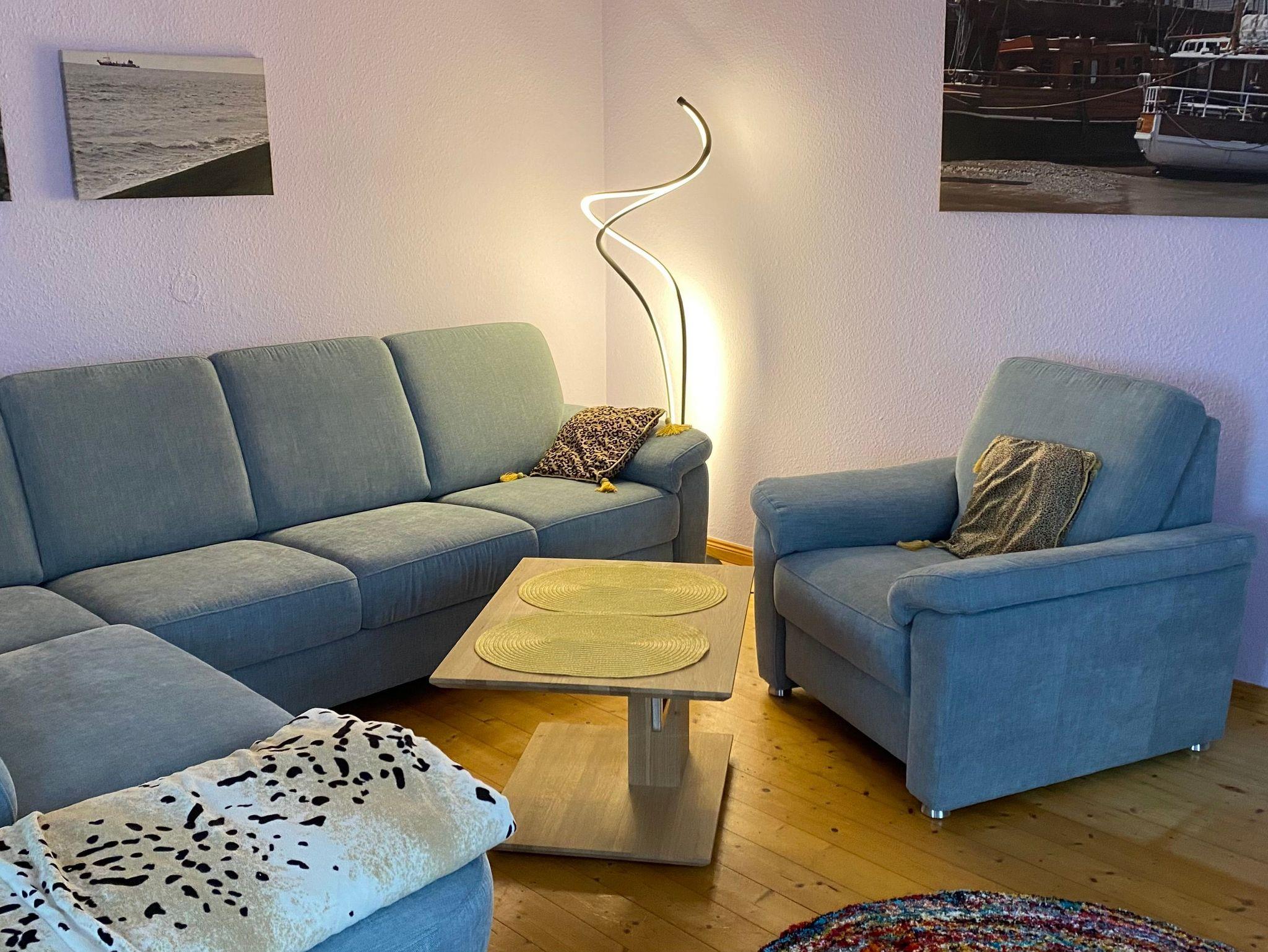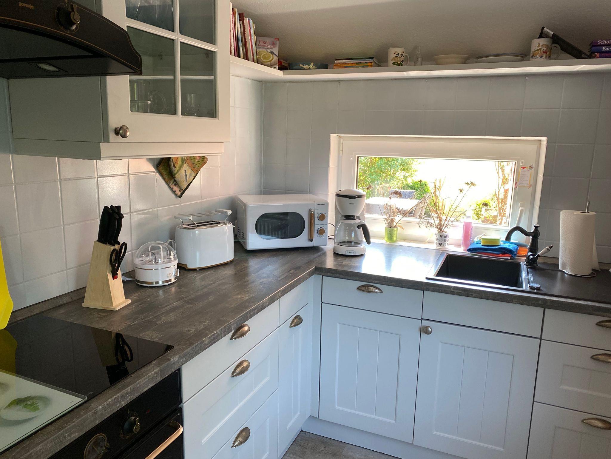 Erdgeschoss: Großzügige Wohnküche mit moderner Einbauküche,gemütliches Wohn-Esszimmer mit bequemer Eckcouch mit Samsung Smart-TV und WLAN (Glasfaseranschluss über EWE), modernes Duschbad, im Eingangsbereich Garderobe und direkter Zugang zur Terrasse, Waschmaschine (im Duschbad).