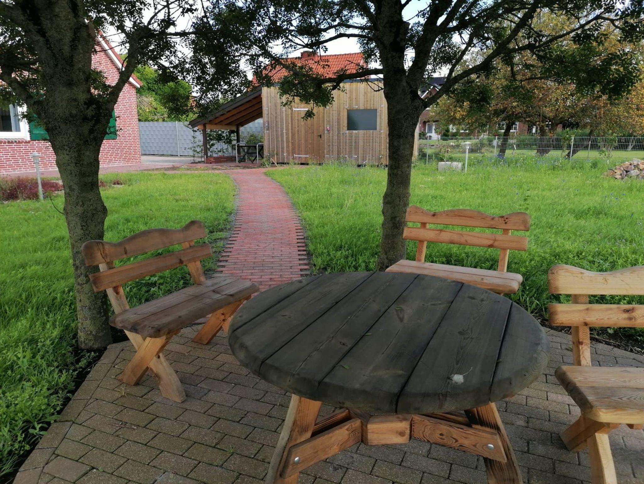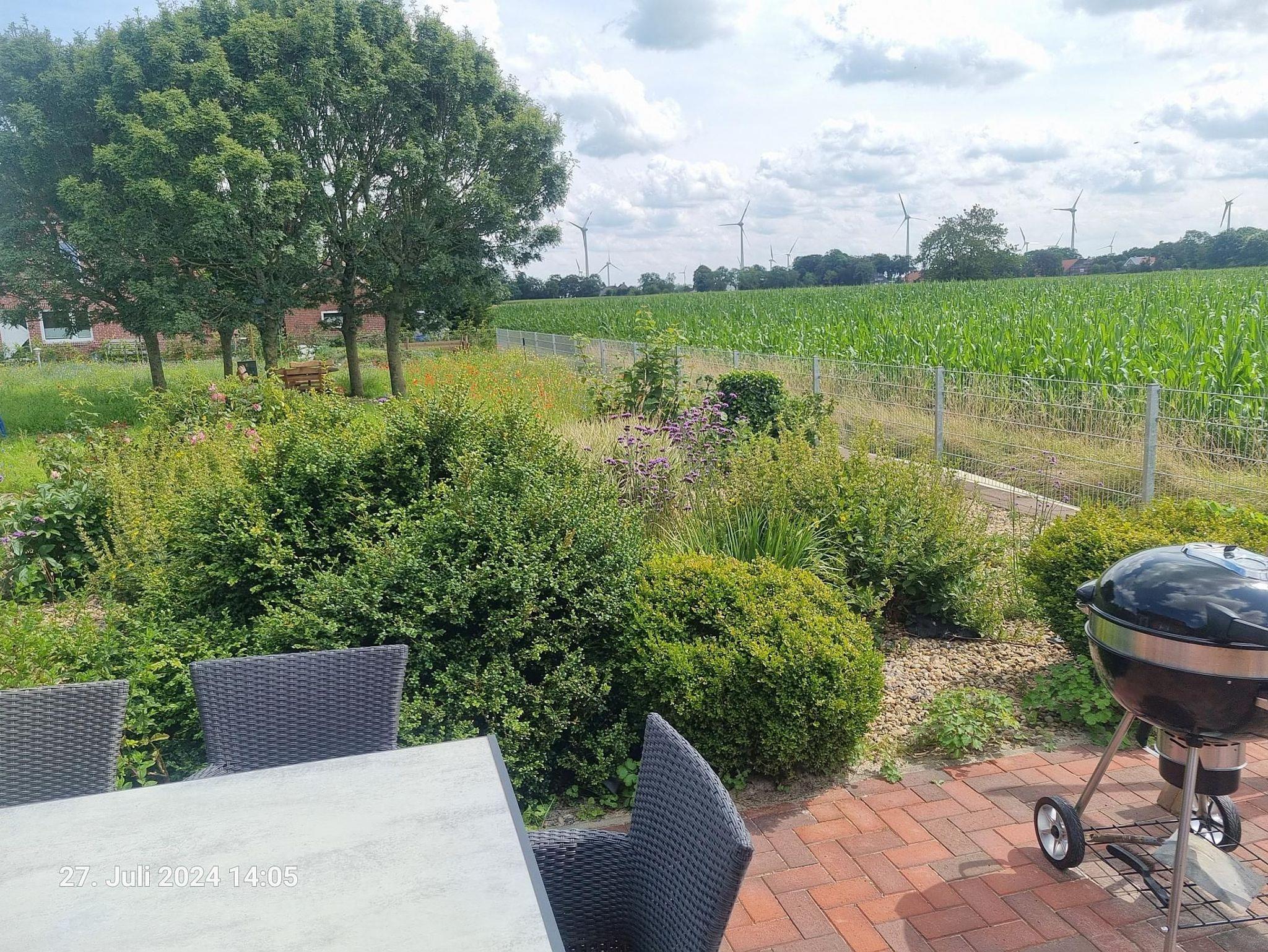 Bepflanzung im Garten sind Wildblumen, die typisch sind für diese ostfriesische Umgebung. Weiterhin gibt es für die Gäste verschiedene Beeren (Johannisbeeren, Himbeeren, Brombeeren, Stachelbeeren), die gepflückt werden können. Der Garten ist nach dem Prinzip eines Naturgartens angelegt. Das Grundstück ist mit einem 1 m hohen Zaun rundum eingezäunt. Hier können Hunde frei laufen.
