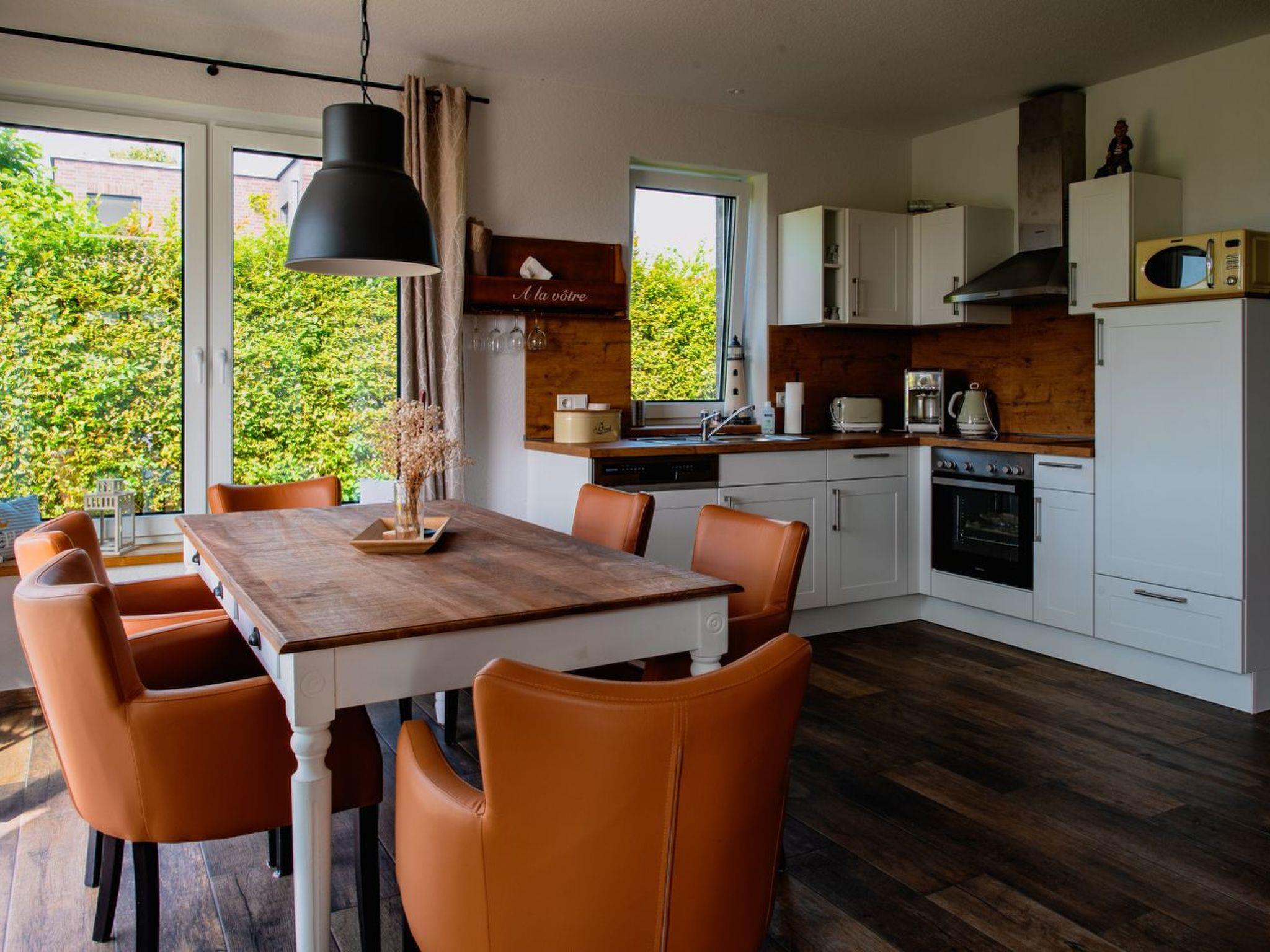 Wenn Sie das Haus betreten, begrüßt Sie nach einem kleinen Eingangsbereich der große offene Wohn- und Essbereich mit großen Fenstern nach Süd/West in den Garten und über die unbebauten Wiesen der Halbinsel. Das Haus ist mit hochwertigen geschmackvollen Möbeln ausgestattet.