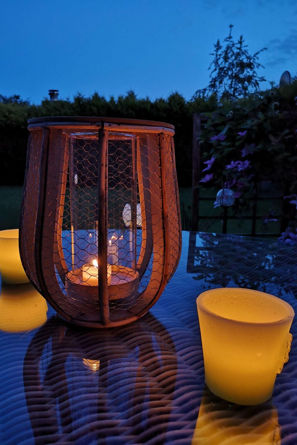 Zum Haus gehört eine große möblierte Terrasse mit Stühlen, Tisch, einem Strandkorb und einer Liege. Ein Holzkohlengrill ist auch vorhanden. Der Garten ist fast komplett eingezäunt bzw. mit einer dichten Hecke eingefasst.
