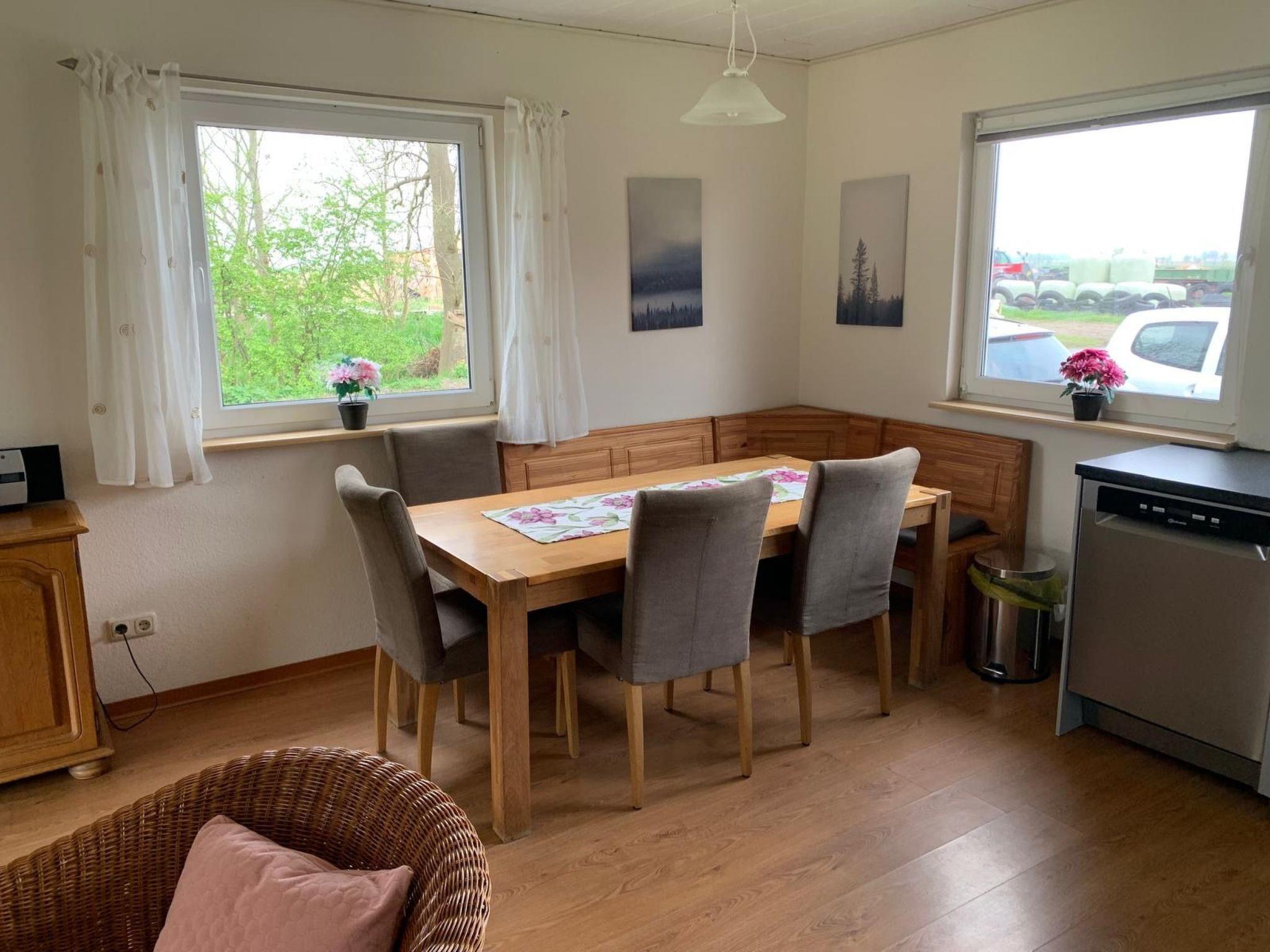 Die ebenerdige Ferienunterkunft bietet Platz für maximal 6 Personen. Es stehen zwei Doppelbettzimmer und ein weiteres Zimmer mit 2 Einzelbetten zur Verfügung. Vom Wohnraum mit gemütlicher Sofaecke gelangen Sie auf die zum Bungalow gehörende Terrasse, die über den Garten einen weiten Blick auf die angrenzenden Wiesen bietet. Eine offene, mit Spülmaschine, Kühlschrank, Herd und Backofen komplett eingerichtete Küche verfügt über einen separaten Essplatz, der Platz zum gemeinsamen Essen oder Spielen bietet. Weiterhin gehört ein modernes Bad mit Dusche und WC sowie ein separates Gäste-WC zum Bungalow. Der an die Terrasse angrenzende Garten kann zum Sonnenbaden oder Toben genutzt werden.