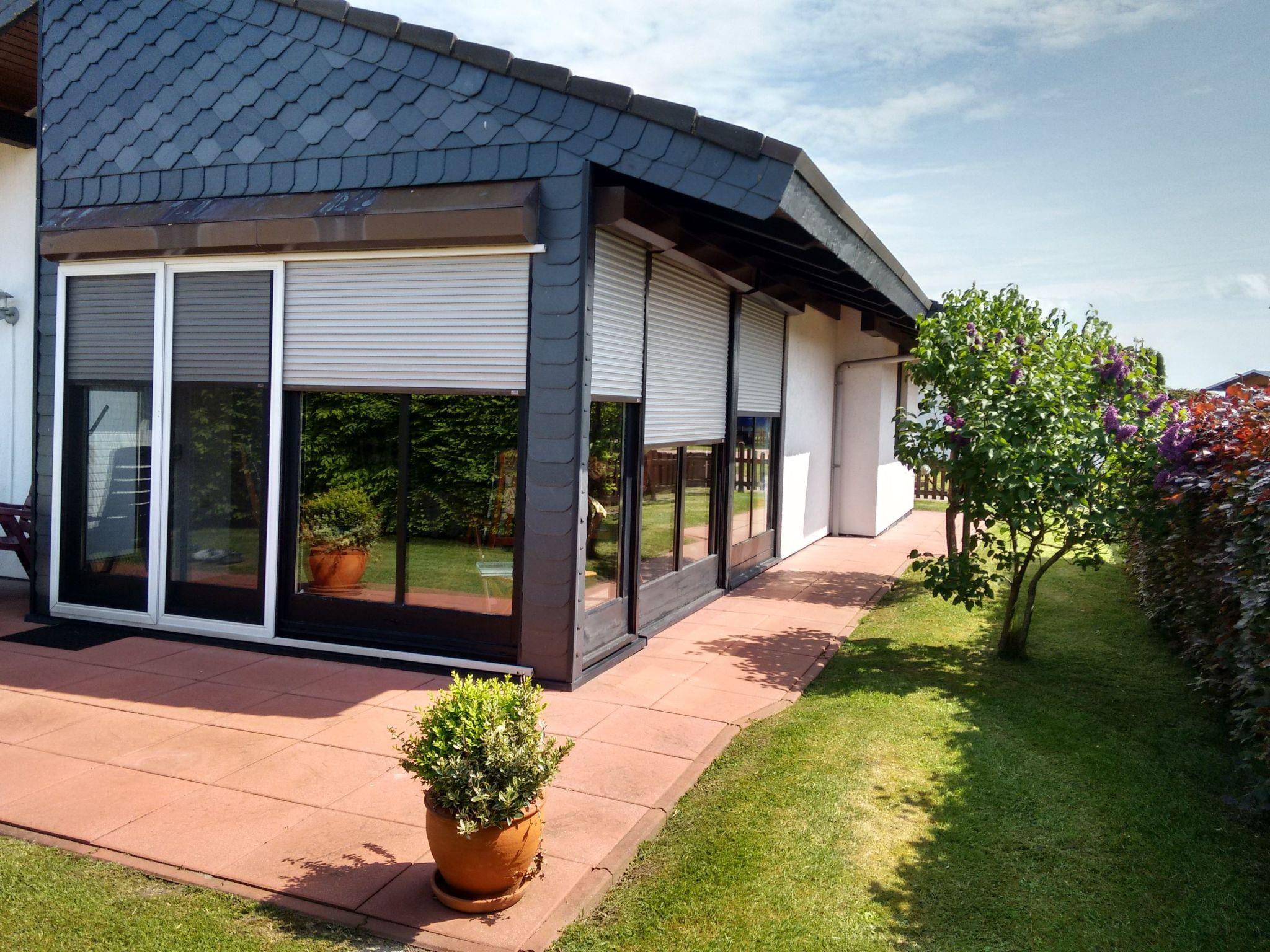 Der Außenbereich des Hauses lädt zum Entspannen ein. Genießen Sie die Ruhe im beheizbaren Wintergarten, der mit einem Tisch und Stühlen ausgestattet ist, oder entspannen Sie im Garten, der mit einem Tisch, Gartenstühlen, Auflagen, zwei Liegen und einem Strandkorb zum Verweilen einlädt. Alle Fenster sind mit Rolläden versehen, im Wintergarten sorgen zusätzlich Jalousien für angenehmen Sonnenschutz.