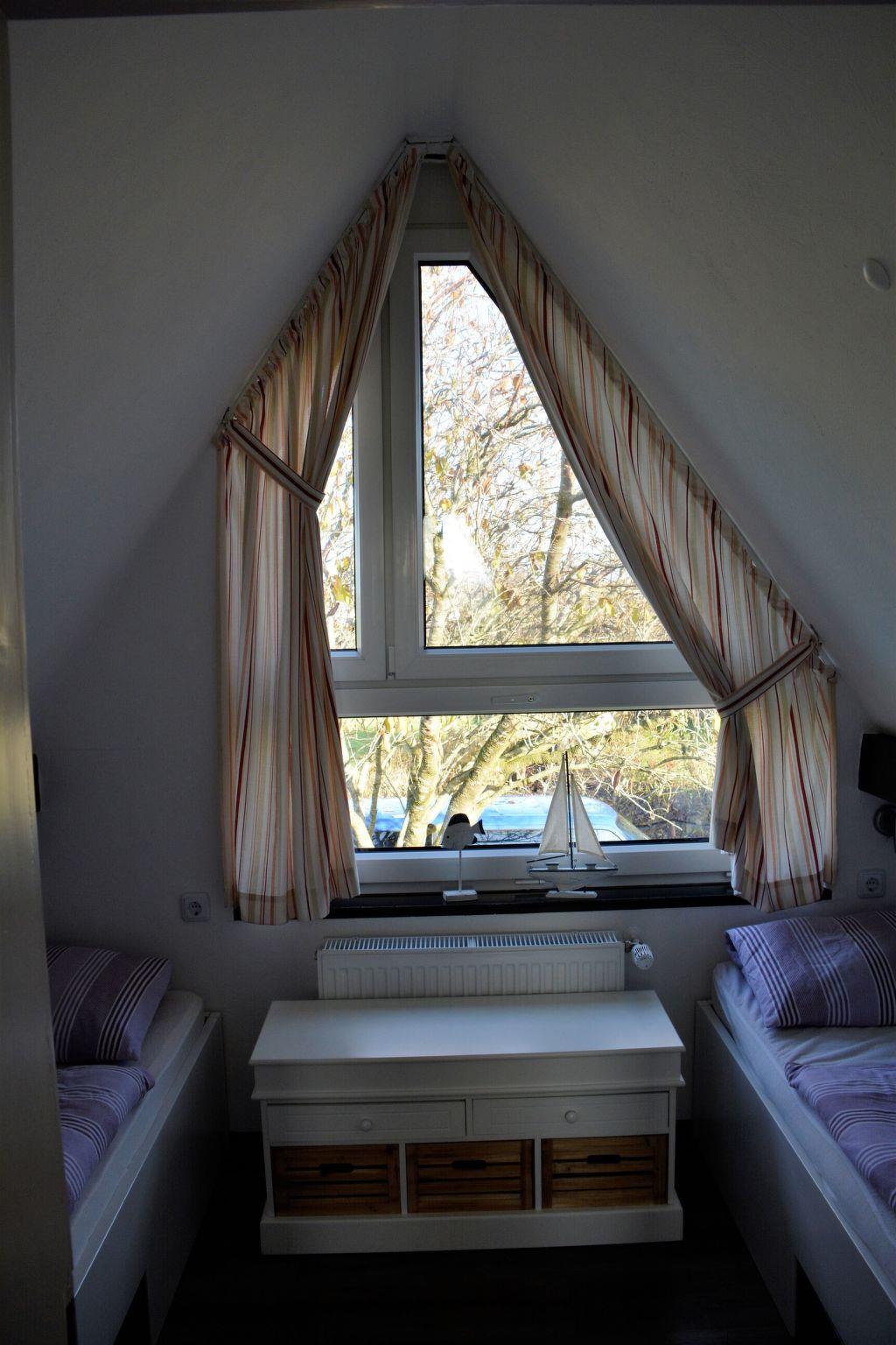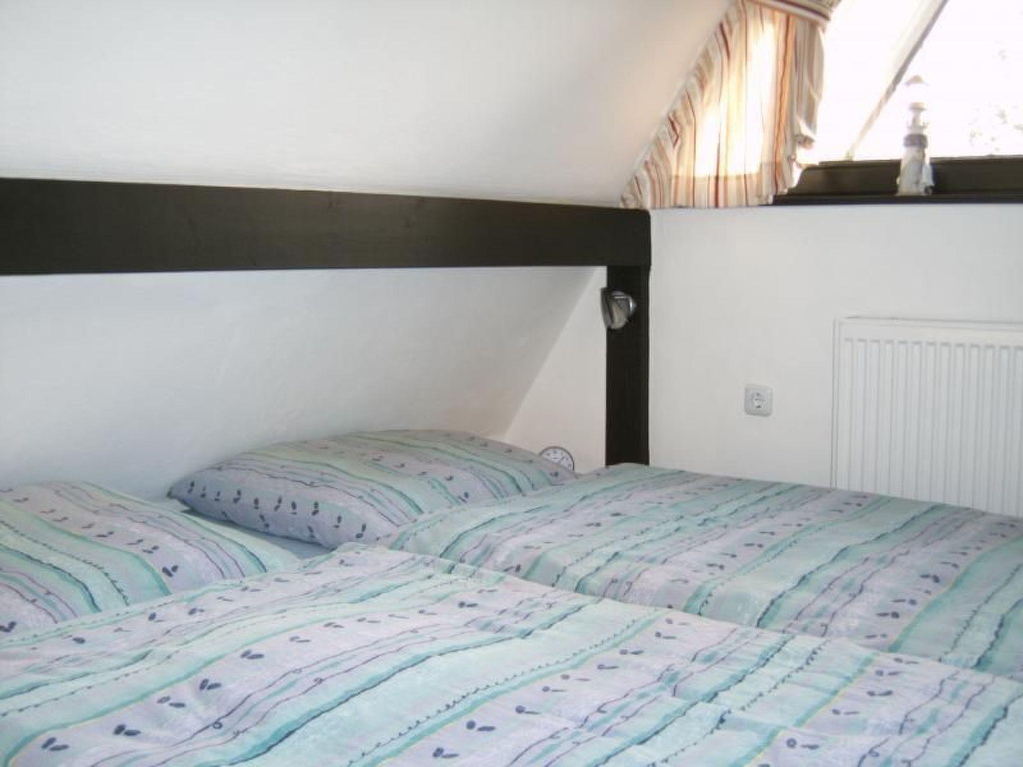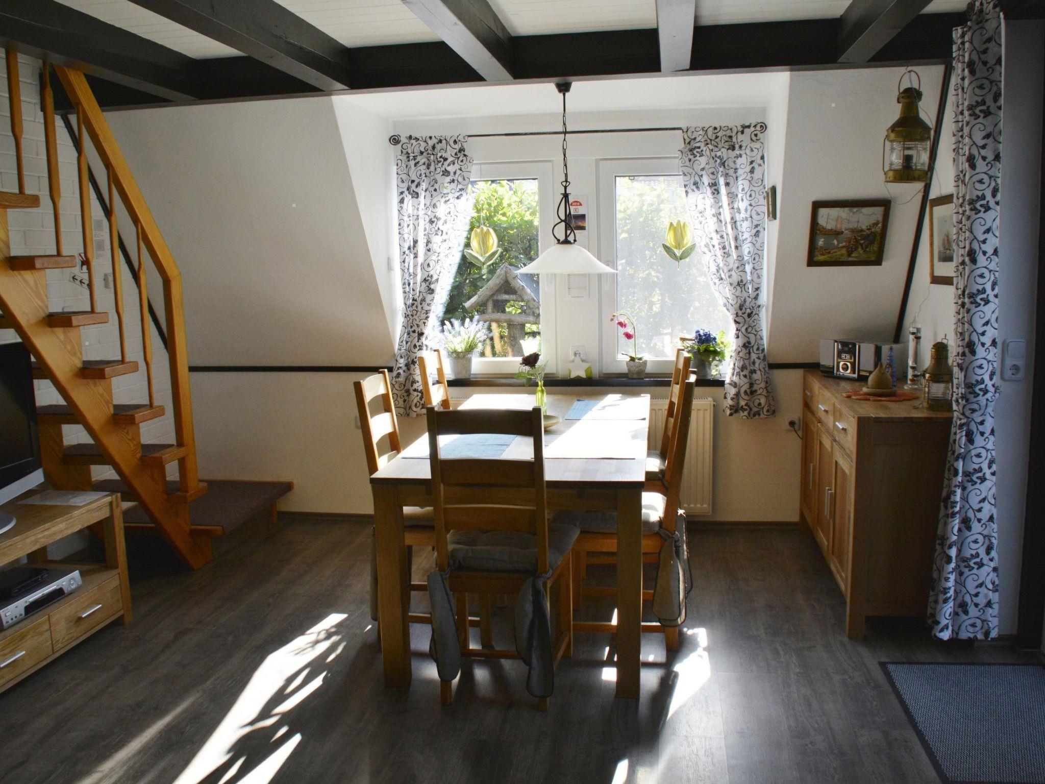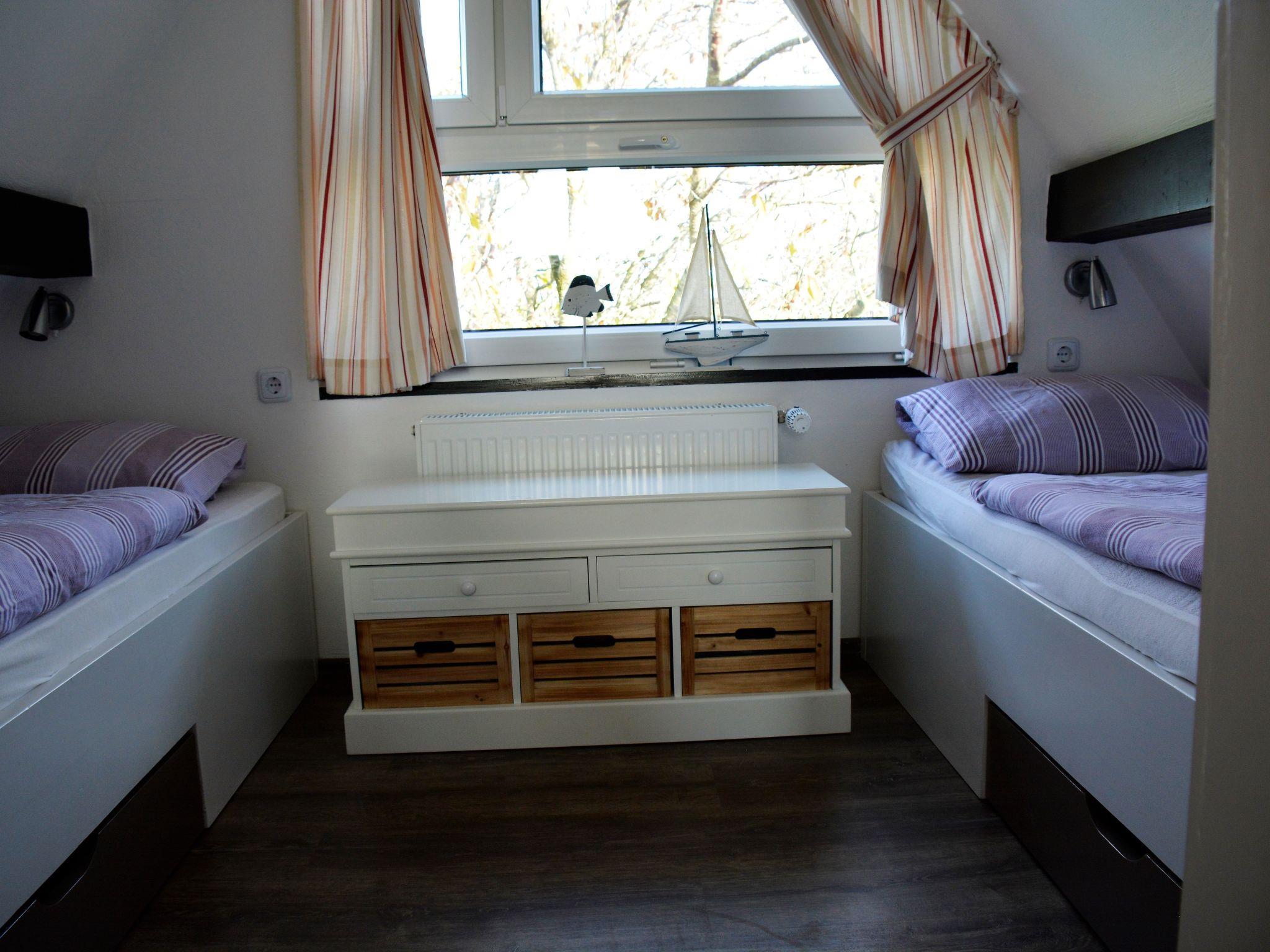 Im Obergeschoss gibt es ein Doppelbettschlafzimmer und ein Zimmer mit zwei Einzelbetten. Im Erdgeschoss befindet sich ein kleines Duschbad und ein separates WC und eine kleine, mit Kühlschrank, Mikrowelle und Herd mit Backofen vollständig eingerichtete, Küche. Durch die im Zuge der Sanierungsarbeiten eingebaute Dachgaube ist im Wohnbereich ein heller separater Essplatz entstanden, der ausreichend Platz zum Essen und Spielen bietet. Mit einem Babyreisebett und einem Kinderhochstuhl, die kostenlos vom Eigentümer zur Verfügung gestellt werden, sowie einem Toilettenaufsitz für Kinder und einem Höckerchen im Bad bietet das Haus eine familienfreundliche Ausstattung.