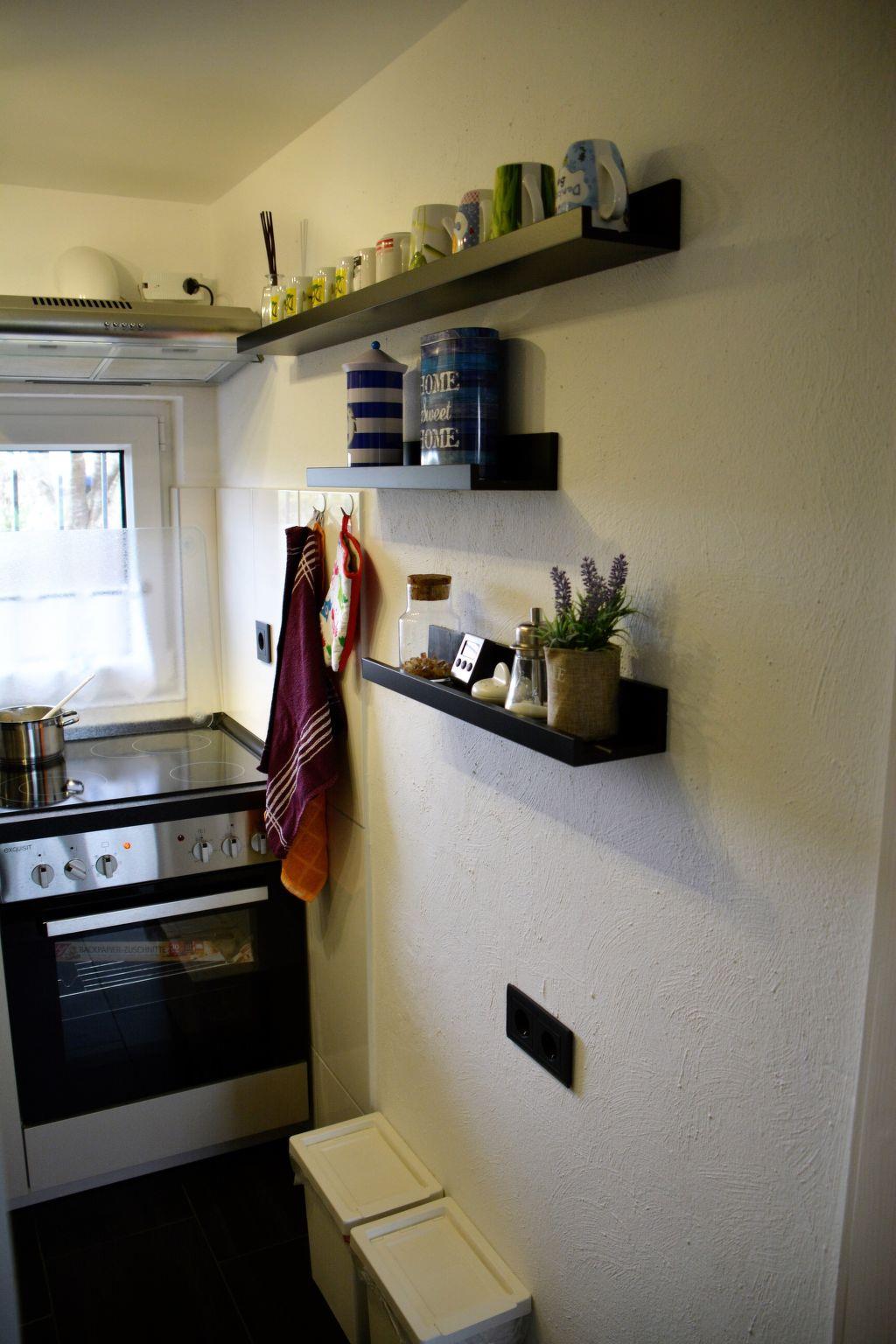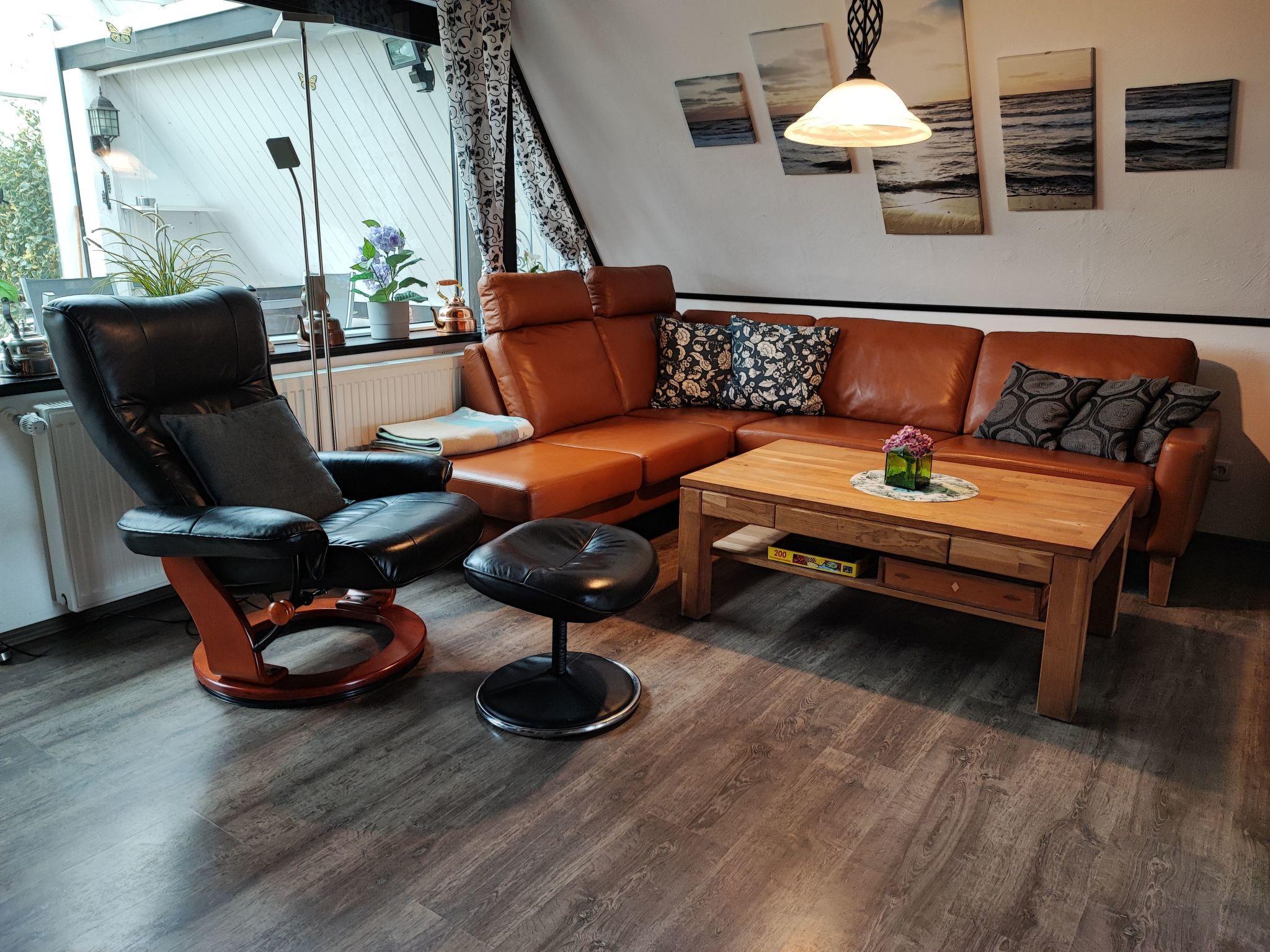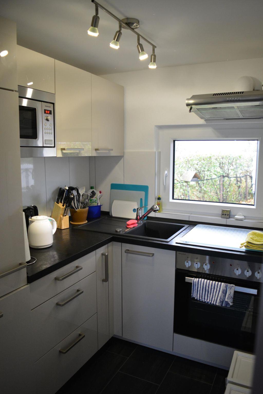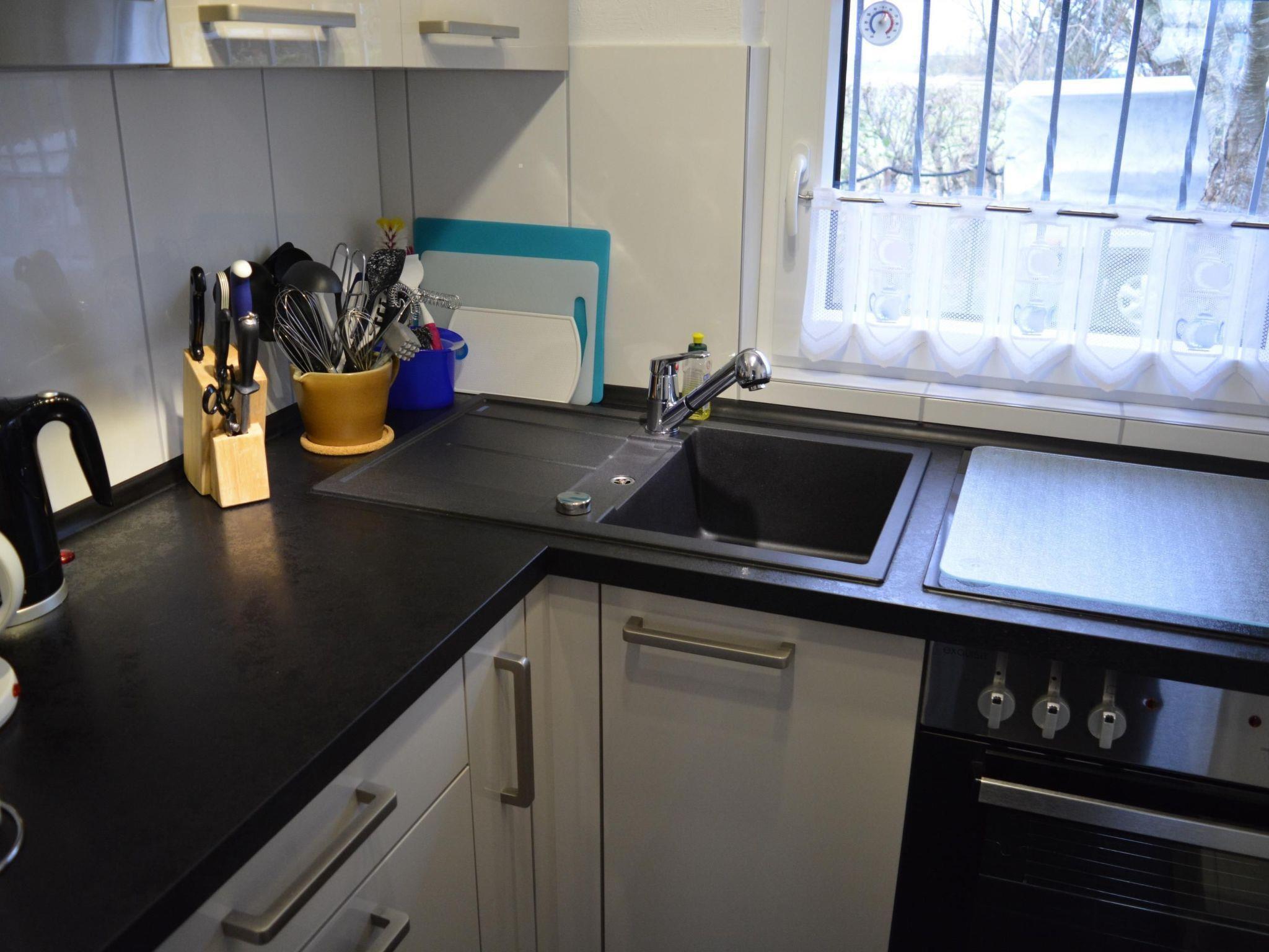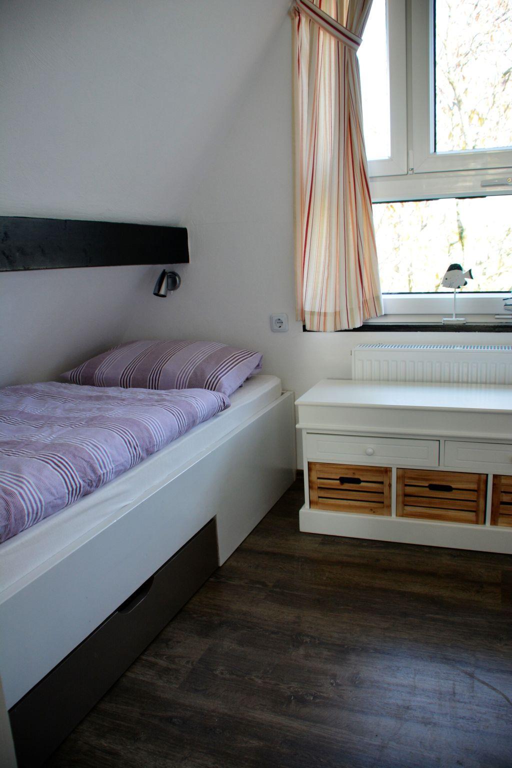 Im Obergeschoss gibt es ein Doppelbettschlafzimmer und ein Zimmer mit zwei Einzelbetten. Im Erdgeschoss befindet sich ein kleines Duschbad und ein separates WC und eine kleine, mit Kühlschrank, Mikrowelle und Herd mit Backofen vollständig eingerichtete, Küche. Durch die im Zuge der Sanierungsarbeiten eingebaute Dachgaube ist im Wohnbereich ein heller separater Essplatz entstanden, der ausreichend Platz zum Essen und Spielen bietet. Mit einem Babyreisebett und einem Kinderhochstuhl, die kostenlos vom Eigentümer zur Verfügung gestellt werden, sowie einem Toilettenaufsitz für Kinder und einem Höckerchen im Bad bietet das Haus eine familienfreundliche Ausstattung.