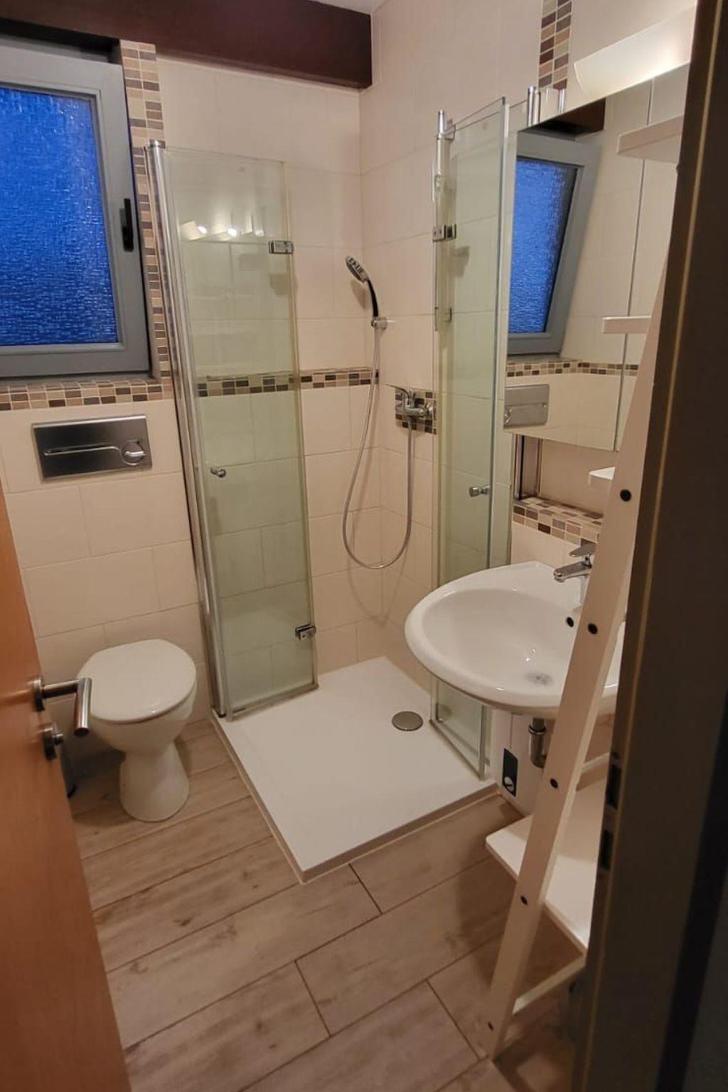 Mein Eingangsbereich hat eine Geh- und Kinderwagenfreundliche Rampe. In meinem barrierefreiem Erdgeschoss befindet sich der Wohn- und Essbereich, Küche, Bad und ein Zimmer mit zwei Einzelbetten. Das Erdgeschoss ist mit einem großem Wohnraum, integrierten Essbereich und mit einem Flachbildfernseher, einem barrierefreiem Schlafzimmer mit zwei Einzelbetten (kein Hochbett), einem barrierefreiem Badezimmer mit Dusche niederer Einstieg und einer gut ausgestatteten Küche inkl. Kochgeschirr, Kaffeemaschine, Pads-Maschine Senseo, Wasserkocher, Spülmaschine, Backofen, Mikrowelle, Rührgerät und Sandwichtoaster ausgestattet. Für meine Gäste steht einheitliches Ess-/ Kaffeegeschirr und Gläser für mindestens sechs Personen zur Verfügung.