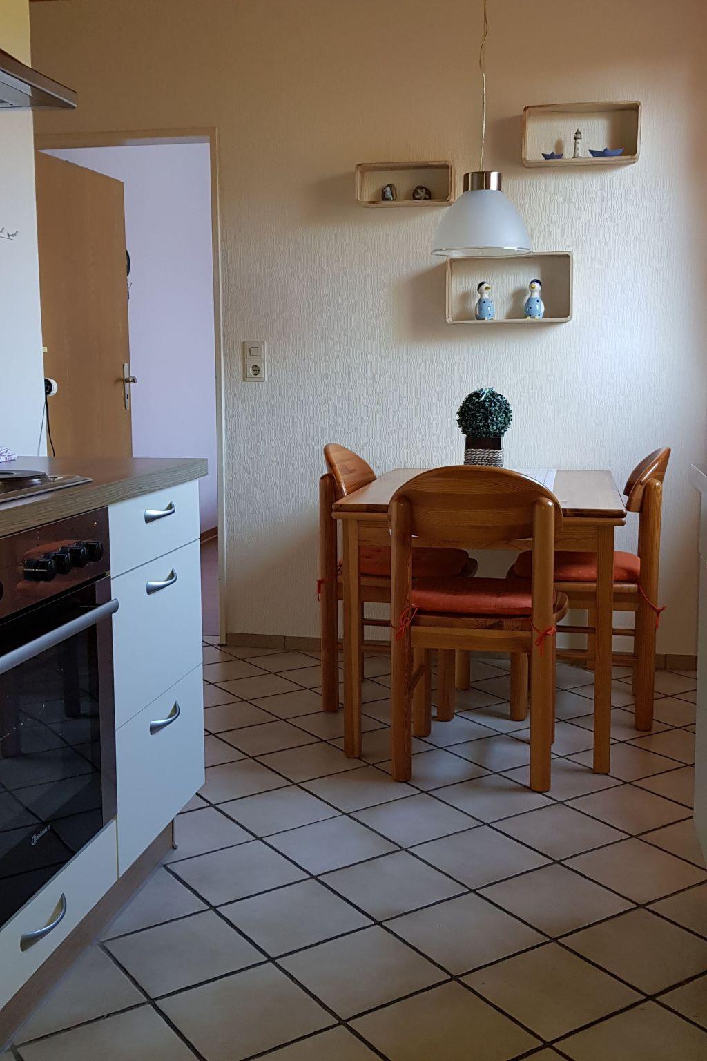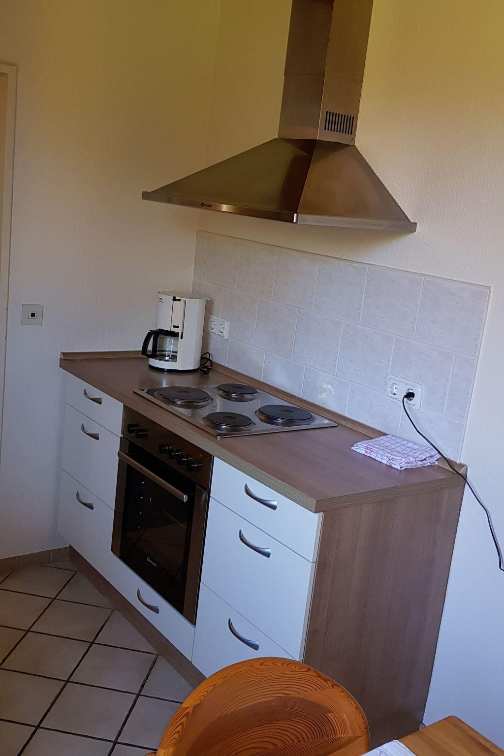 Die Ferienwohnung verfügt über eine vollausgestattete Küche mit Herd, Backofen, Kaffeemaschine, Wasseroberfläche und Essecke.