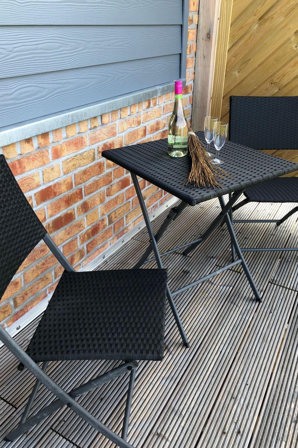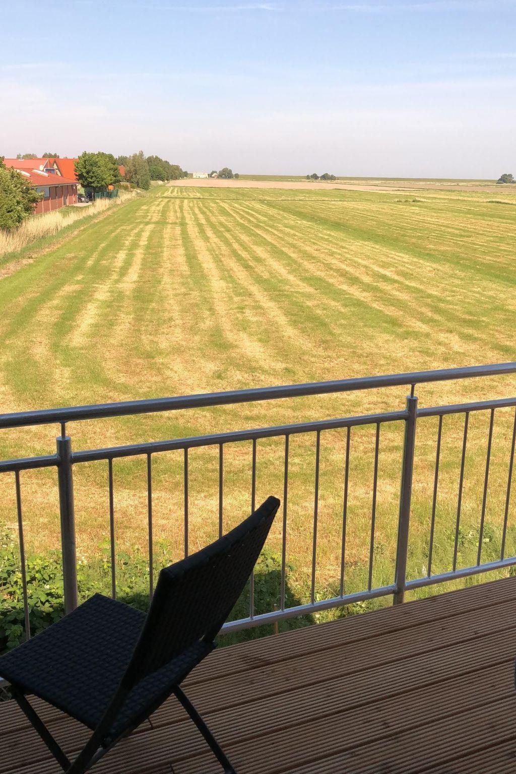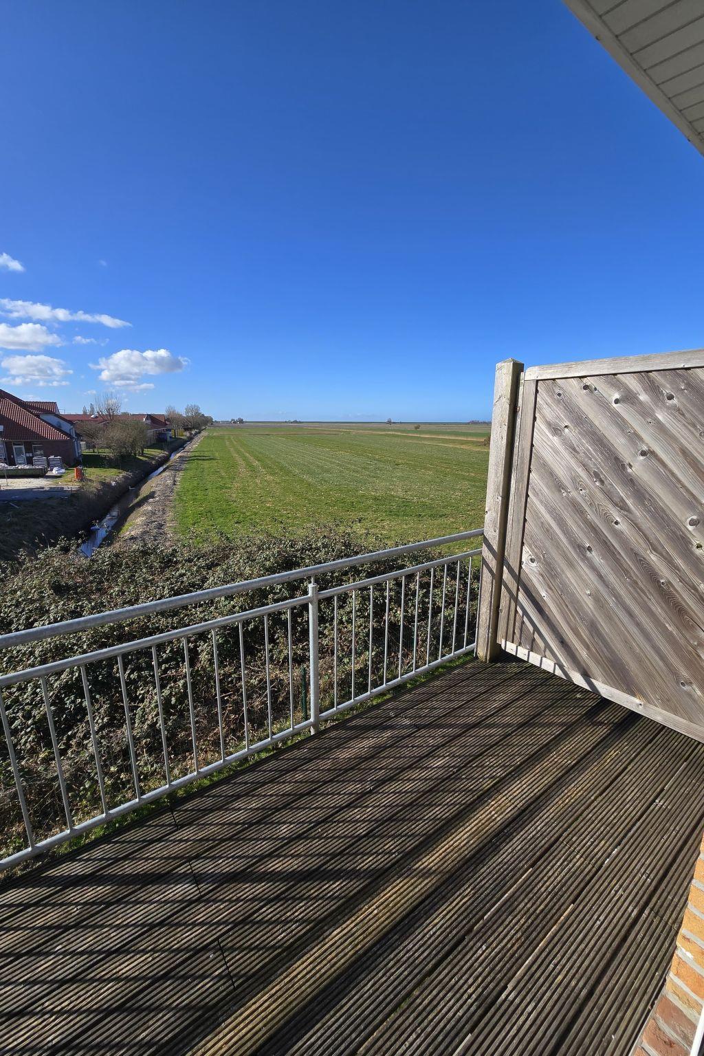 Auf der Terrasse befindet sich gemütliches Gartenmöbel (für 4 Personen) mit Auflagen und einen Grill. Auf dem Balkon stehen ein kleiner Tisch und 2 Stühle. Genießen Sie die Ruhe und den Ausblick über Felder und Wiesen bis hin zum Deich.