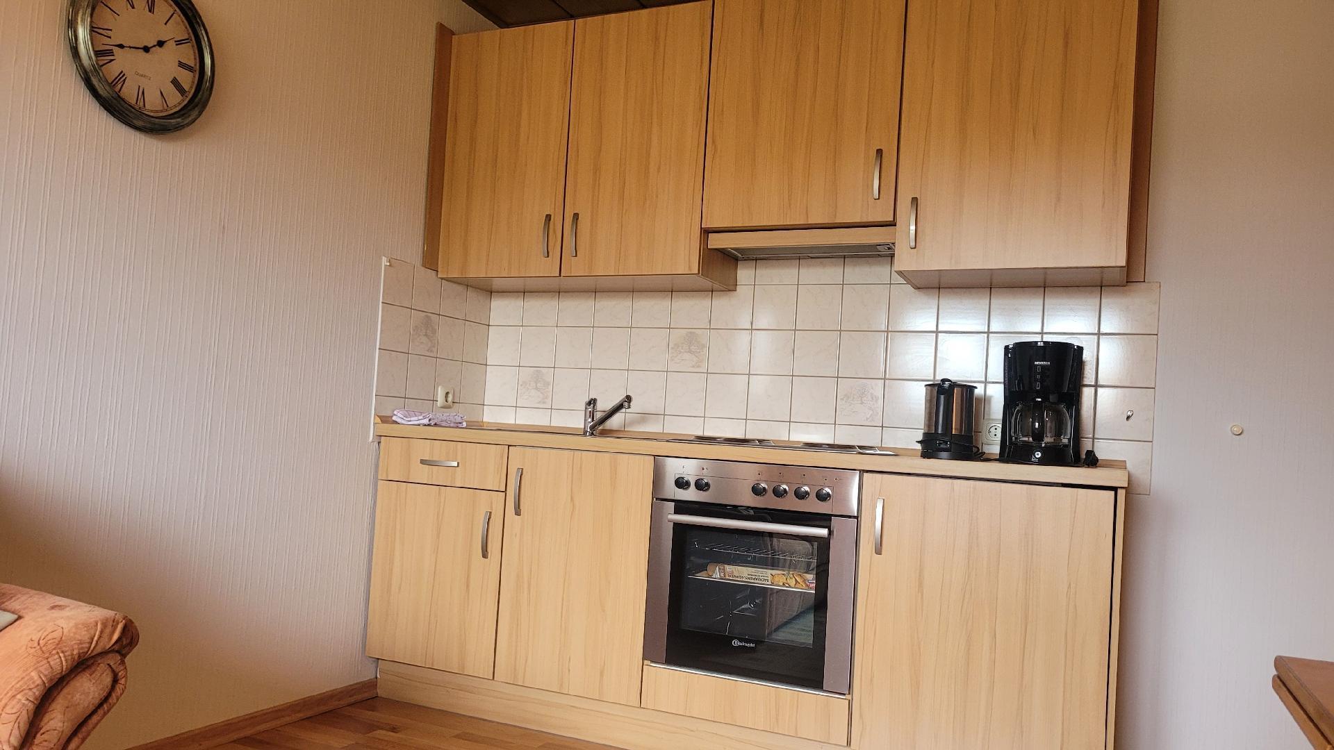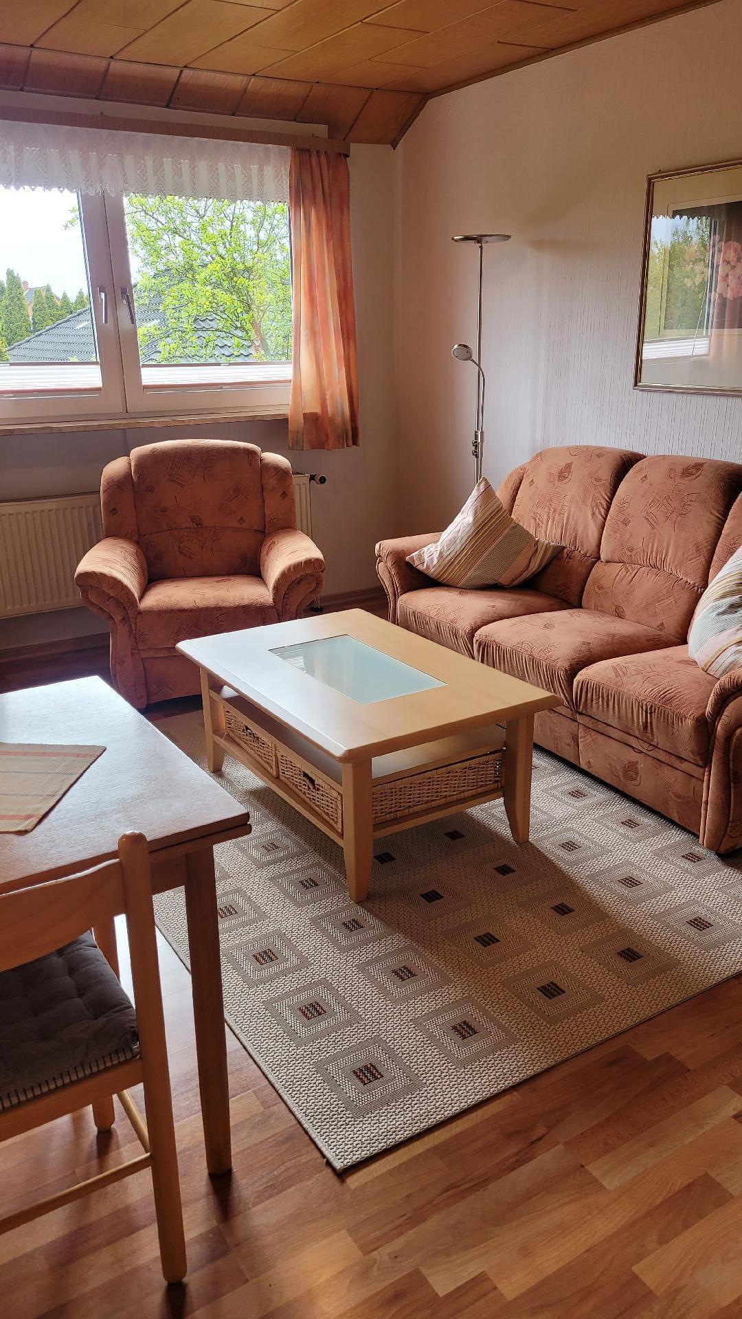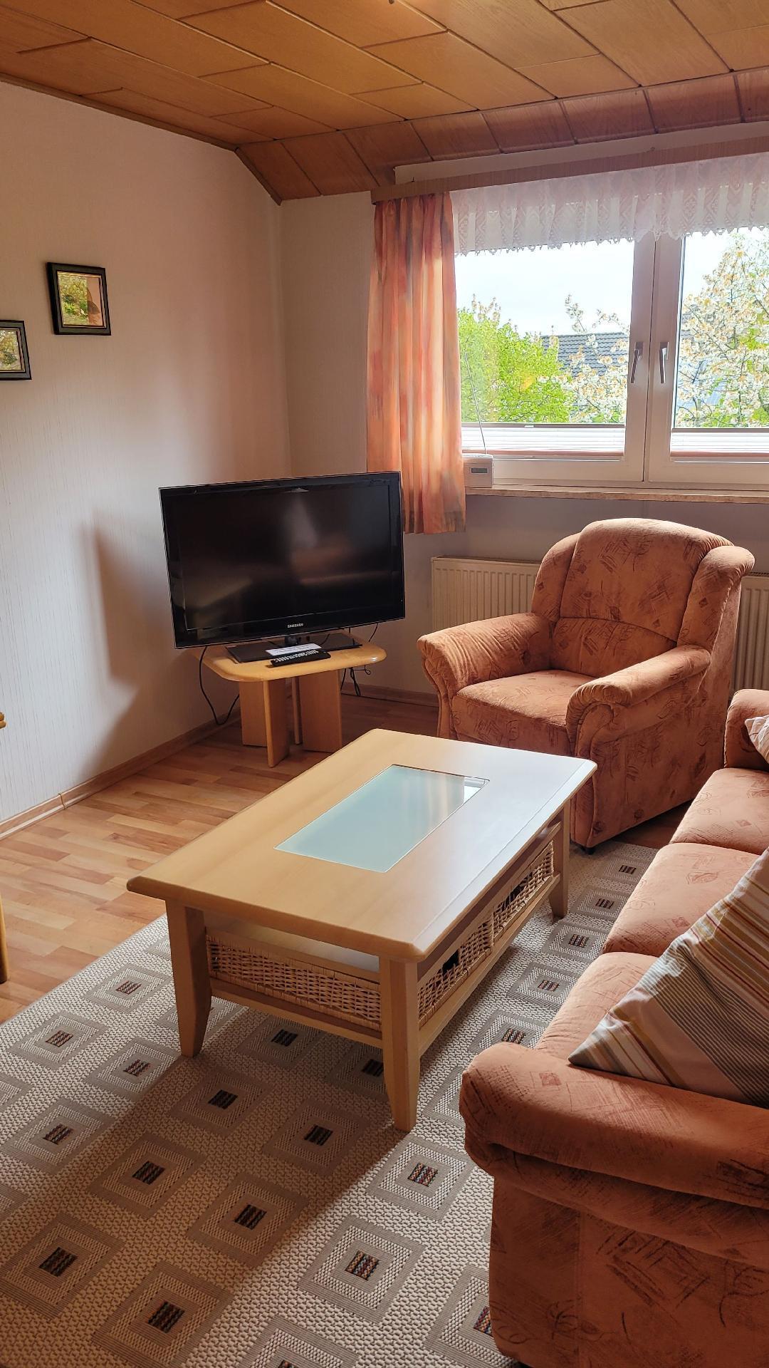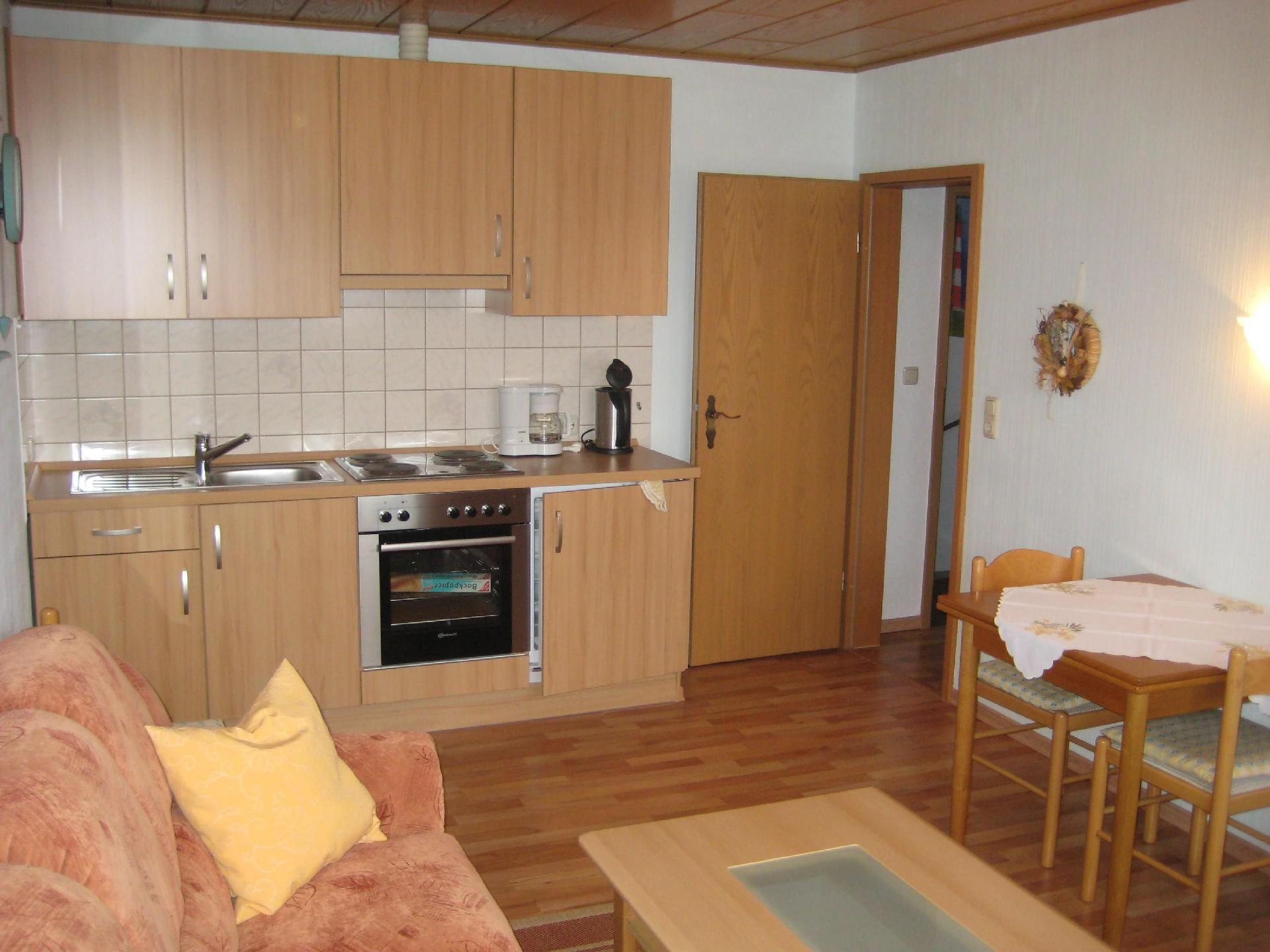 Die 42 m² große Wohnung ist für zwei Personen ausgerichtet und bietet Ihnen alle Annehmlichkeiten, die Sie für einen angenehmen Aufenthalt benötigen. Sie liegt im Obergeschoss des Haues. Das Erdgeschoss wird vom Vermieter bewohnt. Die Ferienwohnung verfügt über eine vollausgestattete Küche mit Herd, Backofen, Kaffeemaschine, Wasserkocher und Essecke. Im Wohnbereich befinden sich ein Flachbildfernseher, ein gemütliches Dreisitzersofa sowie ein Fernsehsessel. Das angrenzende Schlafzimmer bietet Ihnen ein Doppelbett mit zwei Metern Breite. Das Badezimmer ist mit einer Duschkabine, WC und Waschbecken mit Spiegel ausgestattet. Die Handtücher werden wöchentlich gewechselt.