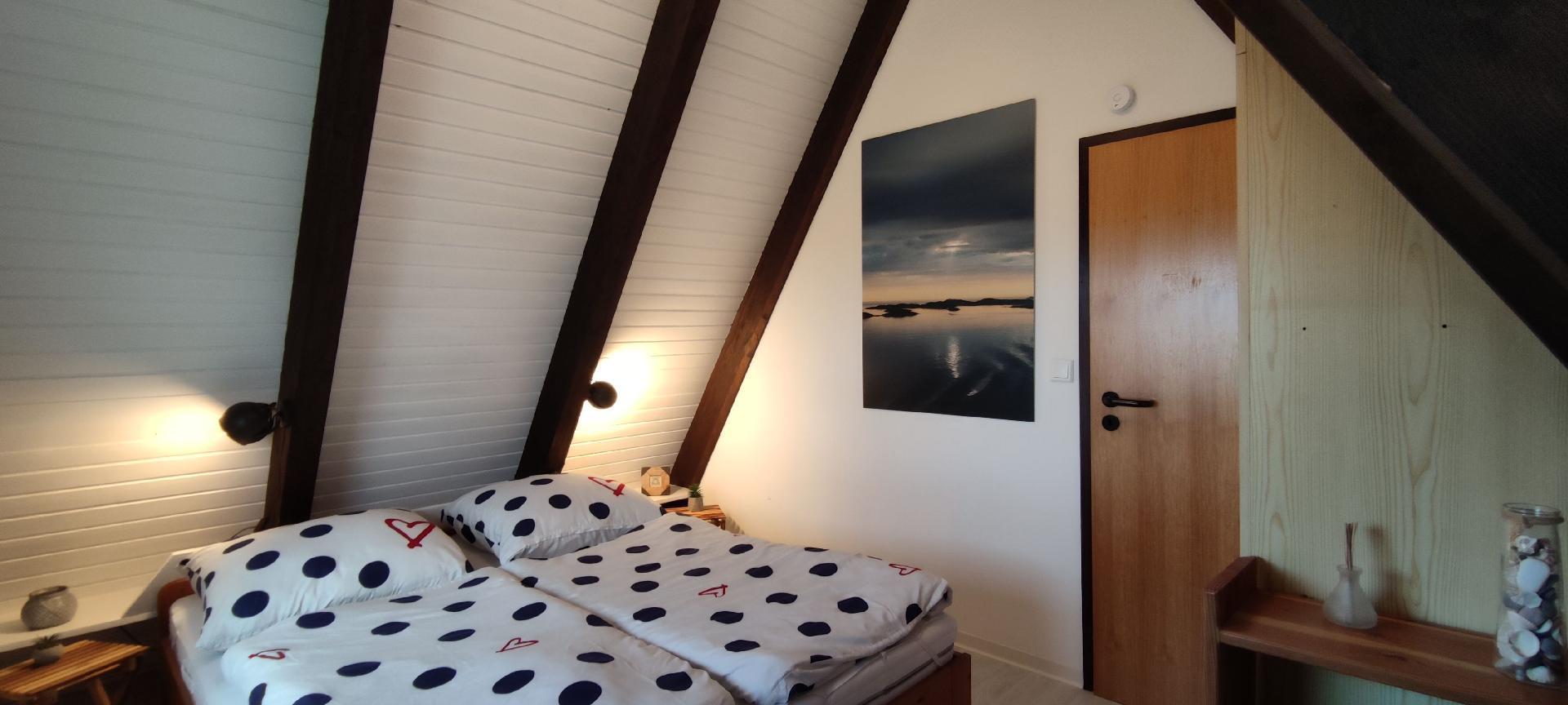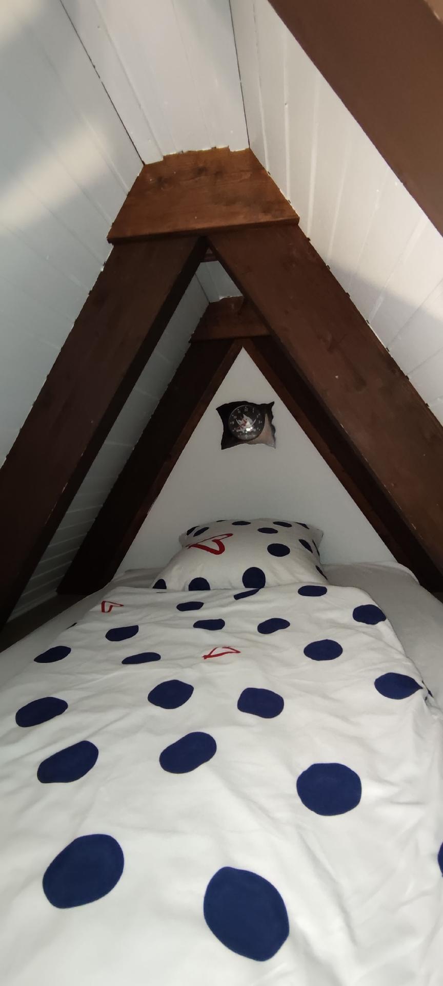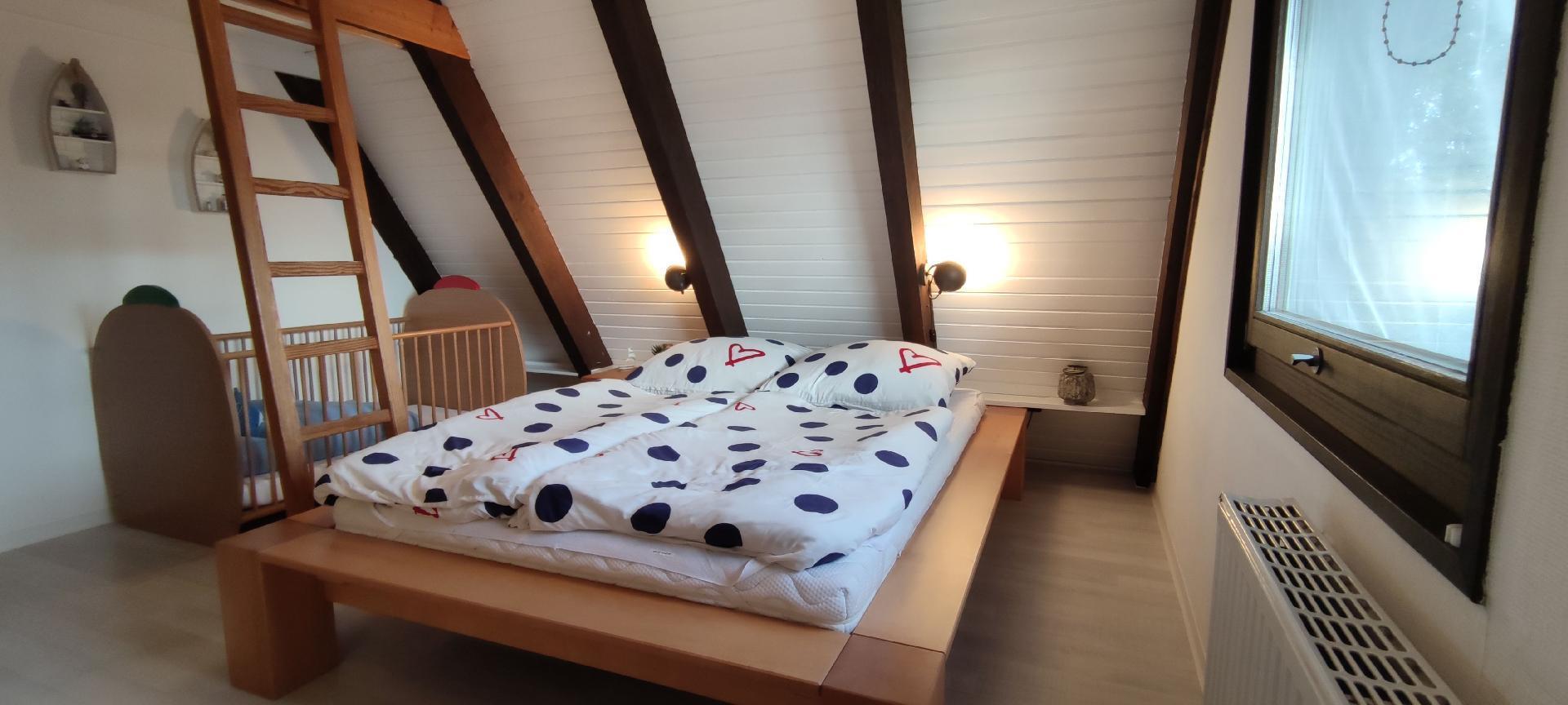 OG: Zwei Doppelbettschlafzimmer und ein Schlafraum auf dem Spitzboden, dieser ist nur über eine steile Leiter erreichbar. In einem der Schlafzimmer befindet sich zudem ein Babybett.