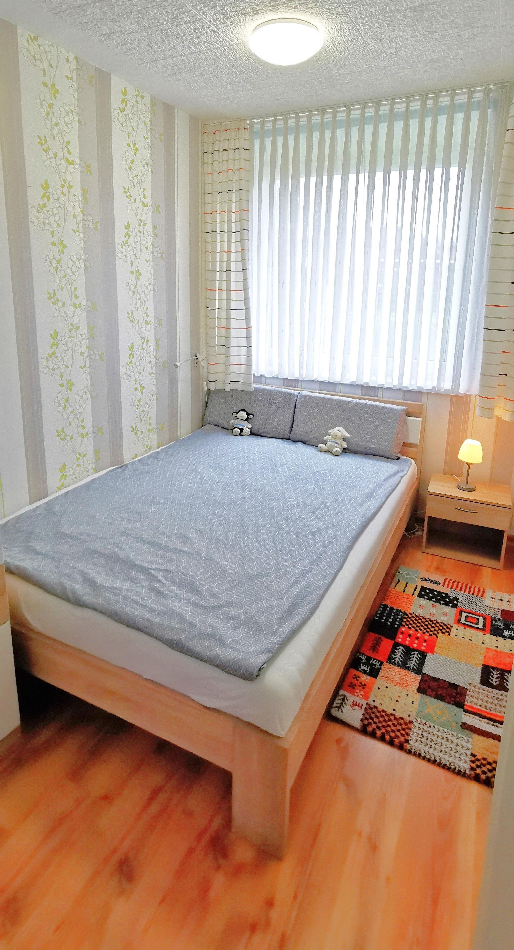 Diese 36 qm große Ferienwohnung liegt im Erdgeschoss und ist für 3 Personen geeignet. Sie bietet ein separates Schlafzimmer mit Doppelbett (140x200), ein Wohnbereich mit Couchgarnitur mit Schlafcouch und einer Essecke, Kabel-TV mit Flachbildschirm / Stereoananlage und einen Zugang zum West-Balkon mit Comfort Outdoor-Möbeln. Die Küche ist mit einer Küchenzeile, 4-Platten-E-Herd mit Ceranfeld u.Bachofen ( Umluft, Ober-und Unterhitze) und Mikrowelle mit Grill usw. ausgestattet. Im Badezimmer ist eine Dusche, Waschbecken und WC. Sie haben einen PKW-Stellplatz. Das Mitbringen von Haustieren ist hier nicht gestattet. Fahrräder können am Hallenbad im Fahrradständer abgestellt werden. Kinderbett und Hochstuhl auf Anfrage (Kostenlos).