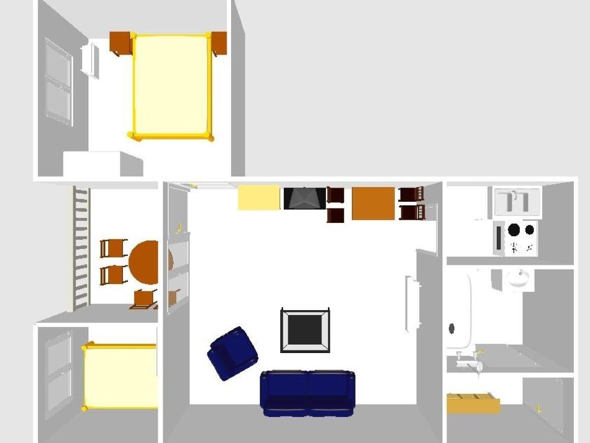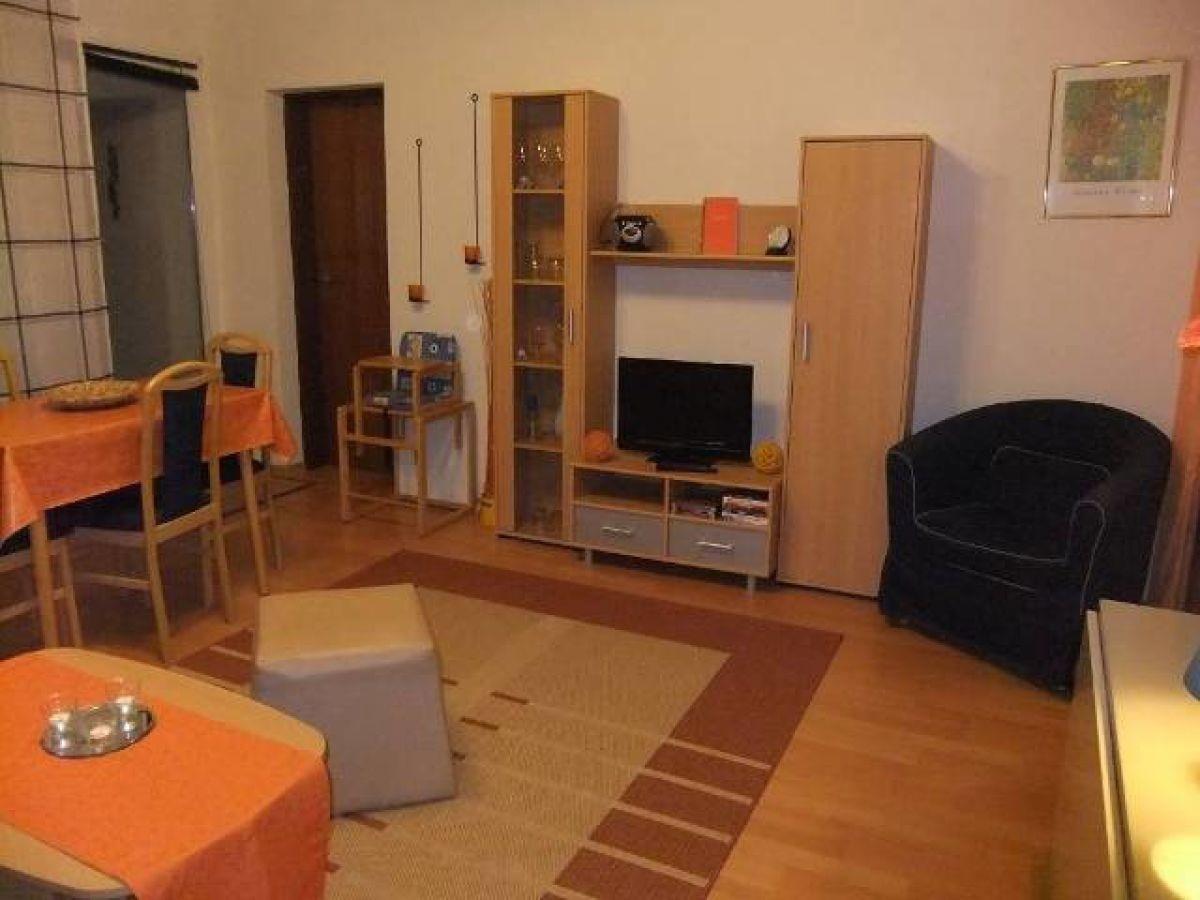 Die 44 qm große Ferienwohnung befindet sich im ersten Obergeschoss und hat eine kleine separate Küche Geschirrspüler, (Mikrowelle, Kühlschrank mit großem separaten Gefrierfach, Ceranfeld und Backofen), eine helles, gemütliches Wohnzimmer (TV, Radio) mit Sitzecke und separatem Essplatz. Zwei separate, mit Laminat ausgelegte Schlafzimmer sind vorhanden, eines mit Doppelbett und eines mit 1,40 m x 2,00 m Bett. Das Bad ist mit Dusche und WC ausgestattet. Dergleichen gibt es eine Garderobe und eine möblierte Loggia. Das Mitbringen von Haustieren ist möglich. Hier sind ein Kinderbett und ein Hochstuhl vorhanden.Über W-Lan können Sie ins Internet.