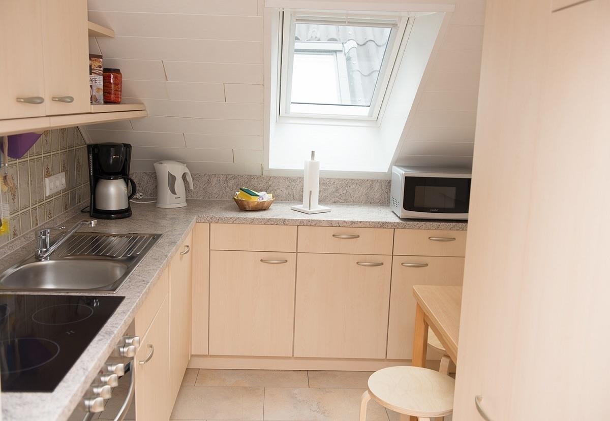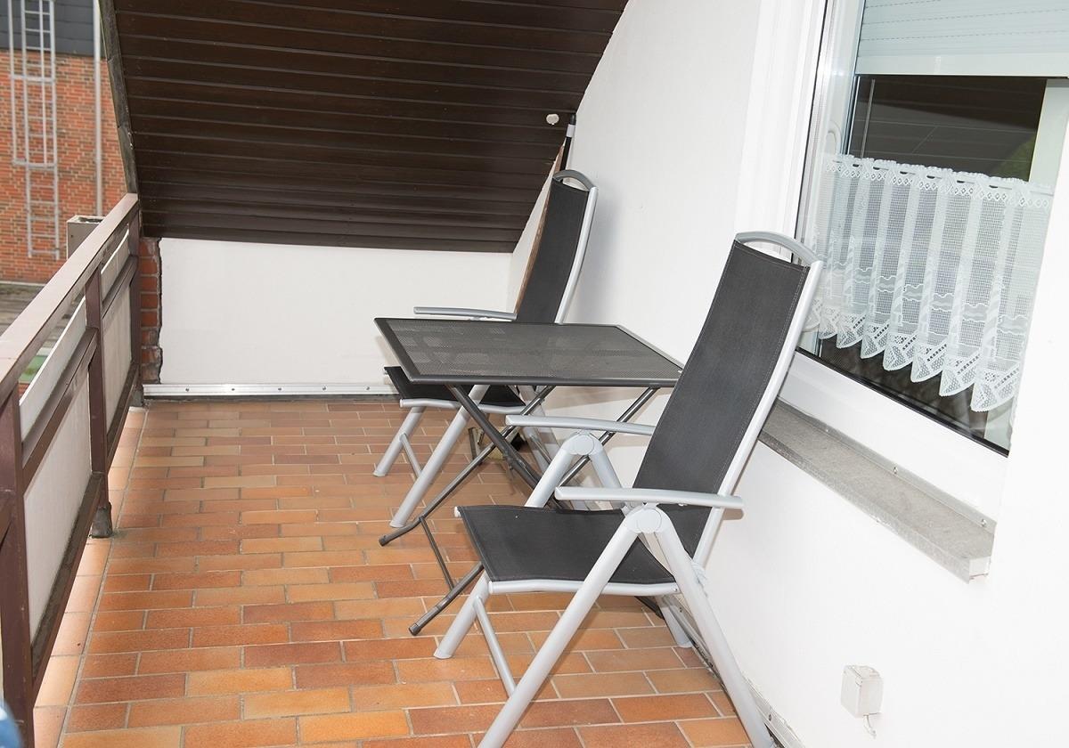 Die Ferienwohnung liegt im 2.Obergeschoss der Appartementanlage und hat ein Wohnzimmer mit Sitzecke, Kabel-TV, Radio und Essecke, ein Schlafzimmer mit zwei Einzelbetten, ein Schlafzimmer mit einem Doppelbett und einem Kinderbett, eine separate Küche (4-Plattenherd mit Backofen, Mikrowelle, Geschirrspüler, Kaffeemaschine, Wasserkocher, Toaster), ein Bad mit WC und Badewanne sowie einen Balkon mit Gartenmöbeln. Über W-Lan-Freifunk können Sie ins Internet. Das Mitbringen von Haustieren ist gegen Gebühr gestattet. Ein Hochstuhl ist vorhanden.