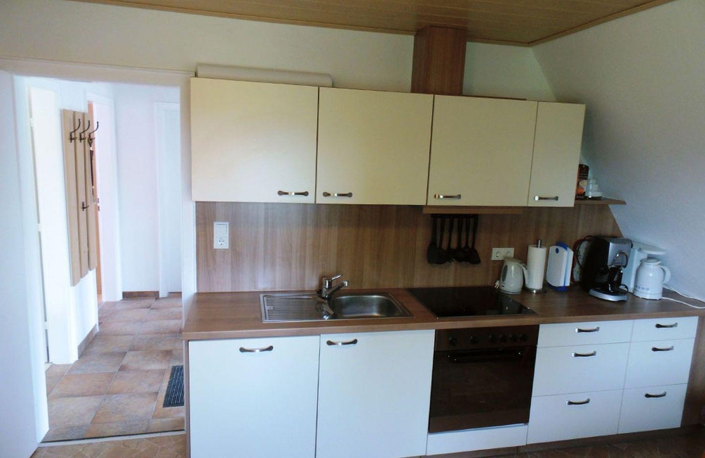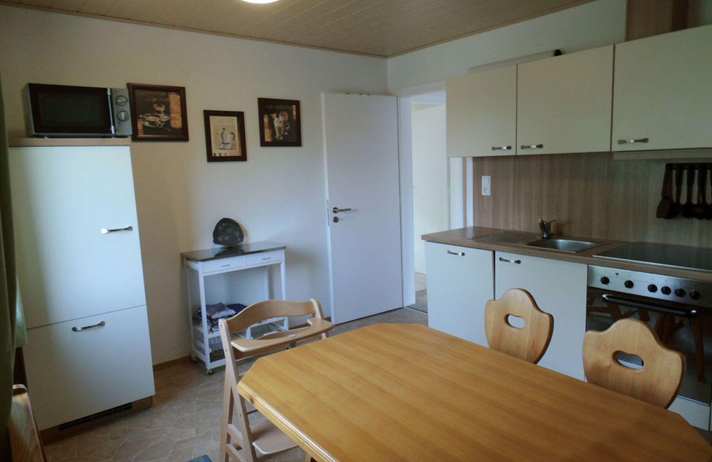In der Wohnküche, die zur Selbstversorgung komplett ausgestattet ist (mit Ceranherd, Backofen, Spülmaschine, Kaffeemaschine, Toaster, Wasserkocher uvm.) können Sie gemütlich frühstücken und die anderen Mahlzeiten am Tag bequem zubereiten.