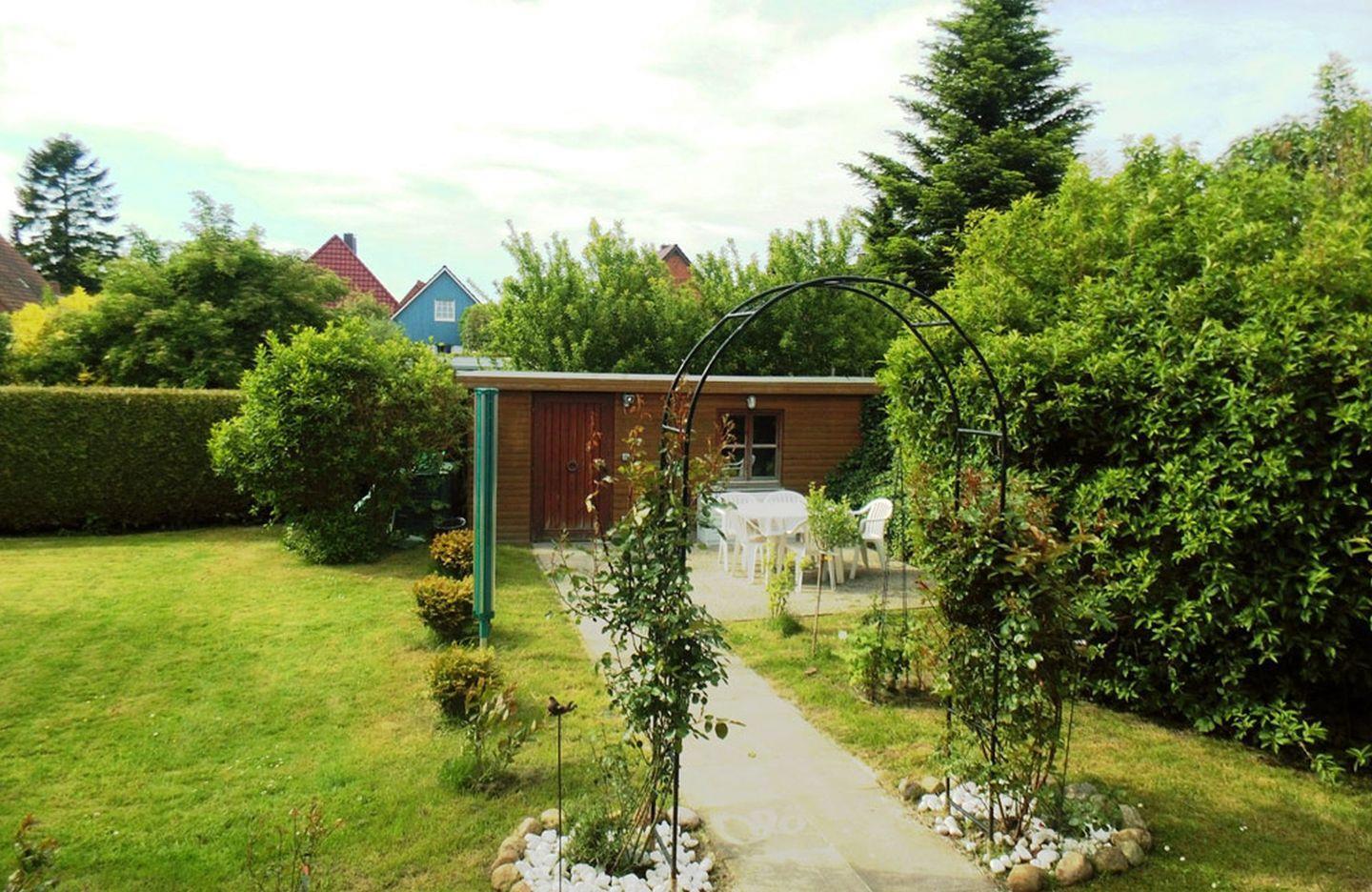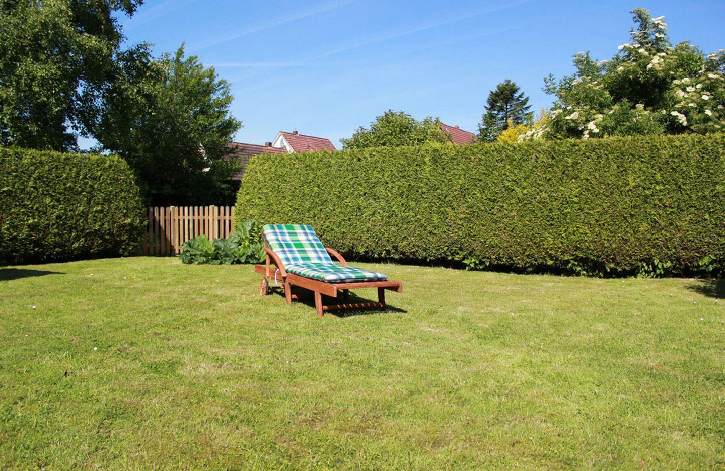 Im komplett von einer Hecke umschlossenen Garten hinter dem Haus befindet sich die große Rasen- und Liegefläche und eine separate Terrasse mit Sitzmöbeln und einer Grillmöglichkeit.