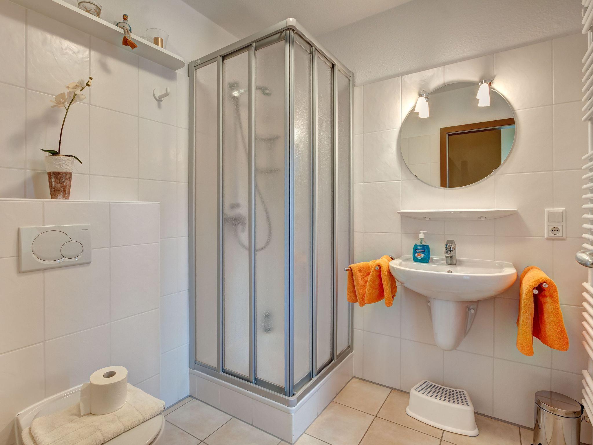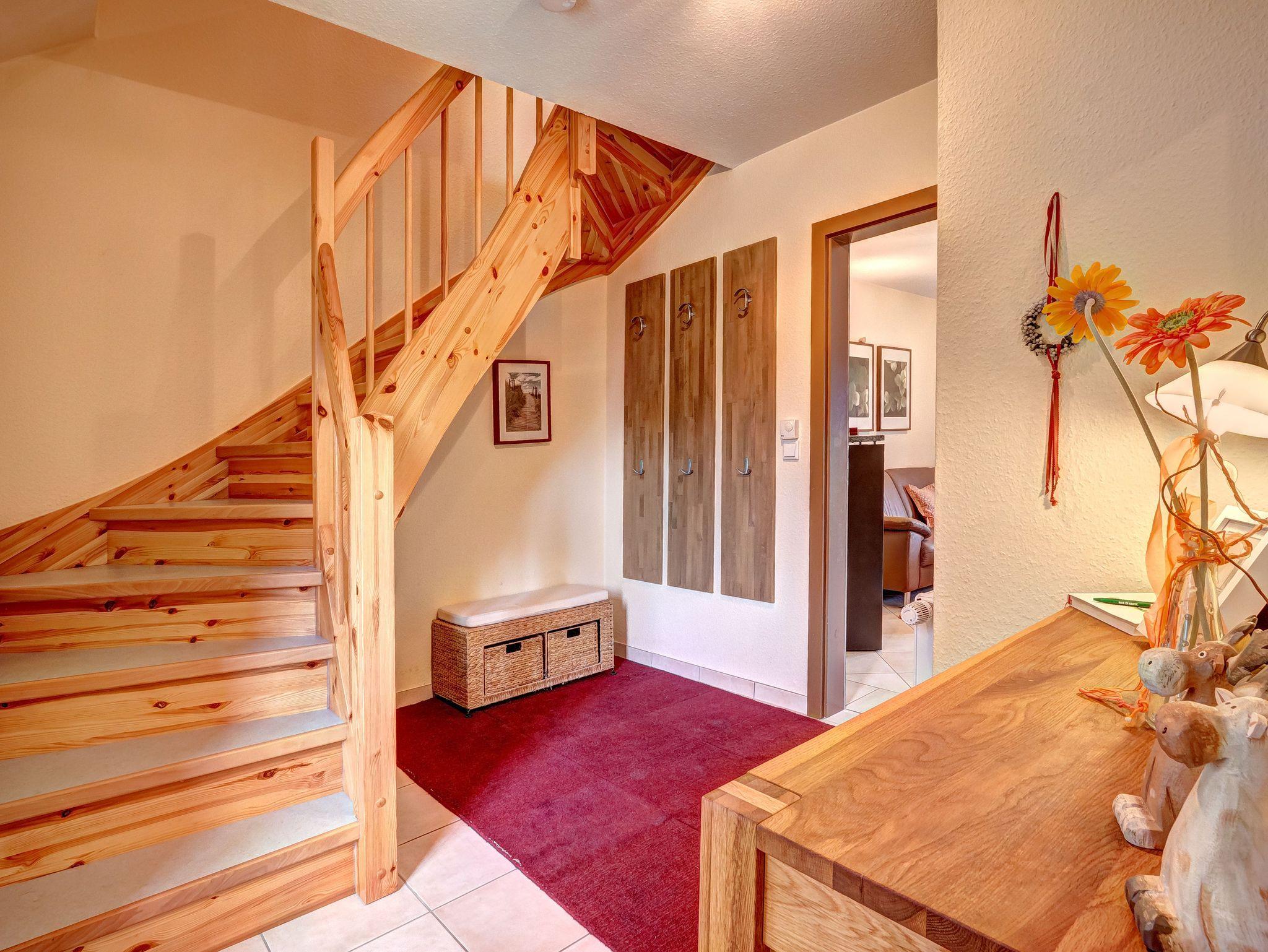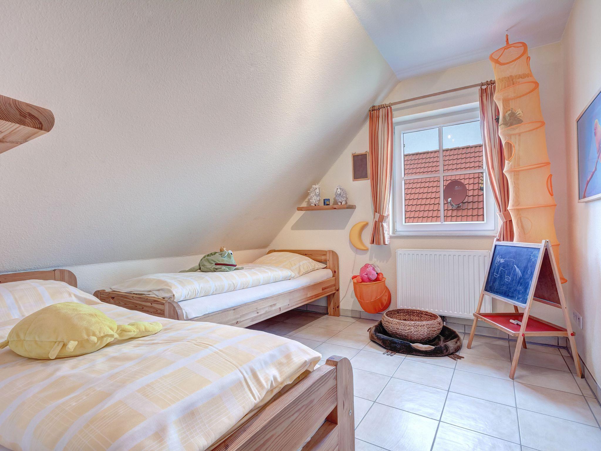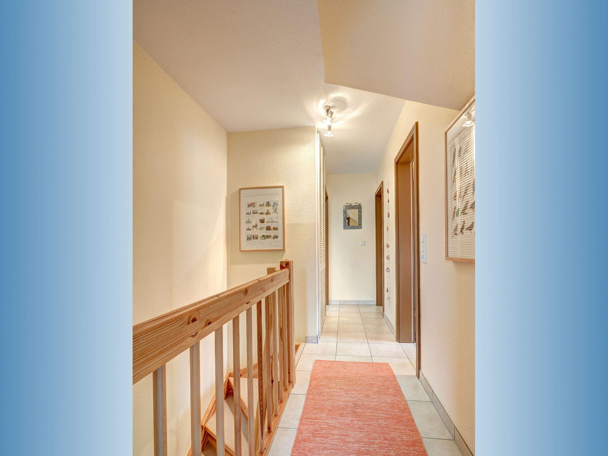 Die Schlafräume finden sich im Oberschoß. Das erste Schlafzimmer verfügt über ein Doppelbett. Im 2. Schlaffzimmer stehen 2 Einzelbetten. Der 3. Schlafraum weist 1 Einzelbett auf. Des Weiteren finden Sie hier oben ein zweites Bad mit Dusche und WC.
