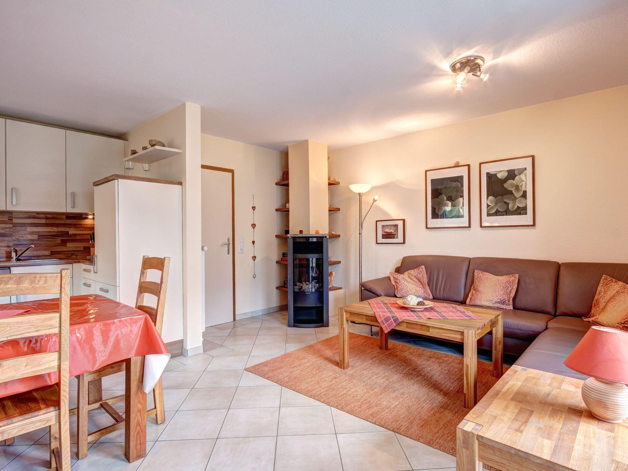 Im Erdgeschoß findet sich der großzügige Wohnraum mit gemütlicher Sitzecke und Flat-TV. Daran angeschlossen folgt die offene Küche mit Essbereich. Außerdem finden Sie hier ein Duschbad mit WC.