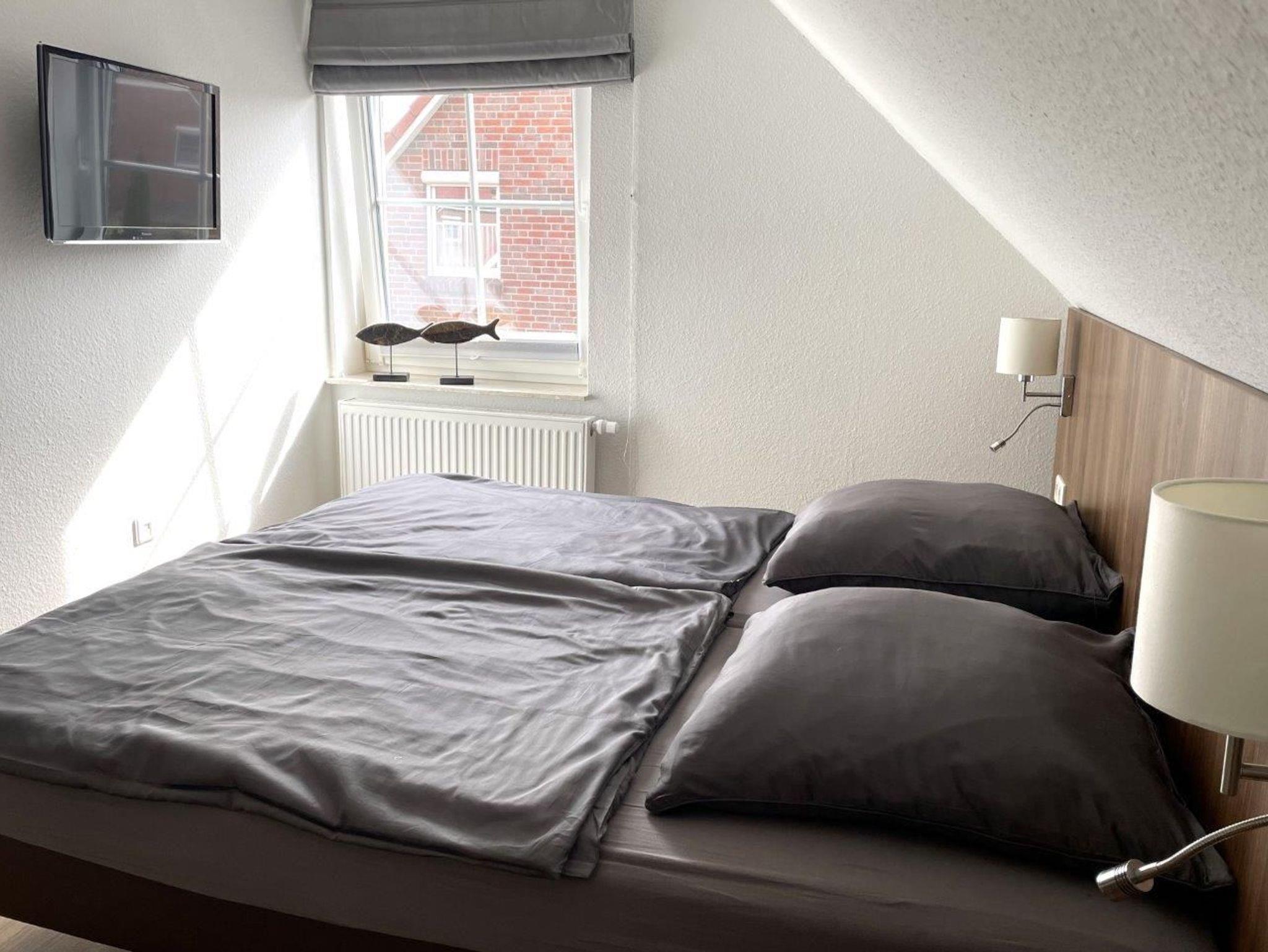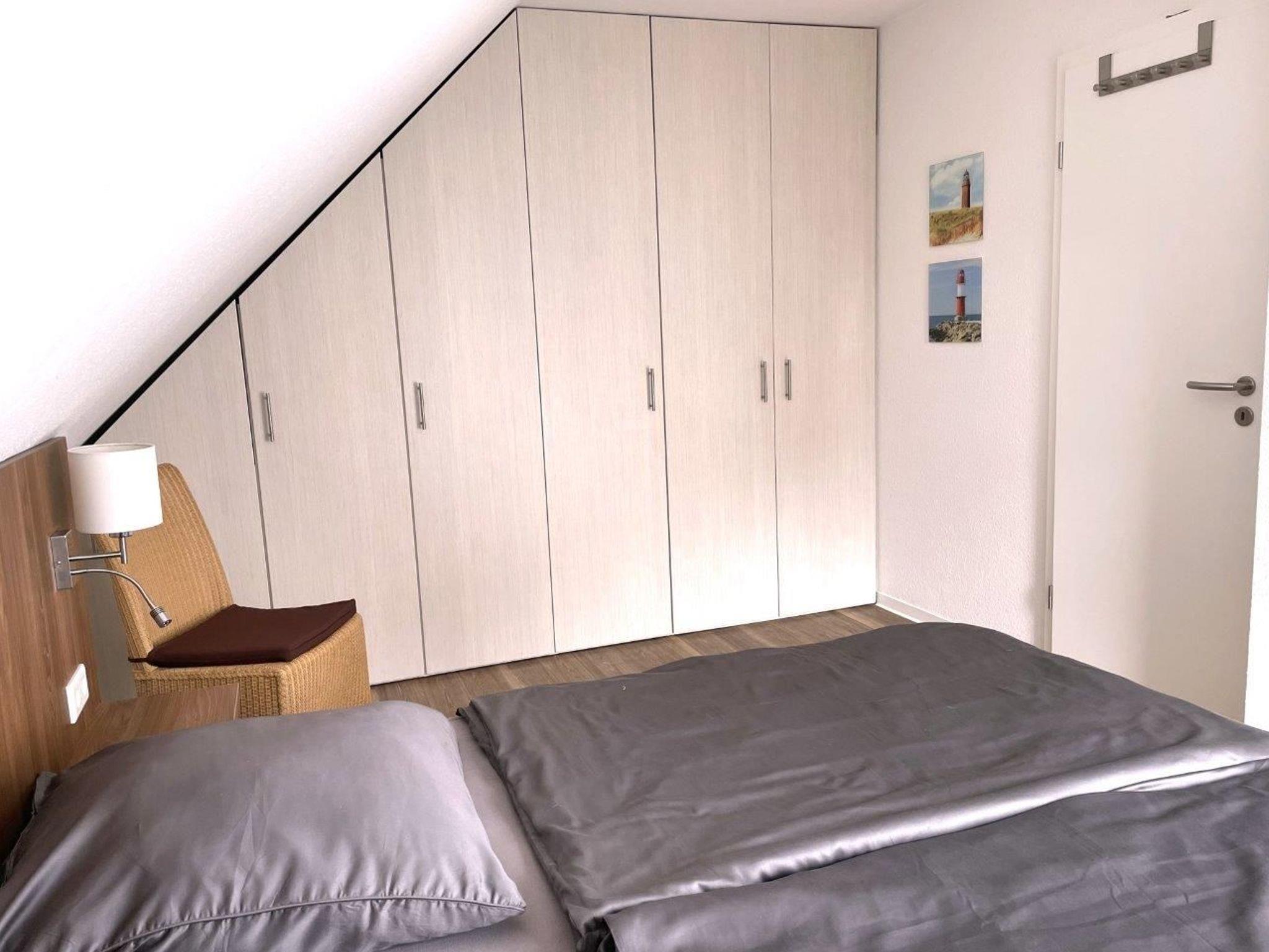 Schlafraum 1 mit Doppelbett, großem Kleiderschrank und LED-Flachbildfernseher.