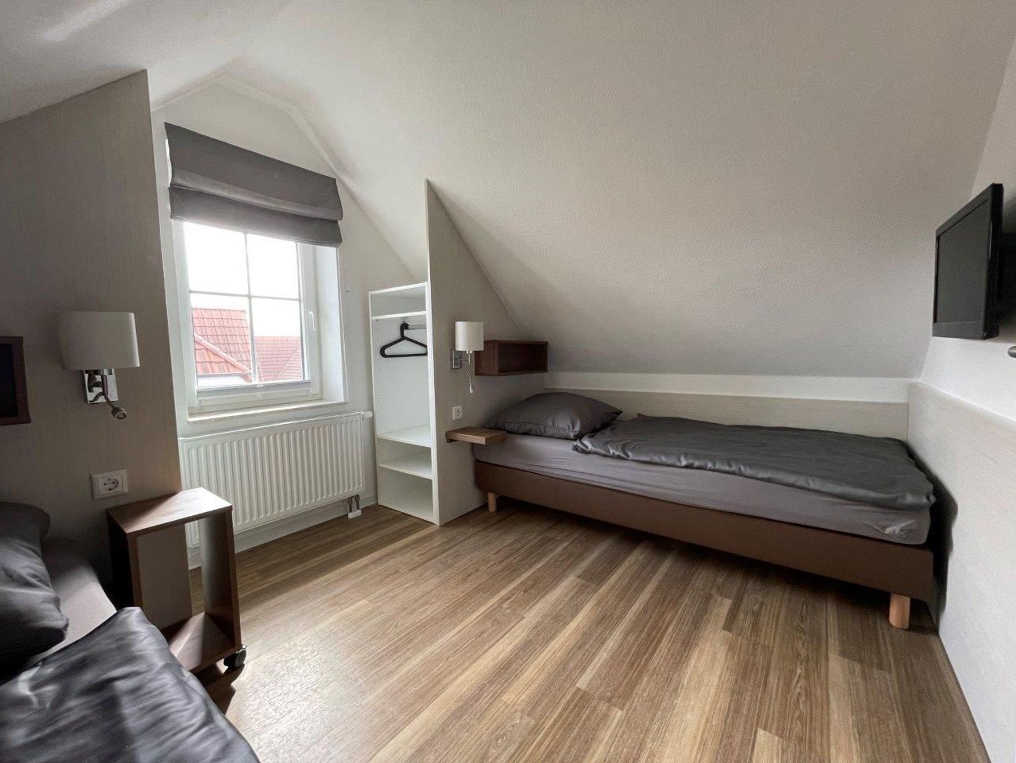 Schlafraum mit 2 Einzelbetten, Kleiderschrank und Smart-TV.