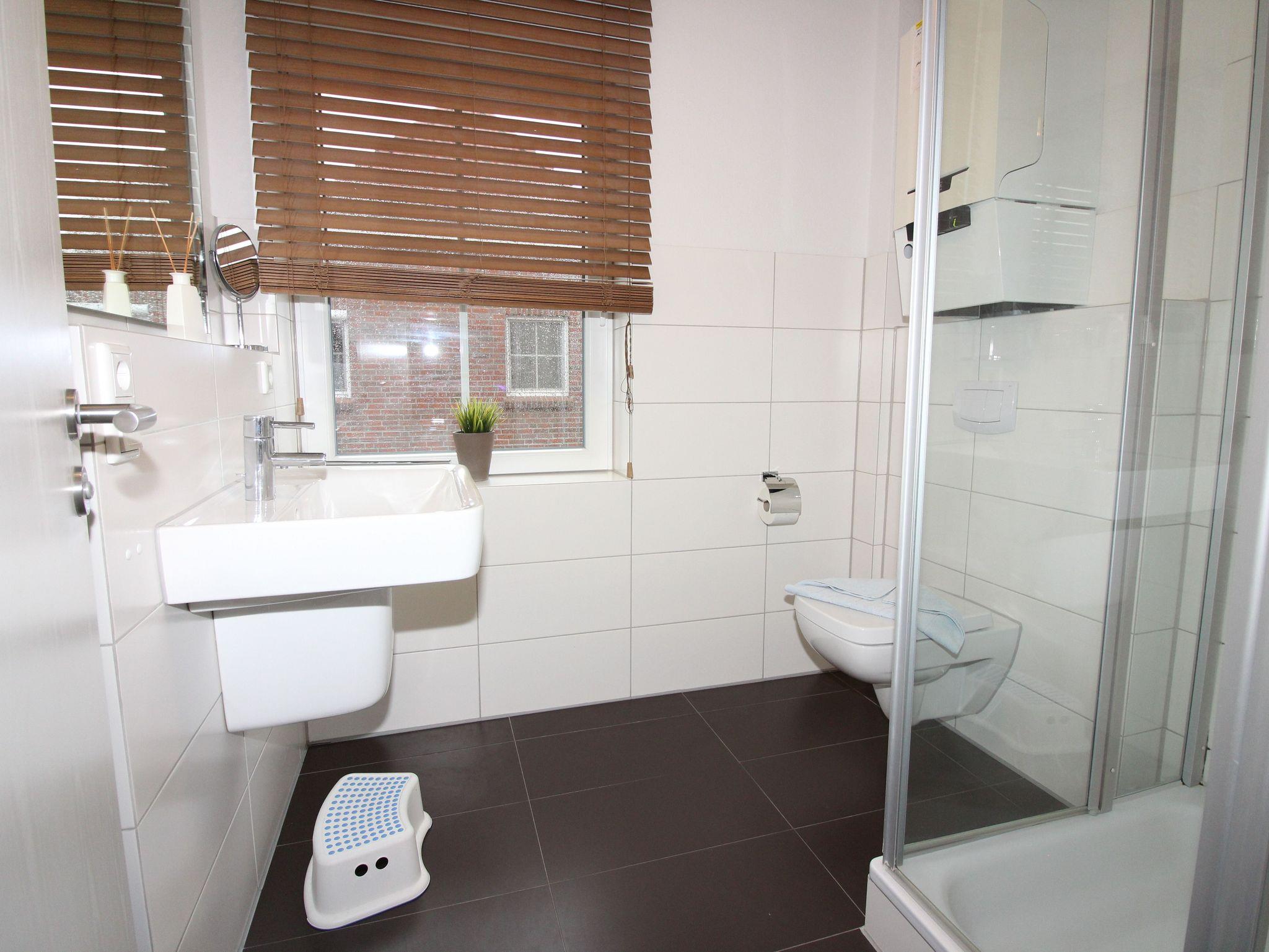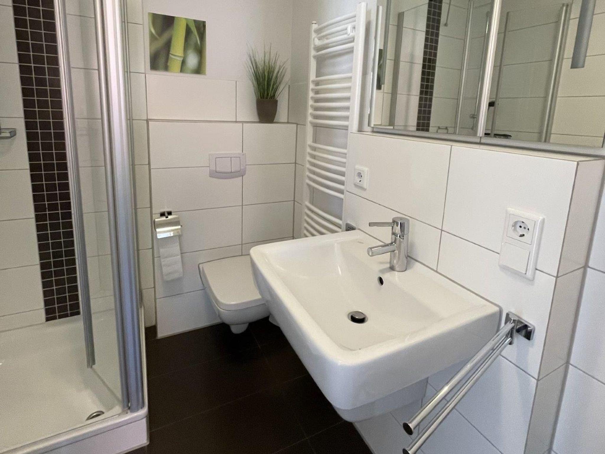 Hochwertig ausgestattetes Bad mit Dusche (Echtglas), Handtuchheizkörper und Fußbodenerwärmung.