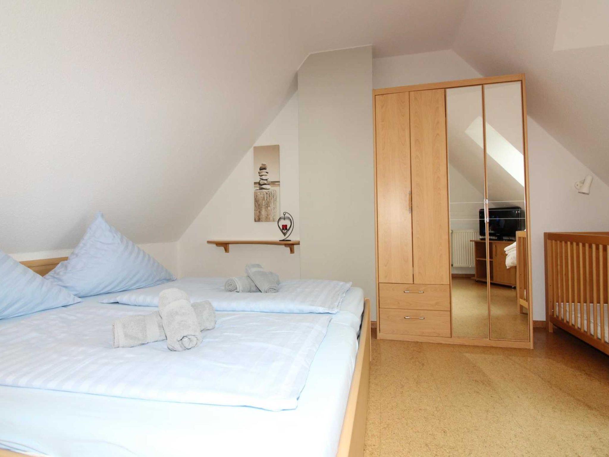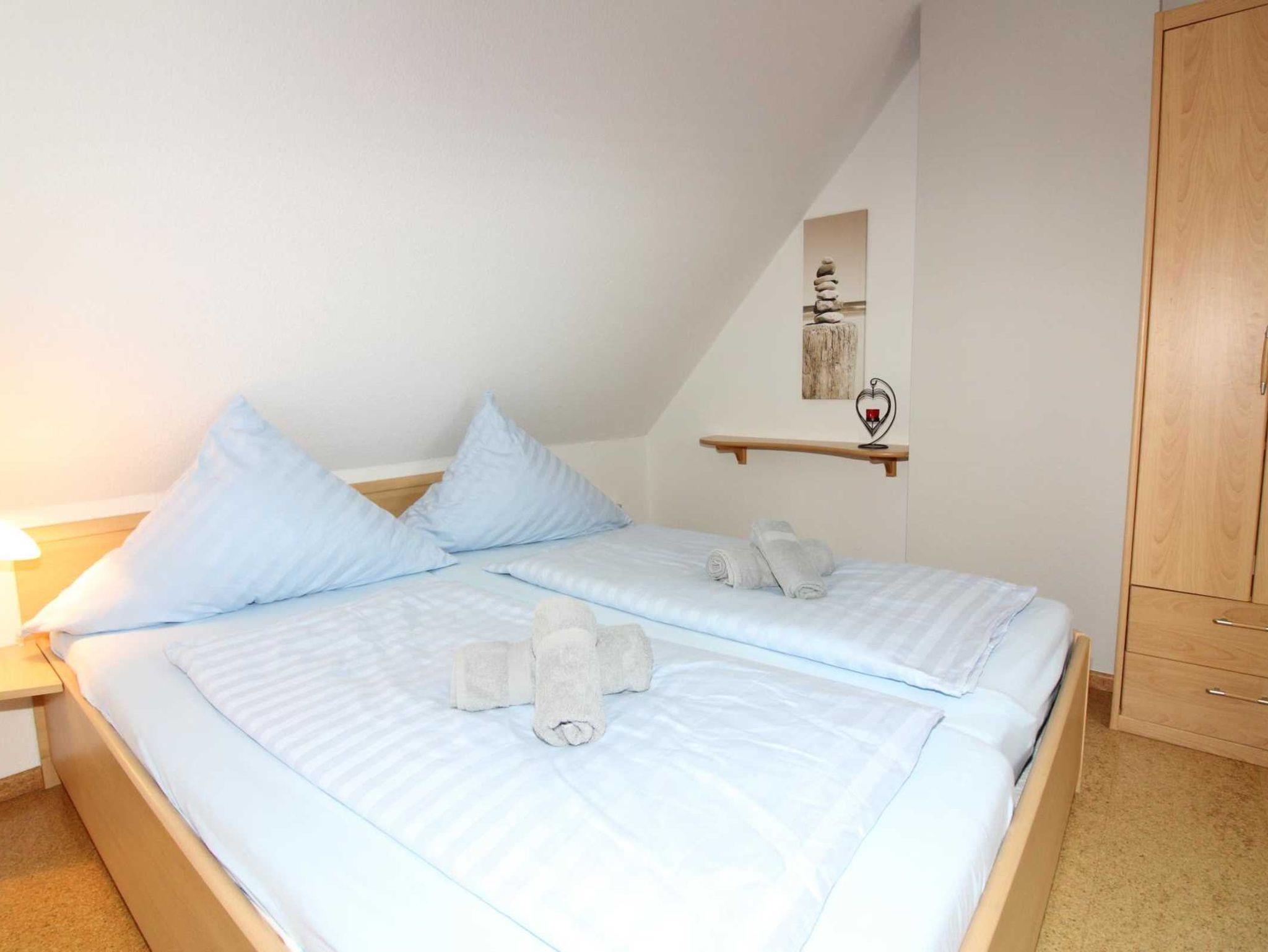 Die bis auf Küche, Bad, Garderobe und Abstellraum mit trittschalldämmendem Kork ausgelegte Wohnung besitzt zwei Schlafzimmer mit Doppelbett, bzw. mit zwei Einzelbetten. Mit dem Spitzboden sind somit drei Schlafräume für bis zu 6 Personen verfügbar, alle mit Verdunkelungsrollos versehen.