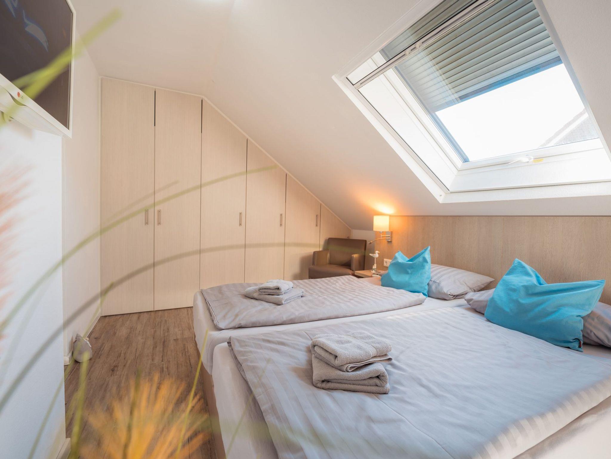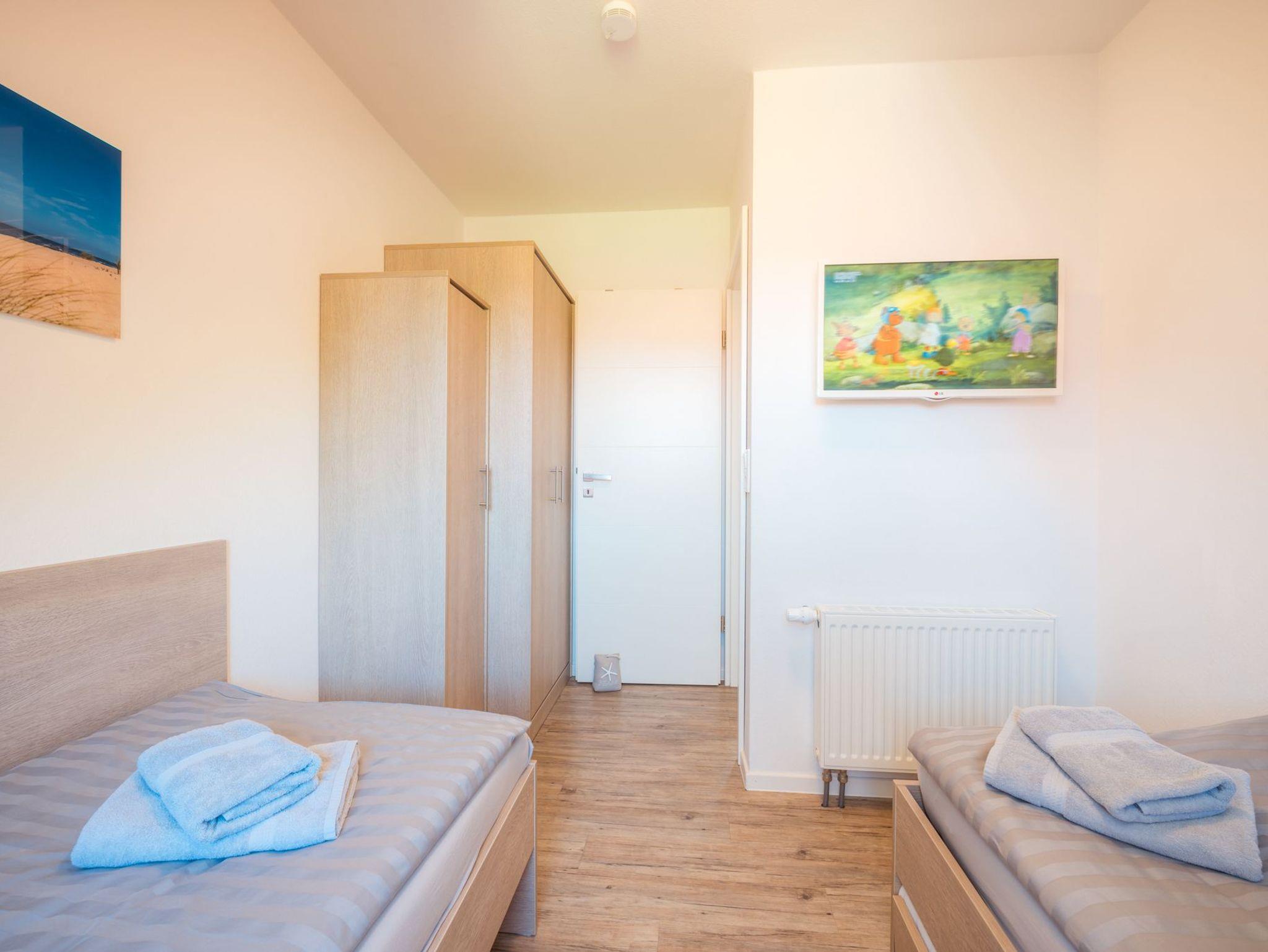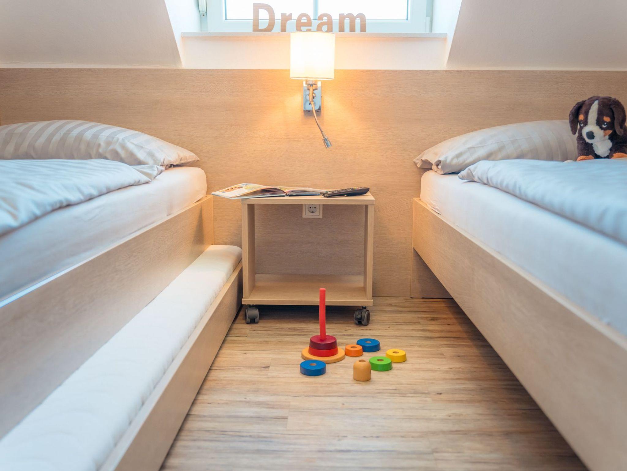 ein Schlafraum mit zwei Einzelbetten und einem Ausziehbett am Boden, 32HD-TV