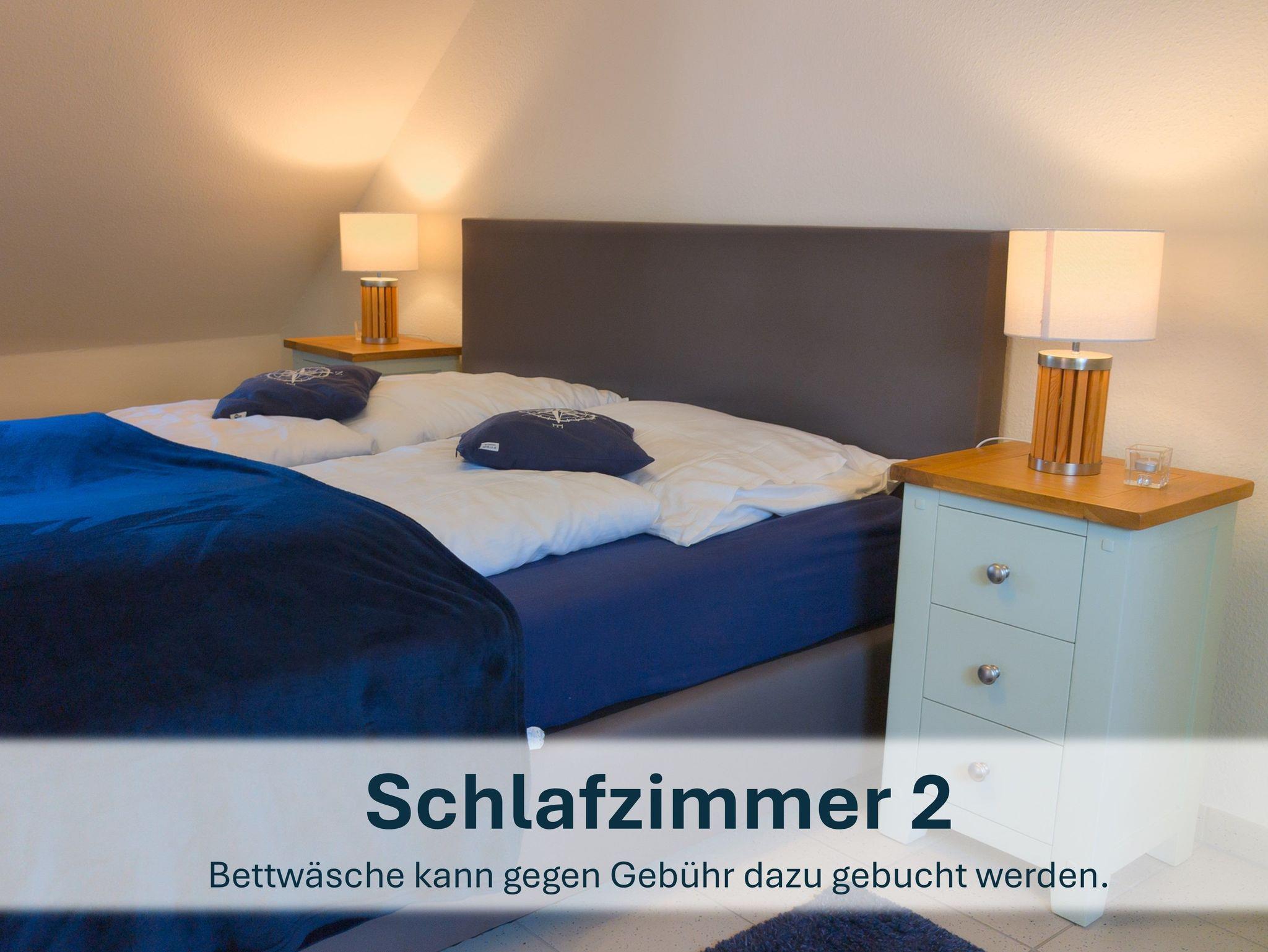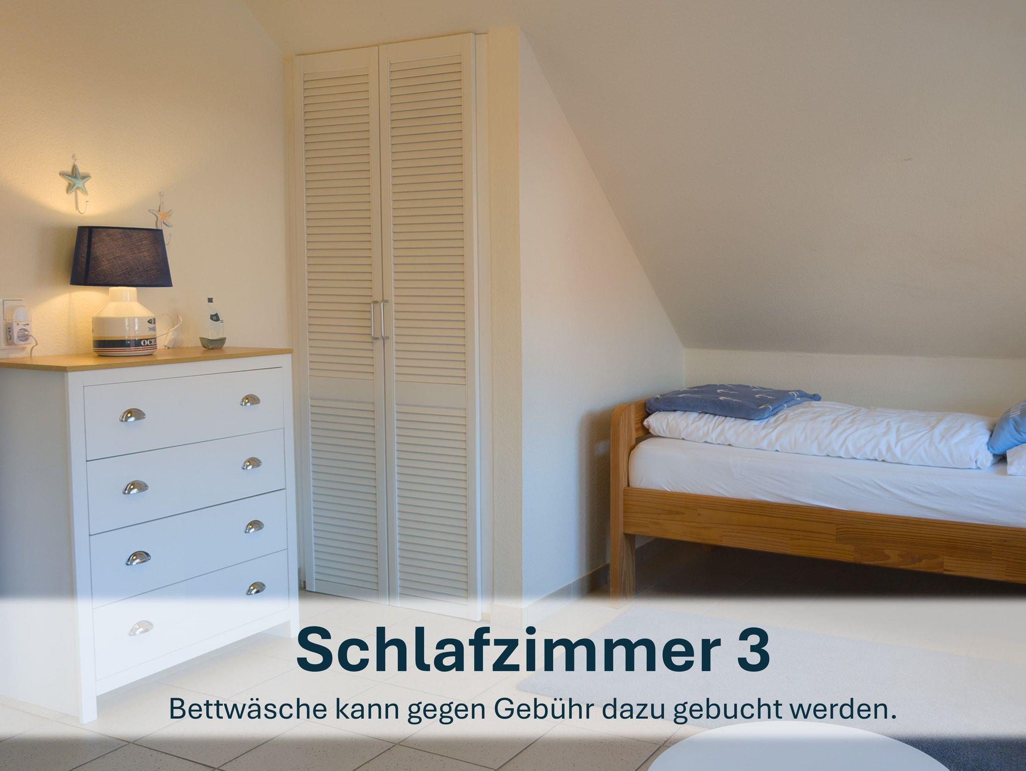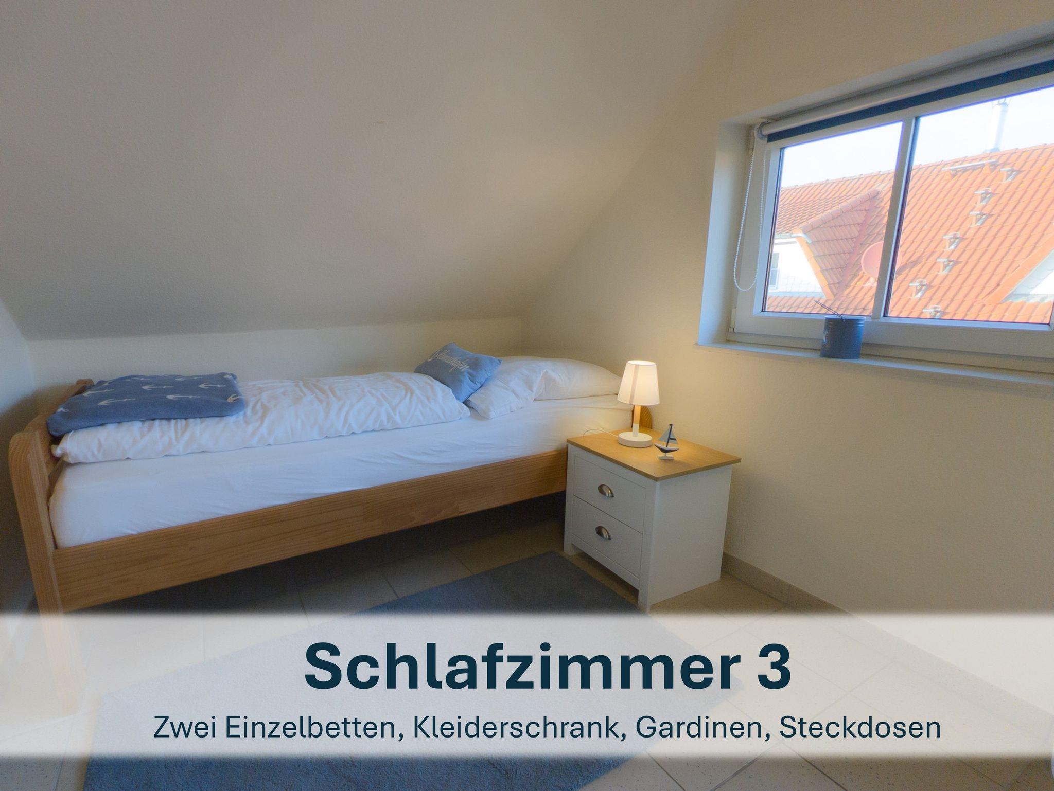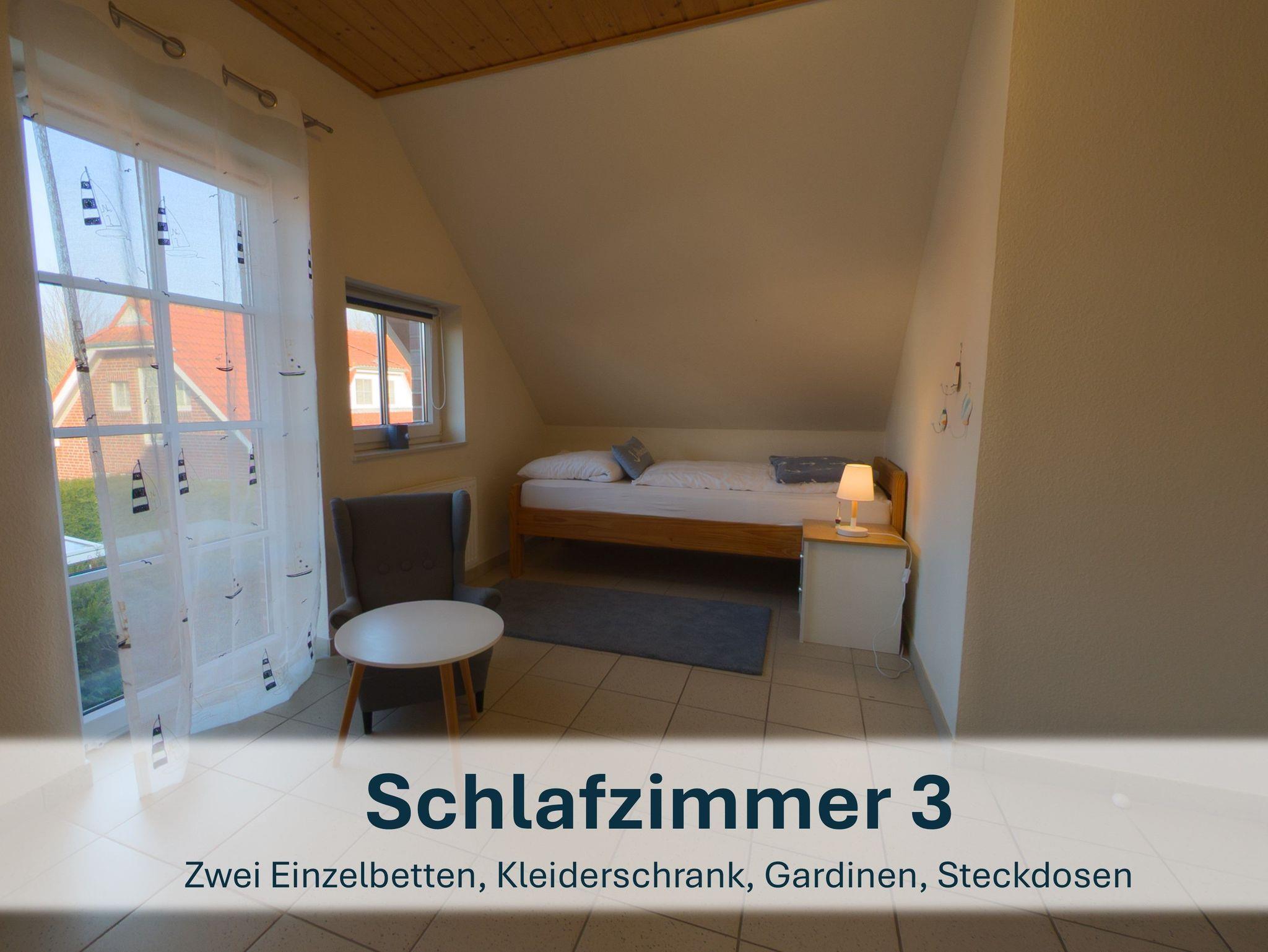 Über die Holztreppe im Flur gelnagen Sie in das Obergeschoss des Hauses.Hier befinden sich zwei weitere Schlafzimmer: ein Kinderzimmer mit zwei Einzelbetten und einem kleinen Schreibtisch, sowie ein Schlafzimmer mit Doppelbett und einer Kommode.