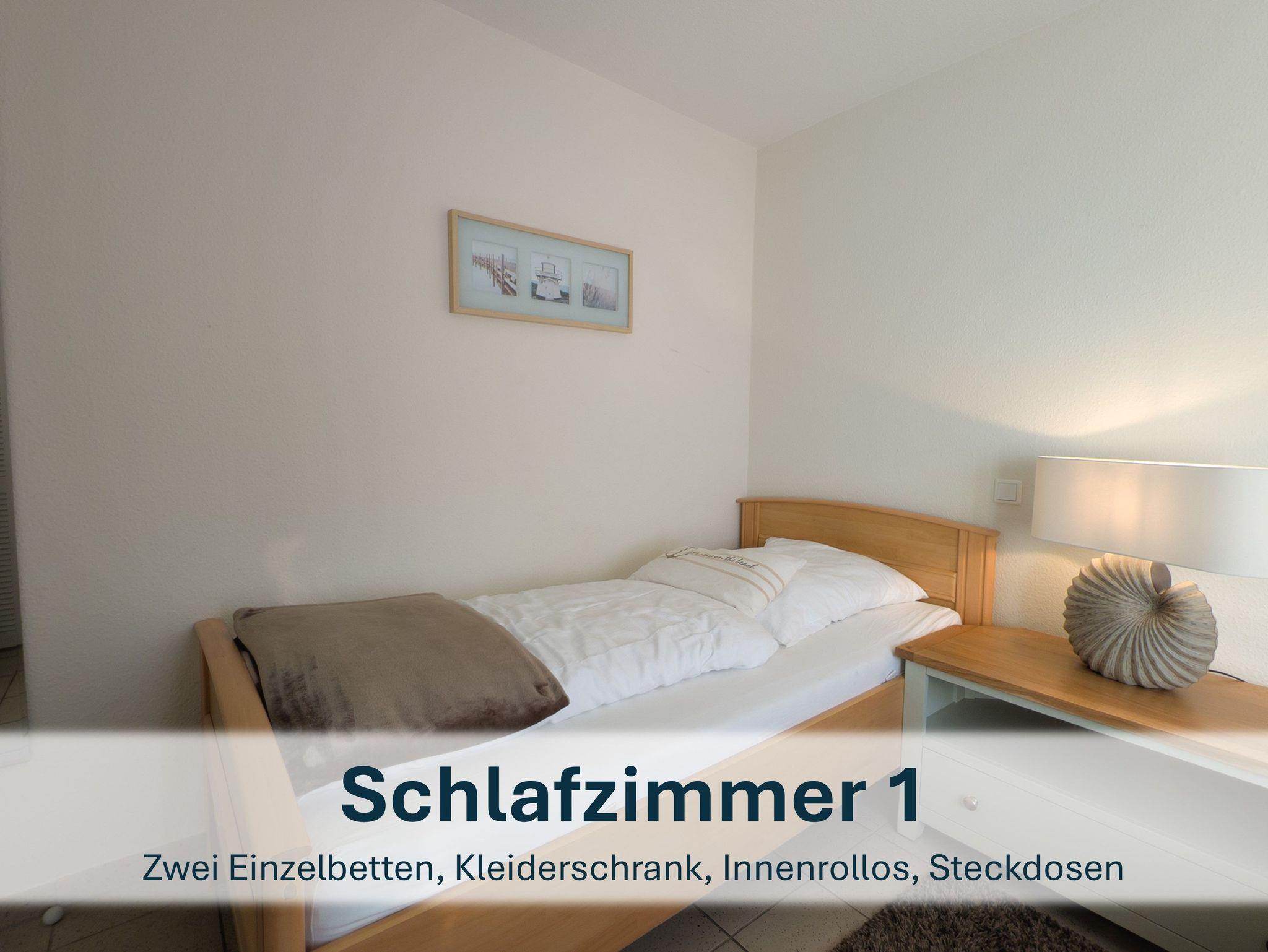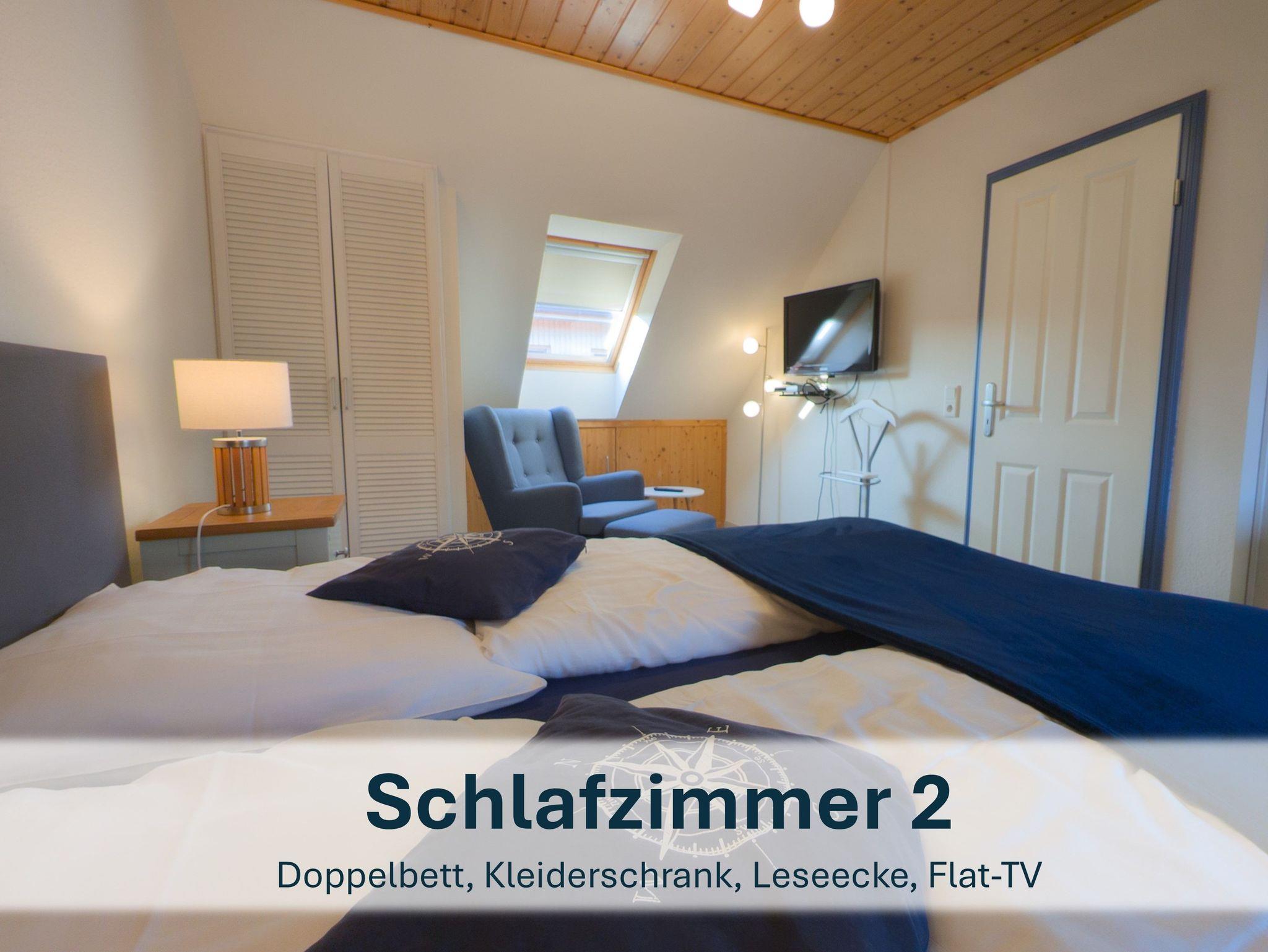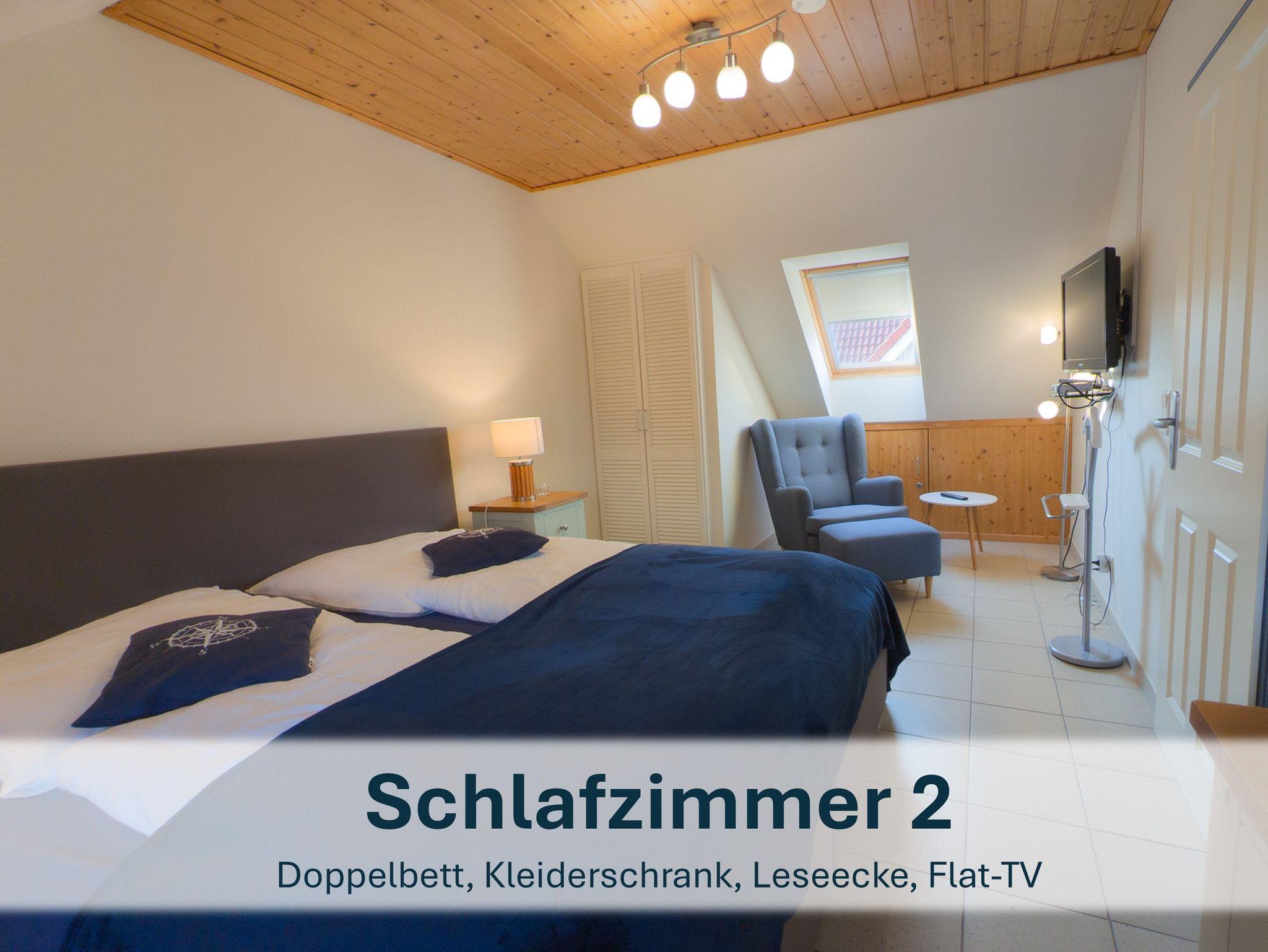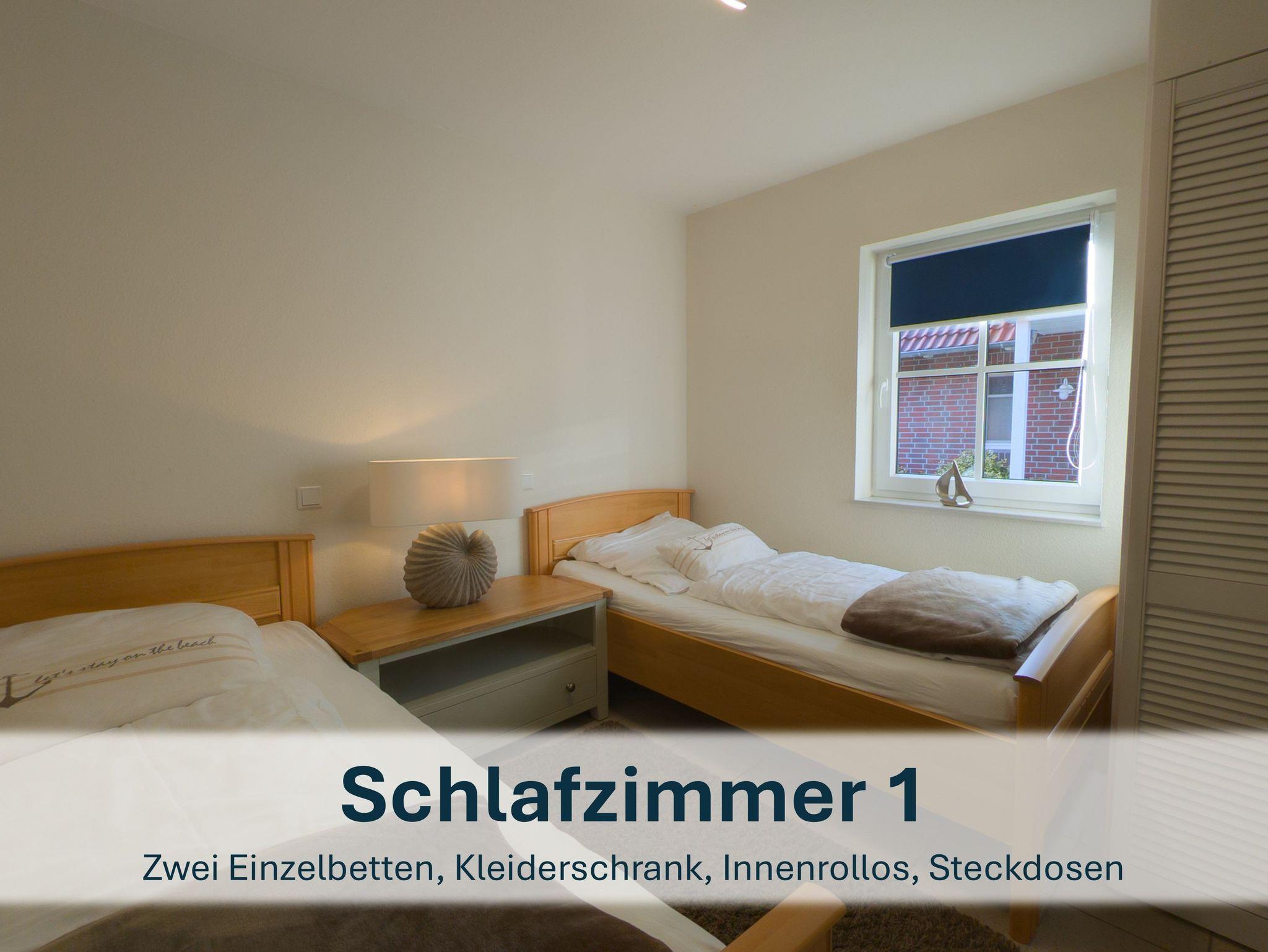 Über die Holztreppe im Flur gelnagen Sie in das Obergeschoss des Hauses.Hier befinden sich zwei weitere Schlafzimmer: ein Kinderzimmer mit zwei Einzelbetten und einem kleinen Schreibtisch, sowie ein Schlafzimmer mit Doppelbett und einer Kommode.