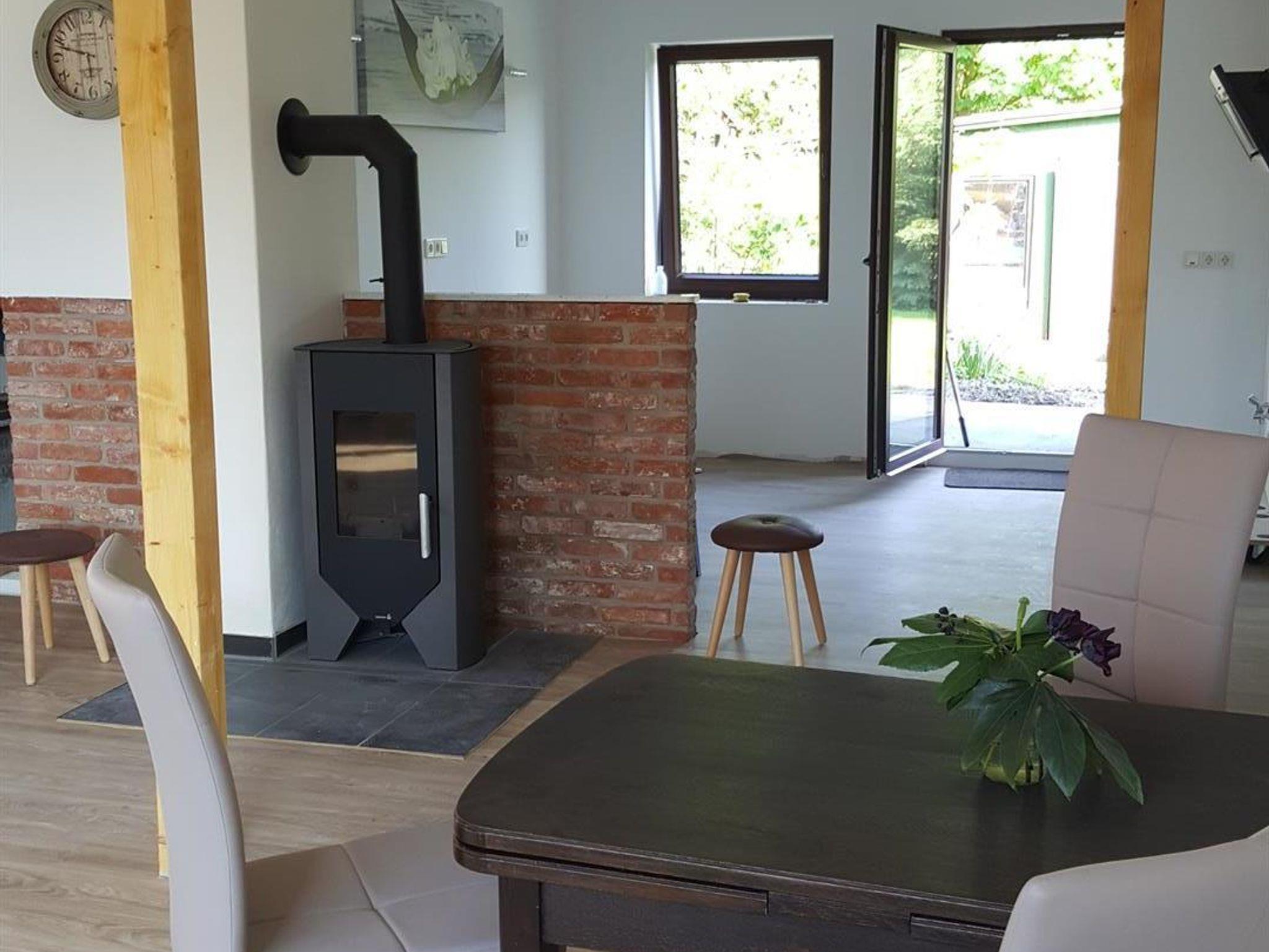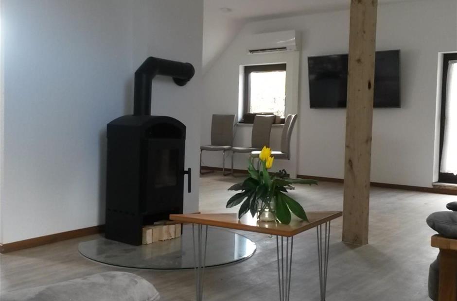 Im Erdgeschoss befindet sich die große, neugestaltete Ferienwohnung für bis zu 2 Personen. Sie hat eine große und helle Wohnküche, eine gemütliche Wohnecke (Holz-Brennofen,großer Flachbild-TV mit Radio), eine Essecke, eine vollausgestattete Küchenzeile (Gasherd, Mikrowelle mit Heißluft-, Back- und Grillfunktion, Kühlschrank, Geschirrspüler, Kaffeemaschine, Toaster und Wasserkocher) und einem direktem Zugang auf die Terrasse. Ein Schlafzimmer mit Doppelbett. Ein Bad mit Dusche, WC und Waschtisch steht Ihnen zur Verfügung.