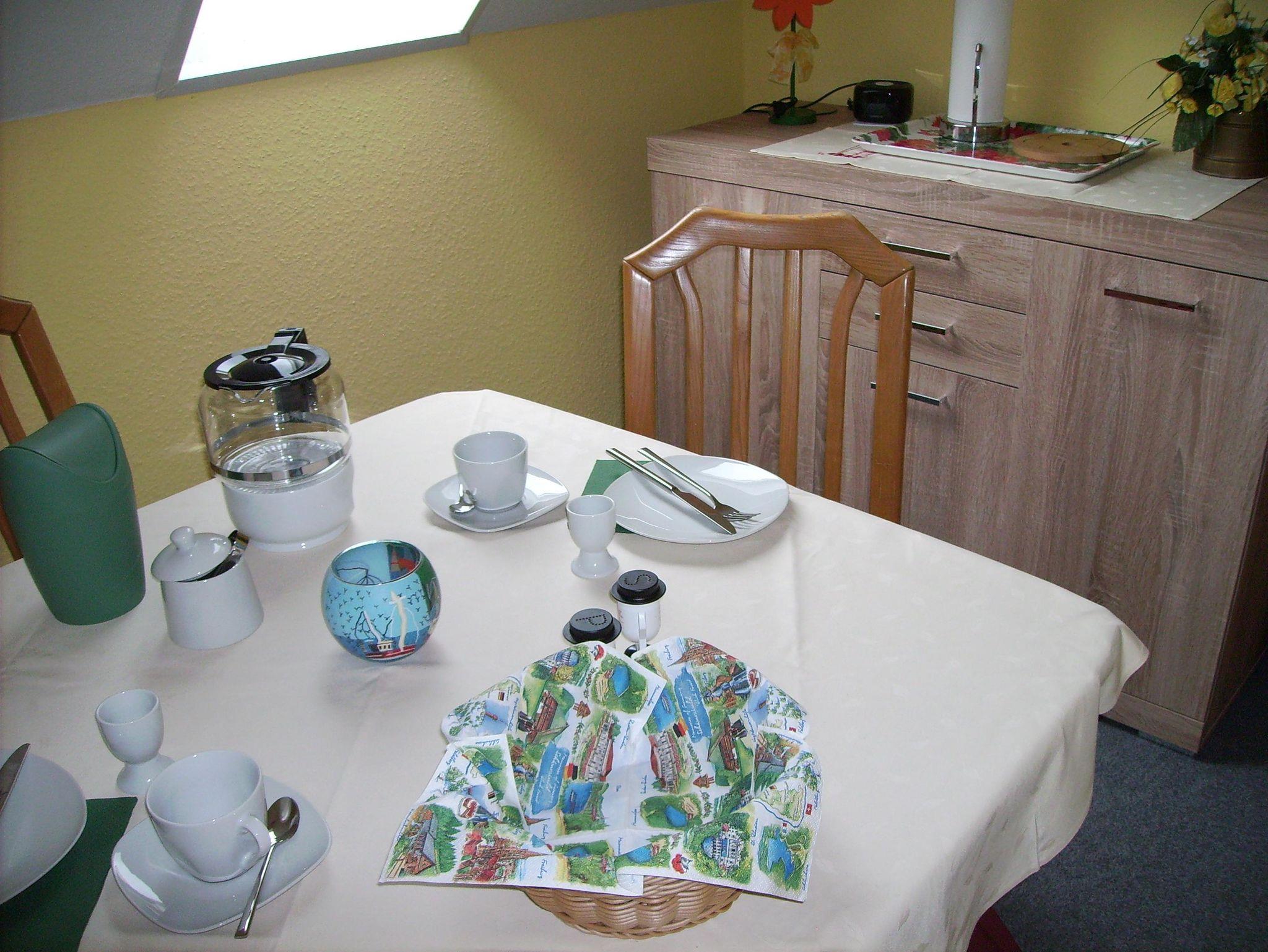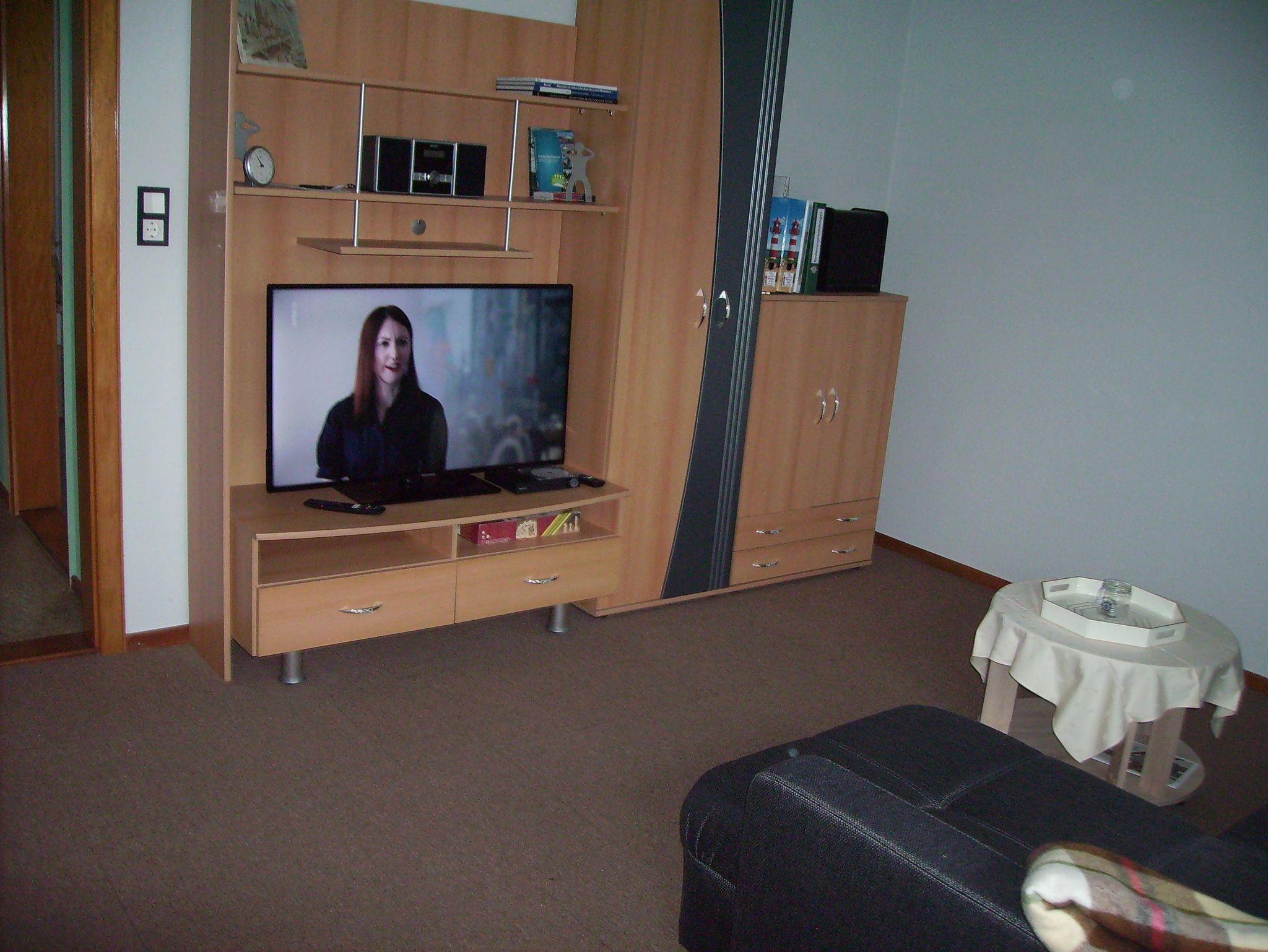 Die Wohnung befindet sich im Obergeschoss. Auf einer Grundfläche von 76qm finden Sie Küche, Schlafzimmer und Wohnzimmer sowie Esszimmer und Bad. Bedingt durch die Bauart des Daches haben die Räume Schrägen. Die Wohnung ist keine ausgebaute Dachwohnung. Das Wohnzimmer ist gemütlich mit einer Couch-Ecke, Farb-TV, DVD-Spieler und einer Midi - Stereoanlage mit CD-Funktion ausgestattet.