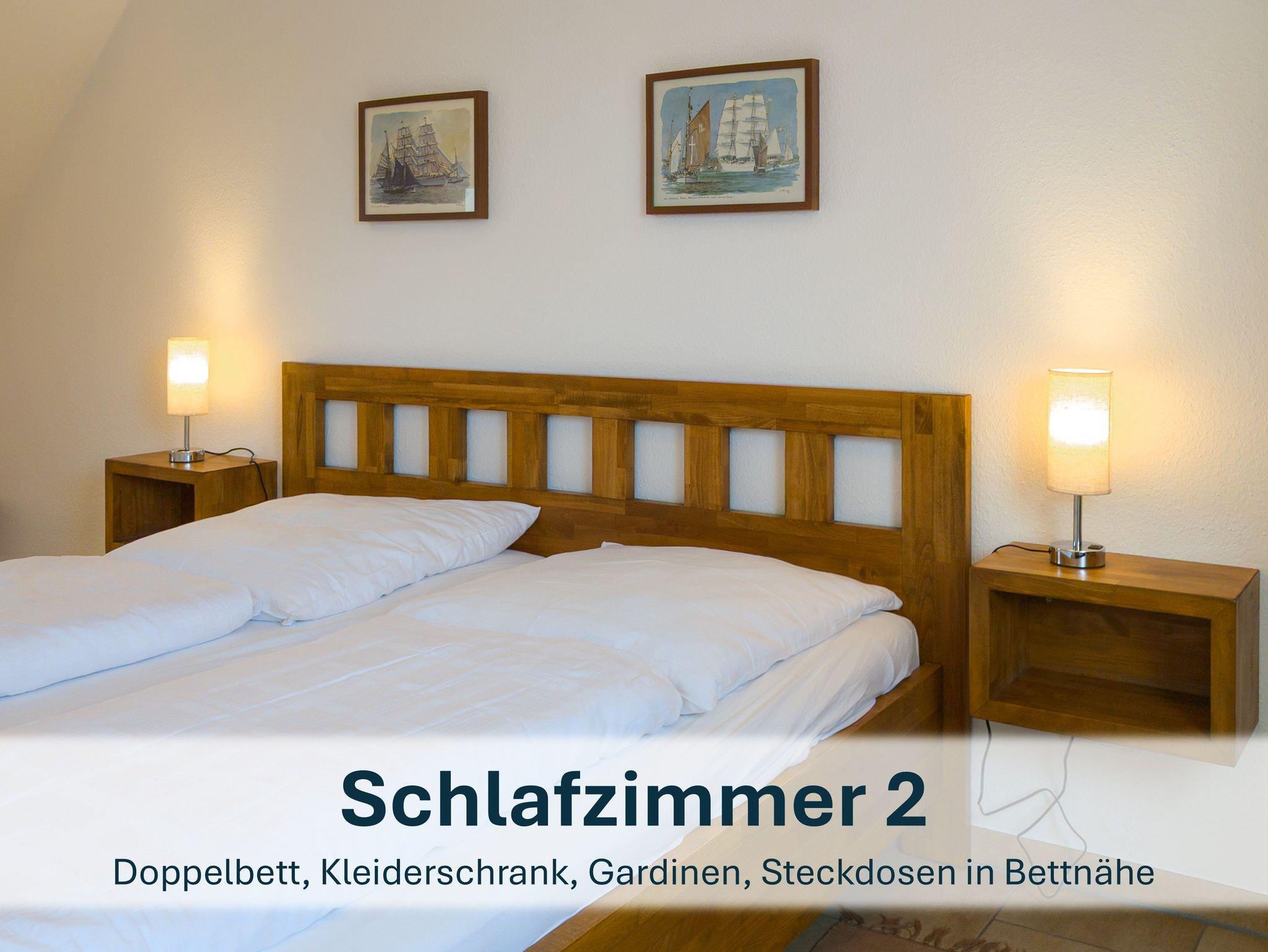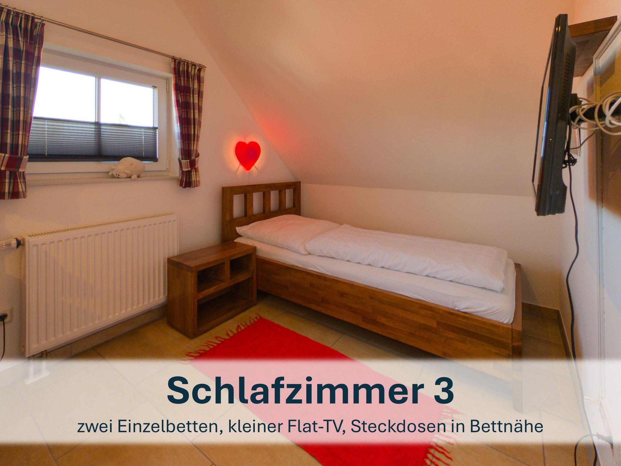 Über die Holztreppe im Flur gelnagen Sie in das Obergeschoss des Hauses.Hier befinden sich zwei weitere Schlafzimmer: ein Kinderzimmer mit zwei Einzelbetten und einem kleinen Schreibtisch, sowie ein Schlafzimmer mit Doppelbett und einer Kommode.