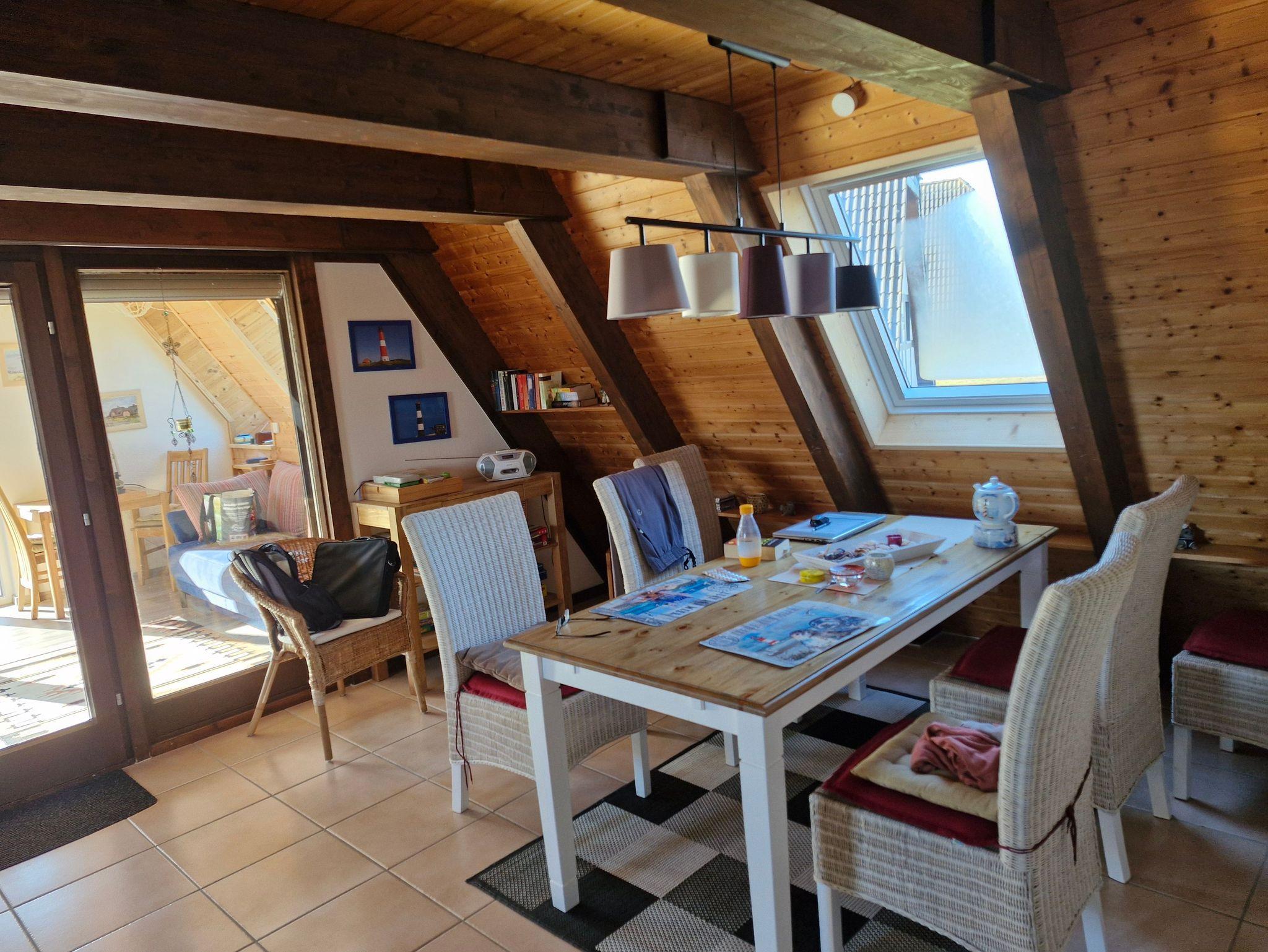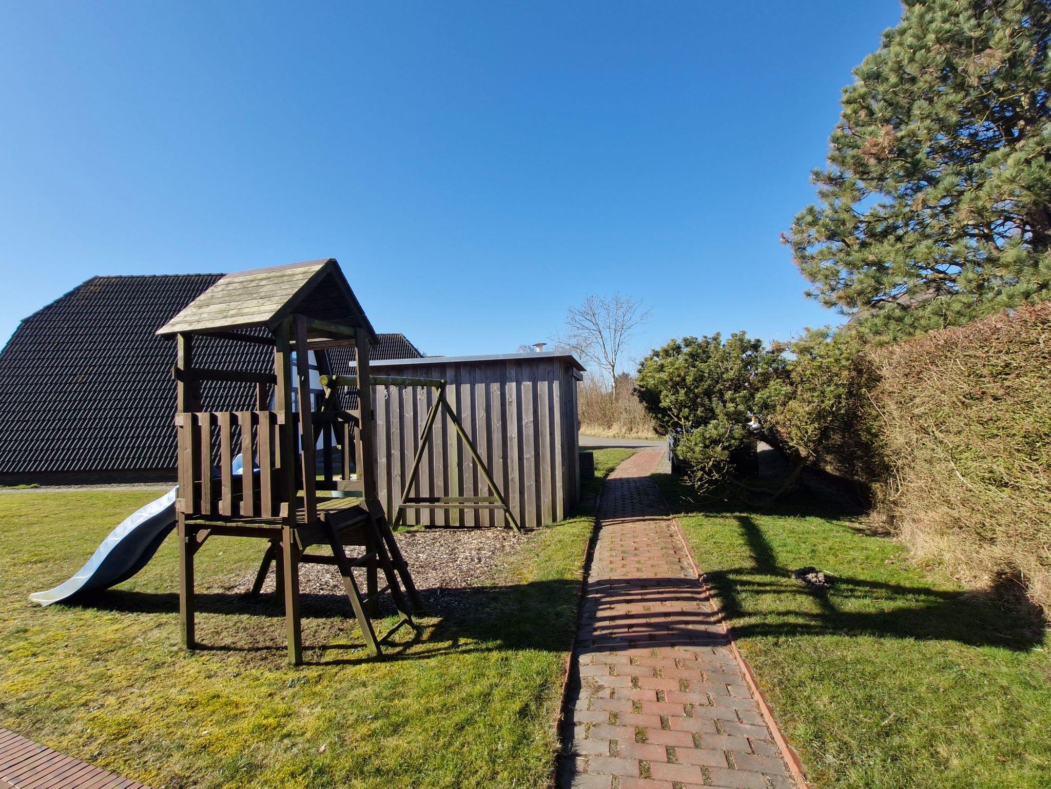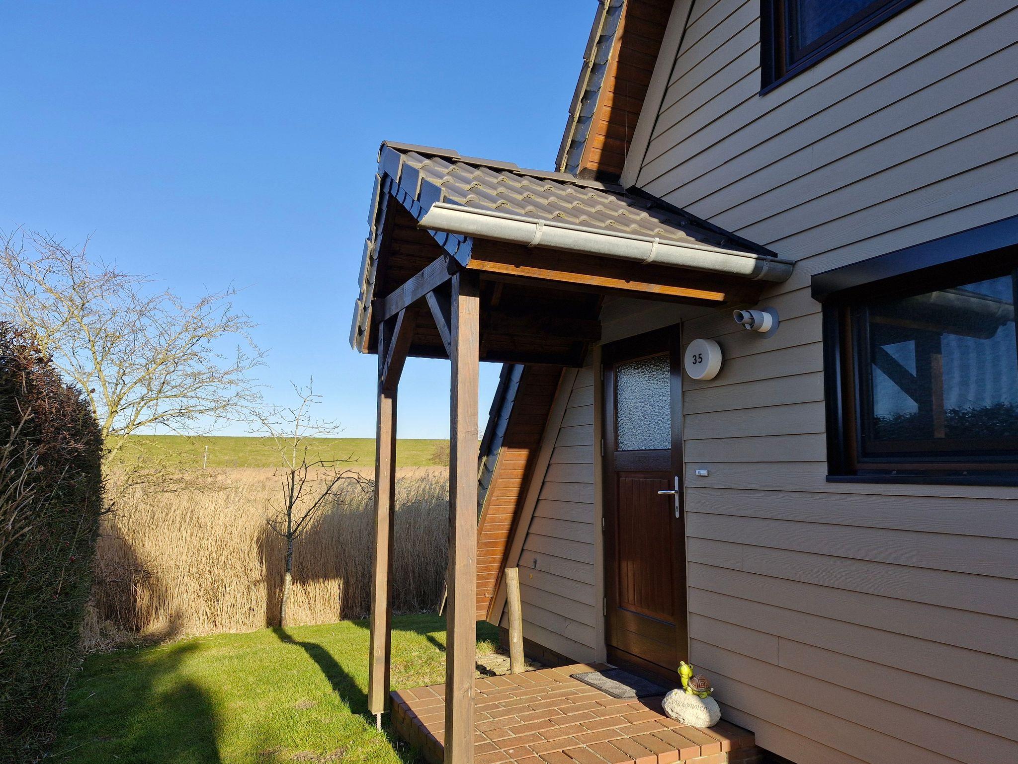 Große Sonnenterrasse mit Blick auf den Deich, Abstellraum und Parkplatz am Haus.