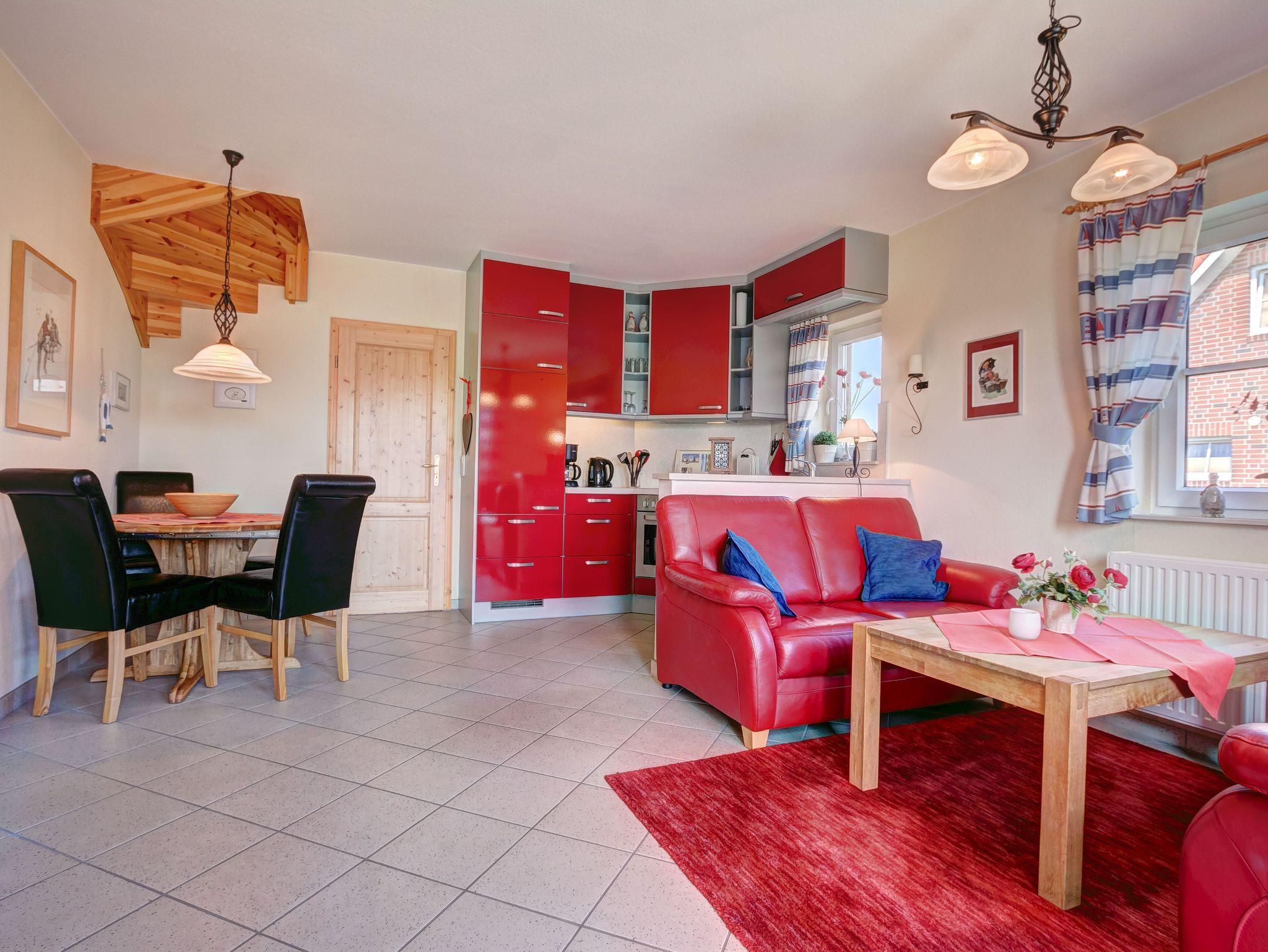 Anschließend an das Wohnzimmer befindet sich eine komplett eingerichtete Küche. Auch erwartet Sie hier eine Terrasse. Genießen Sie beim Frühstücken oder Relaxen die Sonnenstrahlen und die frische Nordseeluft! Aber auch außerhalb der Hautsaison ist das Haus ein idealer Ausgangspunkt für Ihre Erkundungen an der Nordseeküste.