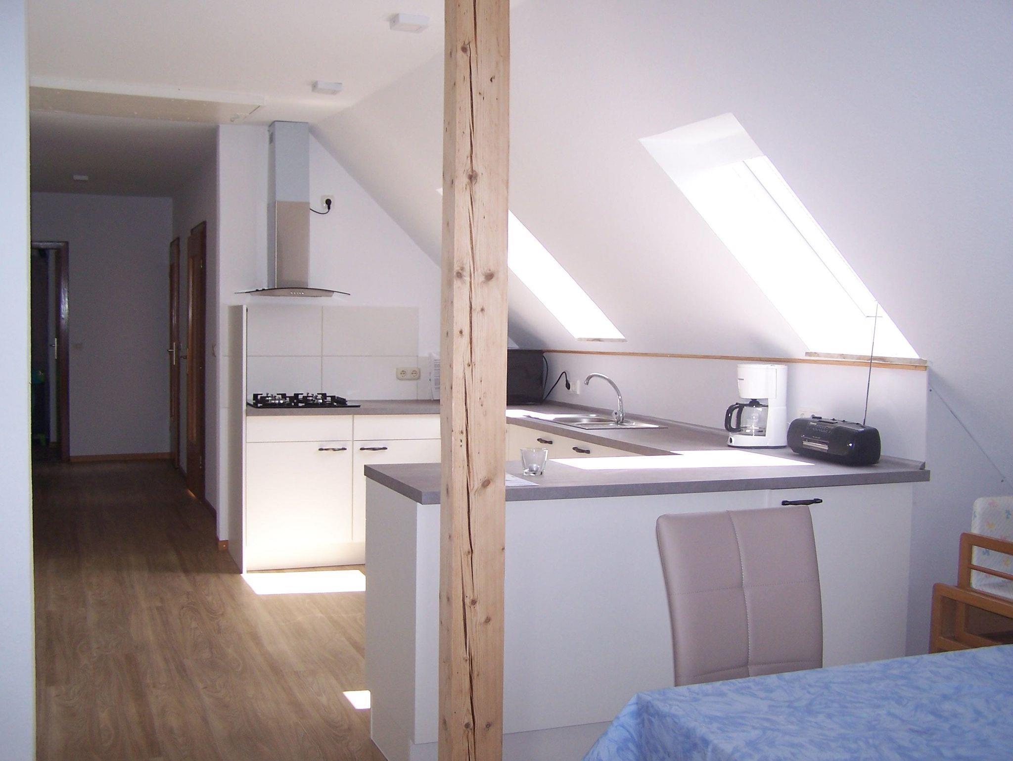 Im Obergeschoss befindet sich die große, neugestaltete Ferienwohnung 1 für bis zu 4 Personen. Sie besteht aus einer großen,hellen Wohnküche, einer gemütliche Wohnecke (Holz-Brennofen, großem Flachbild- TV mit Radio), einer Essecke, eine vollausgestattete Küchenzeile (Gasherd, Mikrowelle mit Heißluft-, Back- und Grillfunktion, Kühlschrank, Geschirrspüler, Kaffeemaschine, Toaster und Wasserkocher) und einem direktem Zugang auf den Süd-Balkon. Zwei Schlafzimmer mit je einem Doppelbett. Ein Bad mit Dusche, WC und Waschtisch und ein separates WC rundet die Wohnung ab.