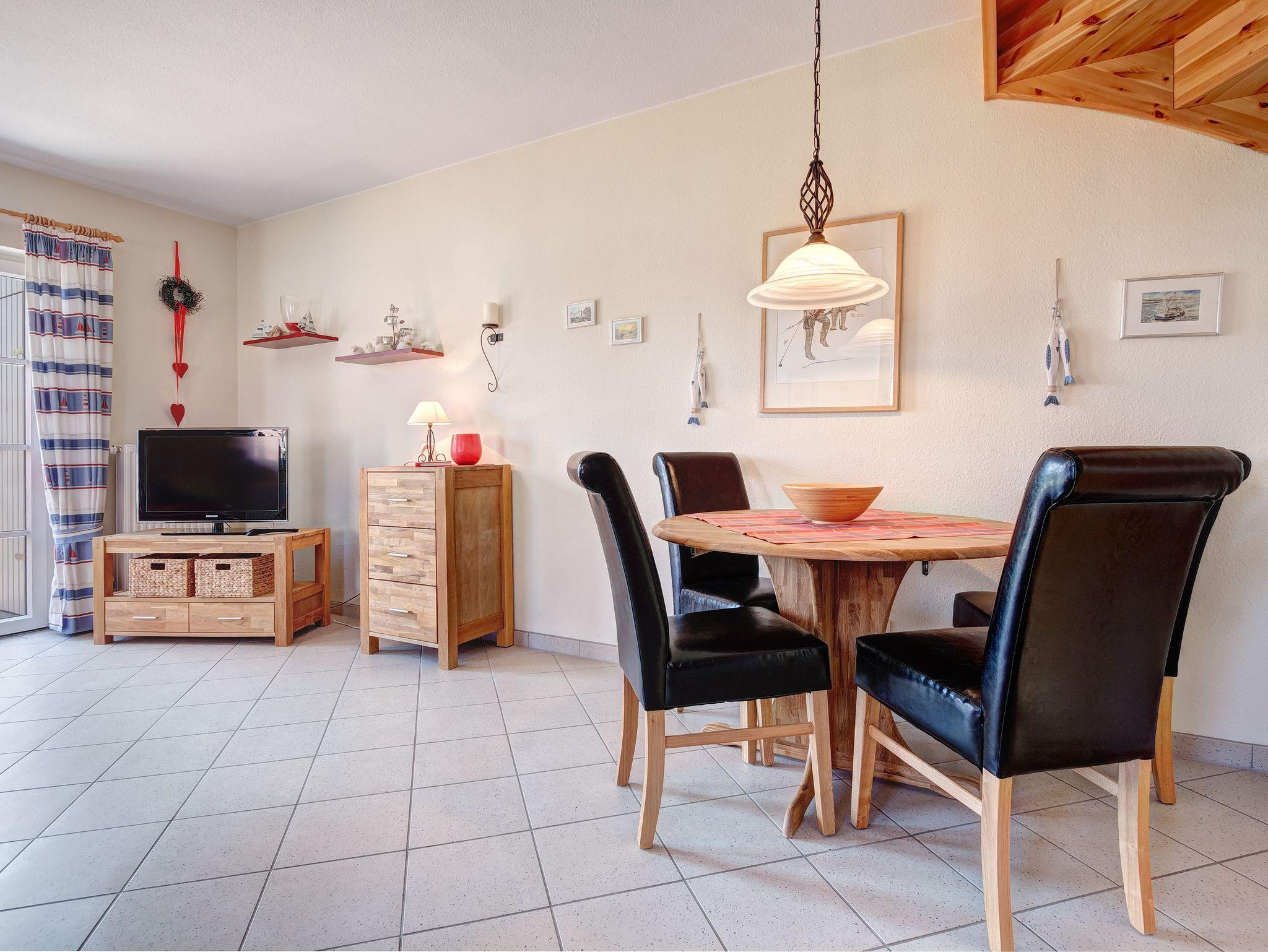 Im Erdgeschoss finden Sie einen hellen Wohnraum mit angeschlossener Küche und Esstisch sowie ein kleines Gäste-WC. Die Schlafräume (einmal mit Doppelbett und Fernseher, einmal kindgerecht und mit Einzelbett ausgestattet) sowie ein Duschbad befinden sich im Obergeschoss. Zusätzlich stehen Ihnen die Sonnenterasse inkl. Gartenmobiliar, ein Abstellraum und ein Parkplatz am Haus zur Verfügung.