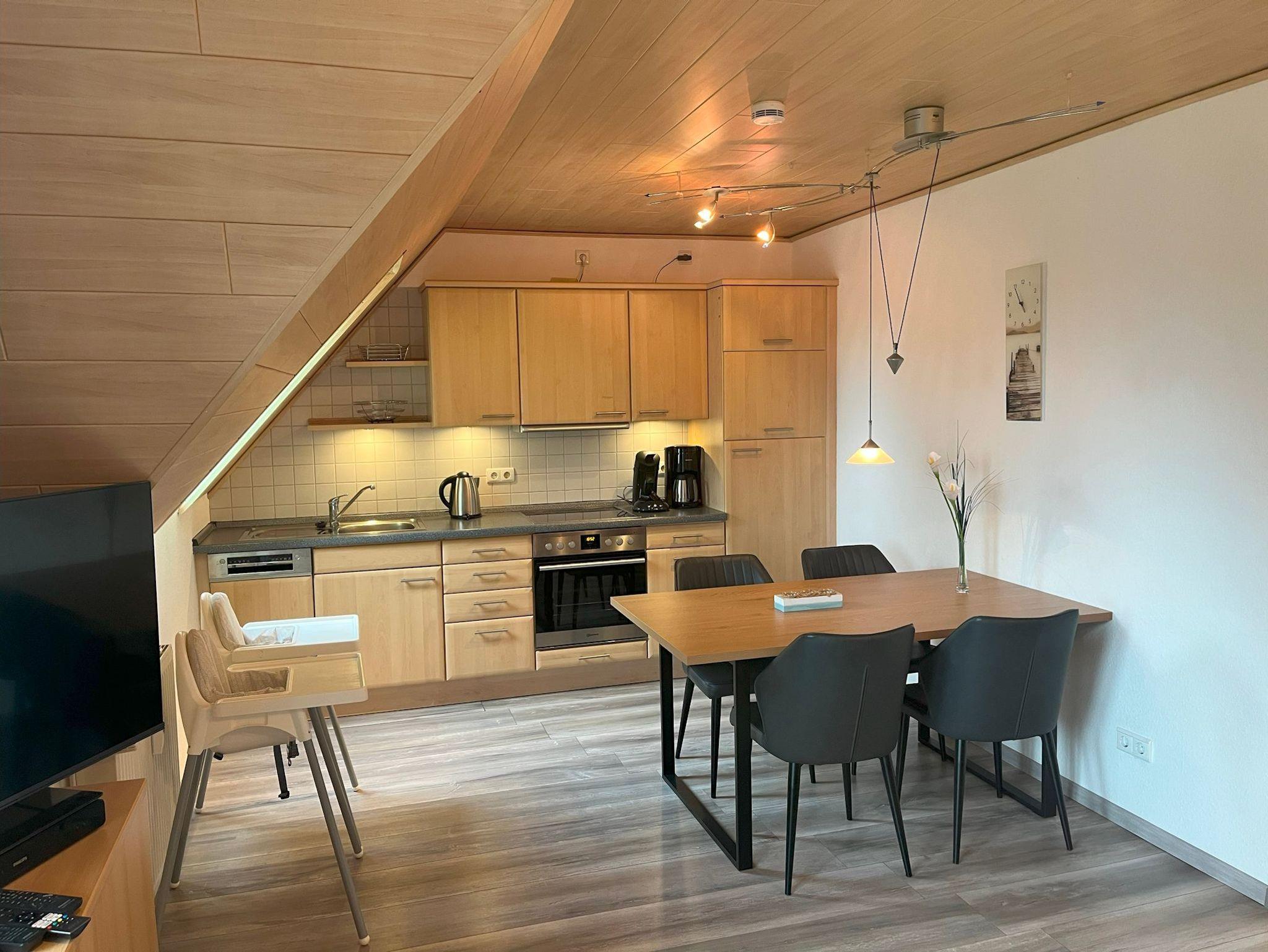 Der gemütliche Essbereich ist mit vier Stühlen und zwei Kinderhochstühlen ausgestattet.